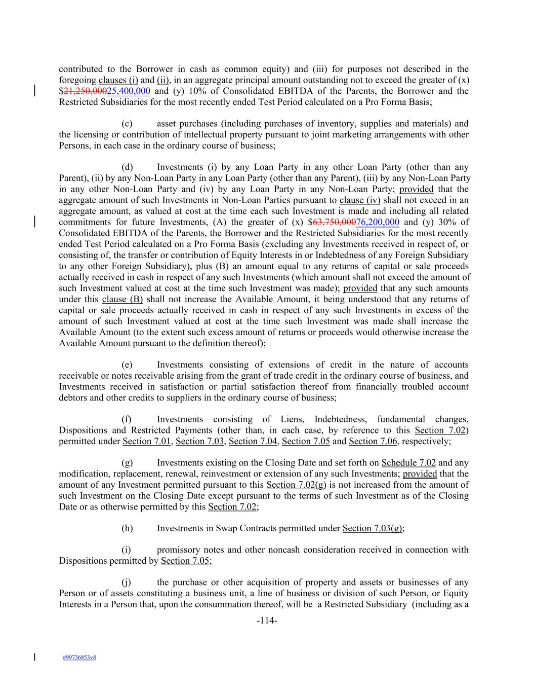 contributed to the Borrower in cash as common equity) and (iii) for purposes not described in the foregoing clauses (i) and (ii), in an aggregate principal amount outstanding not to exceed the greater of (x) $21,250,00025,400,000 and (y) 10% of Consolidated EBITDA of the Parents, the Borrower and the Restricted Subsidiaries for the most recently ended Test Period calculated on a Pro Forma Basis; (c) asset purchases (including purchases of inventory, supplies and materials) and the licensing or contribution of intellectual property pursuant to joint marketing arrangements with other Persons, in each case in the ordinary course of business; (d) Investments (i) by any Loan Party in any other Loan Party (other than any Parent), (ii) by any Non-Loan Party in any Loan Party (other than any Parent), (iii) by any Non-Loan Party in any other Non-Loan Party and (iv) by any Loan Party in any Non-Loan Party; provided that the aggregate amount of such Investments in Non-Loan Parties pursuant to clause (iv) shall not exceed in an aggregate amount, as valued at cost at the time each such Investment is made and including all related commitments for future Investments, (A) the greater of (x) $63,750,00076,200,000 and (y) 30% of Consolidated EBITDA of the Parents, the Borrower and the Restricted Subsidiaries for the most recently ended Test Period calculated on a Pro Forma Basis (excluding any Investments received in respect of, or consisting of, the transfer or contribution of Equity Interests in or Indebtedness of any Foreign Subsidiary to any other Foreign Subsidiary), plus (B) an amount equal to any returns of capital or sale proceeds actually received in cash in respect of any such Investments (which amount shall not exceed the amount of such Investment valued at cost at the time such Investment was made); provided that any such amounts under this clause (B) shall not increase the Available Amount, it being understood that any returns of capital or sale proceeds actually received in cash in respect of any such Investments in excess of the amount of such Investment valued at cost at the time such Investment was made shall increase the Available Amount (to the extent such excess amount of returns or proceeds would otherwise increase the Available Amount pursuant to the definition thereof); (e) Investments consisting of extensions of credit in the nature of accounts receivable or notes receivable arising from the grant of trade credit in the ordinary course of business, and Investments received in satisfaction or partial satisfaction thereof from financially troubled account debtors and other credits to suppliers in the ordinary course of business; (f) Investments consisting of Liens, Indebtedness, fundamental changes, Dispositions and Restricted Payments (other than, in each case, by reference to this Section 7.02) permitted under Section 7.01, Section 7.03, Section 7.04, Section 7.05 and Section 7.06, respectively; (g) Investments existing on the Closing Date and set forth on Schedule 7.02 and any modification, replacement, renewal, reinvestment or extension of any such Investments; provided that the amount of any Investment permitted pursuant to this Section 7.02(g) is not increased from the amount of such Investment on the Closing Date except pursuant to the terms of such Investment as of the Closing Date or as otherwise permitted by this Section 7.02; (h) Investments in Swap Contracts permitted under Section 7.03(g); (i) promissory notes and other noncash consideration received in connection with Dispositions permitted by Section 7.05; (j) the purchase or other acquisition of property and assets or businesses of any Person or of assets constituting a business unit, a line of business or division of such Person, or Equity Interests in a Person that, upon the consummation thereof, will be a Restricted Subsidiary (including as a -114- #99736853v8