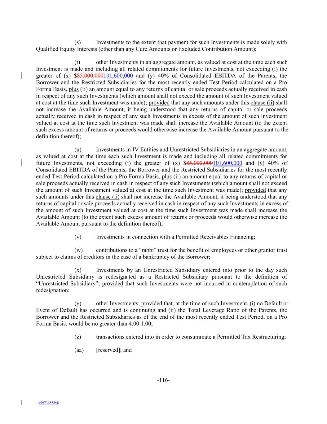 (s) Investments to the extent that payment for such Investments is made solely with Qualified Equity Interests (other than any Cure Amounts or Excluded Contribution Amount); (t) other Investments in an aggregate amount, as valued at cost at the time each such Investment is made and including all related commitments for future Investments, not exceeding (i) the greater of (x) $85,000,000101,600,000 and (y) 40% of Consolidated EBITDA of the Parents, the Borrower and the Restricted Subsidiaries for the most recently ended Test Period calculated on a Pro Forma Basis, plus (ii) an amount equal to any returns of capital or sale proceeds actually received in cash in respect of any such Investments (which amount shall not exceed the amount of such Investment valued at cost at the time such Investment was made); provided that any such amounts under this clause (ii) shall not increase the Available Amount, it being understood that any returns of capital or sale proceeds actually received in cash in respect of any such Investments in excess of the amount of such Investment valued at cost at the time such Investment was made shall increase the Available Amount (to the extent such excess amount of returns or proceeds would otherwise increase the Available Amount pursuant to the definition thereof); (u) Investments in JV Entities and Unrestricted Subsidiaries in an aggregate amount, as valued at cost at the time each such Investment is made and including all related commitments for future Investments, not exceeding (i) the greater of (x) $85,000,000101,600,000 and (y) 40% of Consolidated EBITDA of the Parents, the Borrower and the Restricted Subsidiaries for the most recently ended Test Period calculated on a Pro Forma Basis, plus (ii) an amount equal to any returns of capital or sale proceeds actually received in cash in respect of any such Investments (which amount shall not exceed the amount of such Investment valued at cost at the time such Investment was made); provided that any such amounts under this clause (ii) shall not increase the Available Amount, it being understood that any returns of capital or sale proceeds actually received in cash in respect of any such Investments in excess of the amount of such Investment valued at cost at the time such Investment was made shall increase the Available Amount (to the extent such excess amount of returns or proceeds would otherwise increase the Available Amount pursuant to the definition thereof); (v) Investments in connection with a Permitted Receivables Financing; (w) contributions to a “rabbi” trust for the benefit of employees or other grantor trust subject to claims of creditors in the case of a bankruptcy of the Borrower; (x) Investments by an Unrestricted Subsidiary entered into prior to the day such Unrestricted Subsidiary is redesignated as a Restricted Subsidiary pursuant to the definition of “Unrestricted Subsidiary”; provided that such Investments were not incurred in contemplation of such redesignation; (y) other Investments; provided that, at the time of such Investment, (i) no Default or Event of Default has occurred and is continuing and (ii) the Total Leverage Ratio of the Parents, the Borrower and the Restricted Subsidiaries as of the end of the most recently ended Test Period, on a Pro Forma Basis, would be no greater than 4.00:1.00; (z) transactions entered into in order to consummate a Permitted Tax Restructuring; (aa) [reserved]; and -116- #99736853v8