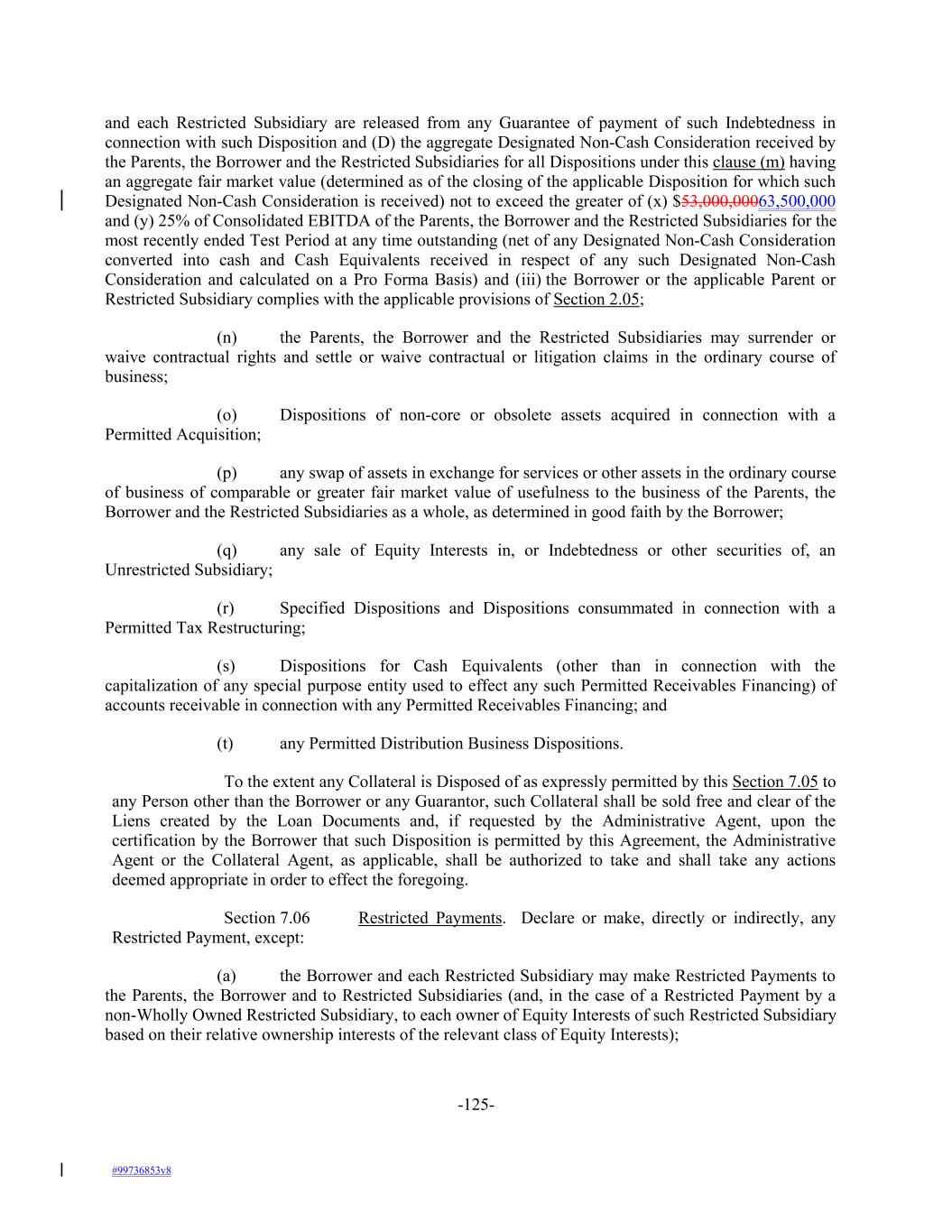 and each Restricted Subsidiary are released from any Guarantee of payment of such Indebtedness in connection with such Disposition and (D) the aggregate Designated Non-Cash Consideration received by the Parents, the Borrower and the Restricted Subsidiaries for all Dispositions under this clause (m) having an aggregate fair market value (determined as of the closing of the applicable Disposition for which such Designated Non-Cash Consideration is received) not to exceed the greater of (x) $53,000,00063,500,000 and (y) 25% of Consolidated EBITDA of the Parents, the Borrower and the Restricted Subsidiaries for the most recently ended Test Period at any time outstanding (net of any Designated Non-Cash Consideration converted into cash and Cash Equivalents received in respect of any such Designated Non-Cash Consideration and calculated on a Pro Forma Basis) and (iii) the Borrower or the applicable Parent or Restricted Subsidiary complies with the applicable provisions of Section 2.05; (n) the Parents, the Borrower and the Restricted Subsidiaries may surrender or waive contractual rights and settle or waive contractual or litigation claims in the ordinary course of business; (o) Dispositions of non-core or obsolete assets acquired in connection with a Permitted Acquisition; (p) any swap of assets in exchange for services or other assets in the ordinary course of business of comparable or greater fair market value of usefulness to the business of the Parents, the Borrower and the Restricted Subsidiaries as a whole, as determined in good faith by the Borrower; (q) any sale of Equity Interests in, or Indebtedness or other securities of, an Unrestricted Subsidiary; (r) Specified Dispositions and Dispositions consummated in connection with a Permitted Tax Restructuring; (s) Dispositions for Cash Equivalents (other than in connection with the capitalization of any special purpose entity used to effect any such Permitted Receivables Financing) of accounts receivable in connection with any Permitted Receivables Financing; and (t) any Permitted Distribution Business Dispositions. To the extent any Collateral is Disposed of as expressly permitted by this Section 7.05 to any Person other than the Borrower or any Guarantor, such Collateral shall be sold free and clear of the Liens created by the Loan Documents and, if requested by the Administrative Agent, upon the certification by the Borrower that such Disposition is permitted by this Agreement, the Administrative Agent or the Collateral Agent, as applicable, shall be authorized to take and shall take any actions deemed appropriate in order to effect the foregoing. Section 7.06 Restricted Payments. Declare or make, directly or indirectly, any Restricted Payment, except: (a) the Borrower and each Restricted Subsidiary may make Restricted Payments to the Parents, the Borrower and to Restricted Subsidiaries (and, in the case of a Restricted Payment by a non-Wholly Owned Restricted Subsidiary, to each owner of Equity Interests of such Restricted Subsidiary based on their relative ownership interests of the relevant class of Equity Interests); -125- #99736853v8