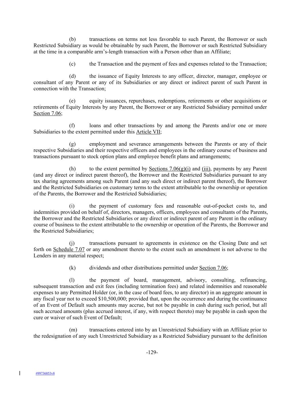 (b) transactions on terms not less favorable to such Parent, the Borrower or such Restricted Subsidiary as would be obtainable by such Parent, the Borrower or such Restricted Subsidiary at the time in a comparable arm’s-length transaction with a Person other than an Affiliate; (c) the Transaction and the payment of fees and expenses related to the Transaction; (d) the issuance of Equity Interests to any officer, director, manager, employee or consultant of any Parent or any of its Subsidiaries or any direct or indirect parent of such Parent in connection with the Transaction; (e) equity issuances, repurchases, redemptions, retirements or other acquisitions or retirements of Equity Interests by any Parent, the Borrower or any Restricted Subsidiary permitted under Section 7.06; (f) loans and other transactions by and among the Parents and/or one or more Subsidiaries to the extent permitted under this Article VII; (g) employment and severance arrangements between the Parents or any of their respective Subsidiaries and their respective officers and employees in the ordinary course of business and transactions pursuant to stock option plans and employee benefit plans and arrangements; (h) to the extent permitted by Sections 7.06(g)(i) and (iii), payments by any Parent (and any direct or indirect parent thereof), the Borrower and the Restricted Subsidiaries pursuant to any tax sharing agreements among such Parent (and any such direct or indirect parent thereof), the Borrower and the Restricted Subsidiaries on customary terms to the extent attributable to the ownership or operation of the Parents, the Borrower and the Restricted Subsidiaries; (i) the payment of customary fees and reasonable out-of-pocket costs to, and indemnities provided on behalf of, directors, managers, officers, employees and consultants of the Parents, the Borrower and the Restricted Subsidiaries or any direct or indirect parent of any Parent in the ordinary course of business to the extent attributable to the ownership or operation of the Parents, the Borrower and the Restricted Subsidiaries; (j) transactions pursuant to agreements in existence on the Closing Date and set forth on Schedule 7.07 or any amendment thereto to the extent such an amendment is not adverse to the Lenders in any material respect; (k) dividends and other distributions permitted under Section 7.06; (l) the payment of board, management, advisory, consulting, refinancing, subsequent transaction and exit fees (including termination fees) and related indemnities and reasonable expenses to any Permitted Holder (or, in the case of board fees, to any director) in an aggregate amount in any fiscal year not to exceed $10,500,000; provided that, upon the occurrence and during the continuance of an Event of Default such amounts may accrue, but not be payable in cash during such period, but all such accrued amounts (plus accrued interest, if any, with respect thereto) may be payable in cash upon the cure or waiver of such Event of Default; (m) transactions entered into by an Unrestricted Subsidiary with an Affiliate prior to the redesignation of any such Unrestricted Subsidiary as a Restricted Subsidiary pursuant to the definition -129- #99736853v8