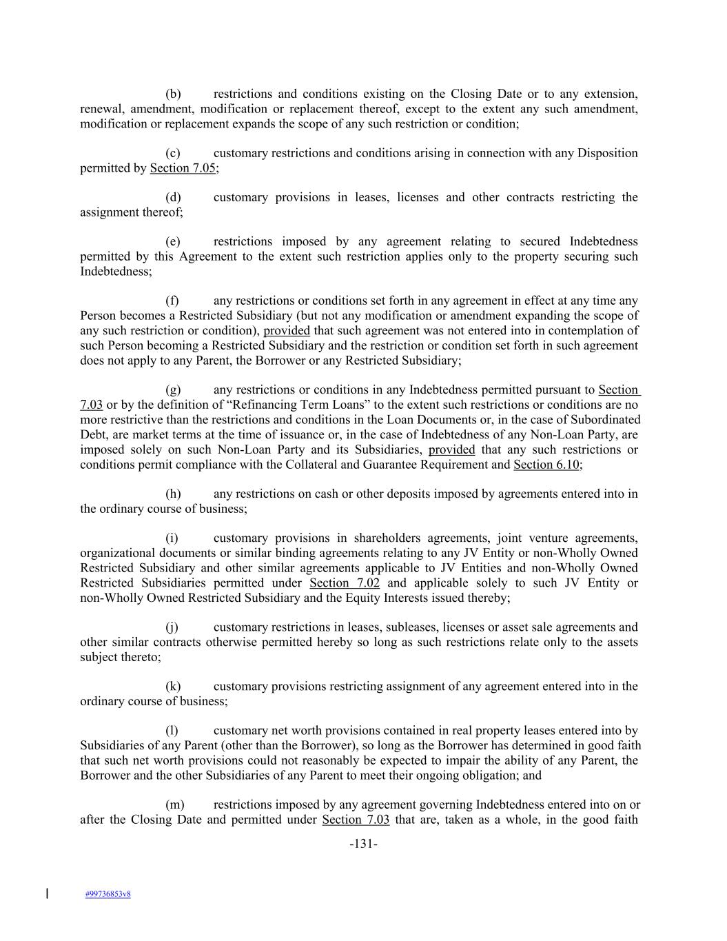 (b) restrictions and conditions existing on the Closing Date or to any extension, renewal, amendment, modification or replacement thereof, except to the extent any such amendment, modification or replacement expands the scope of any such restriction or condition; (c) customary restrictions and conditions arising in connection with any Disposition permitted by Section 7.05; (d) customary provisions in leases, licenses and other contracts restricting the assignment thereof; (e) restrictions imposed by any agreement relating to secured Indebtedness permitted by this Agreement to the extent such restriction applies only to the property securing such Indebtedness; (f) any restrictions or conditions set forth in any agreement in effect at any time any Person becomes a Restricted Subsidiary (but not any modification or amendment expanding the scope of any such restriction or condition), provided that such agreement was not entered into in contemplation of such Person becoming a Restricted Subsidiary and the restriction or condition set forth in such agreement does not apply to any Parent, the Borrower or any Restricted Subsidiary; (g) any restrictions or conditions in any Indebtedness permitted pursuant to Section 7.03 or by the definition of “Refinancing Term Loans” to the extent such restrictions or conditions are no more restrictive than the restrictions and conditions in the Loan Documents or, in the case of Subordinated Debt, are market terms at the time of issuance or, in the case of Indebtedness of any Non-Loan Party, are imposed solely on such Non-Loan Party and its Subsidiaries, provided that any such restrictions or conditions permit compliance with the Collateral and Guarantee Requirement and Section 6.10; (h) any restrictions on cash or other deposits imposed by agreements entered into in the ordinary course of business; (i) customary provisions in shareholders agreements, joint venture agreements, organizational documents or similar binding agreements relating to any JV Entity or non-Wholly Owned Restricted Subsidiary and other similar agreements applicable to JV Entities and non-Wholly Owned Restricted Subsidiaries permitted under Section 7.02 and applicable solely to such JV Entity or non-Wholly Owned Restricted Subsidiary and the Equity Interests issued thereby; (j) customary restrictions in leases, subleases, licenses or asset sale agreements and other similar contracts otherwise permitted hereby so long as such restrictions relate only to the assets subject thereto; (k) customary provisions restricting assignment of any agreement entered into in the ordinary course of business; (l) customary net worth provisions contained in real property leases entered into by Subsidiaries of any Parent (other than the Borrower), so long as the Borrower has determined in good faith that such net worth provisions could not reasonably be expected to impair the ability of any Parent, the Borrower and the other Subsidiaries of any Parent to meet their ongoing obligation; and (m) restrictions imposed by any agreement governing Indebtedness entered into on or after the Closing Date and permitted under Section 7.03 that are, taken as a whole, in the good faith -131- #99736853v8