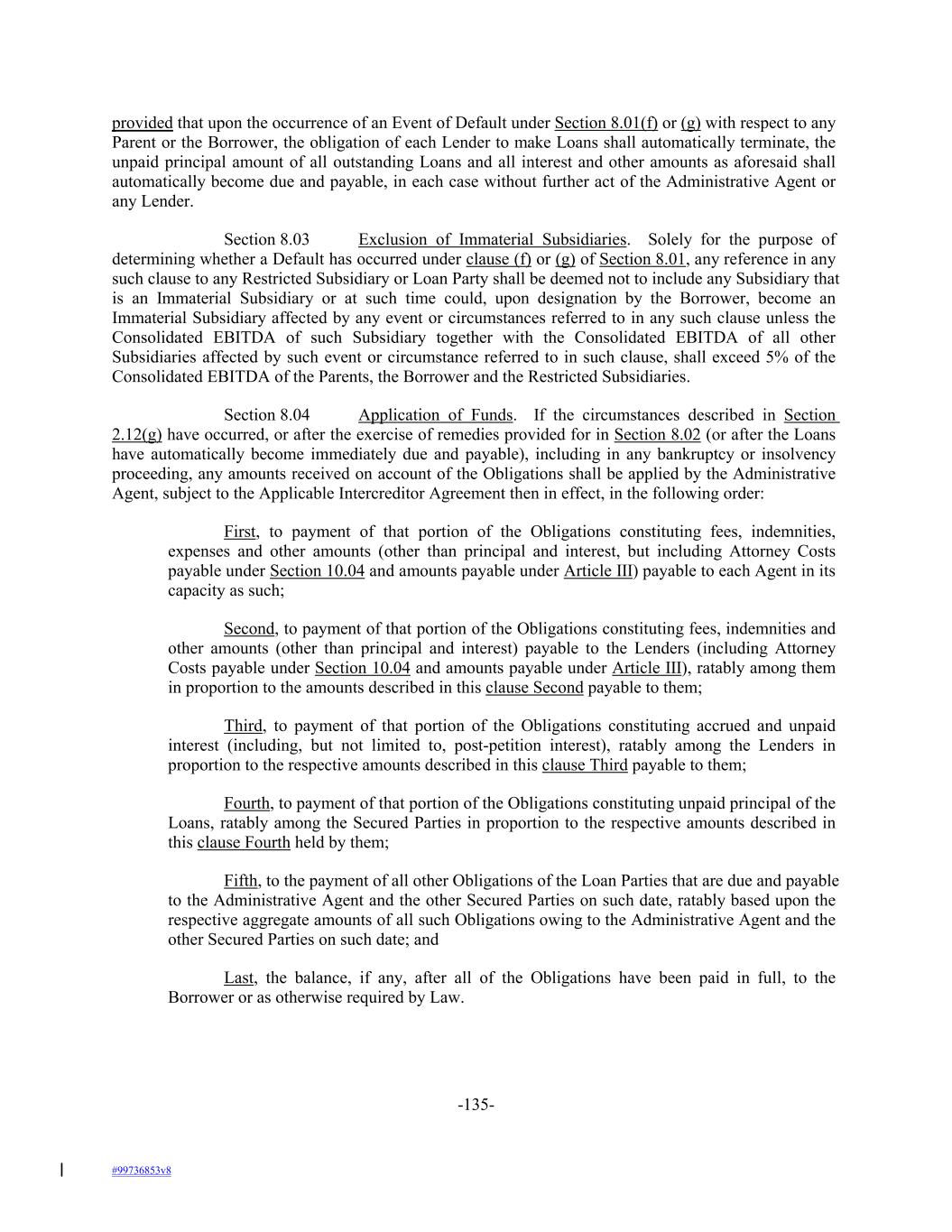 provided that upon the occurrence of an Event of Default under Section 8.01(f) or (g) with respect to any Parent or the Borrower, the obligation of each Lender to make Loans shall automatically terminate, the unpaid principal amount of all outstanding Loans and all interest and other amounts as aforesaid shall automatically become due and payable, in each case without further act of the Administrative Agent or any Lender. Section 8.03 Exclusion of Immaterial Subsidiaries. Solely for the purpose of determining whether a Default has occurred under clause (f) or (g) of Section 8.01, any reference in any such clause to any Restricted Subsidiary or Loan Party shall be deemed not to include any Subsidiary that is an Immaterial Subsidiary or at such time could, upon designation by the Borrower, become an Immaterial Subsidiary affected by any event or circumstances referred to in any such clause unless the Consolidated EBITDA of such Subsidiary together with the Consolidated EBITDA of all other Subsidiaries affected by such event or circumstance referred to in such clause, shall exceed 5% of the Consolidated EBITDA of the Parents, the Borrower and the Restricted Subsidiaries. Section 8.04 Application of Funds. If the circumstances described in Section 2.12(g) have occurred, or after the exercise of remedies provided for in Section 8.02 (or after the Loans have automatically become immediately due and payable), including in any bankruptcy or insolvency proceeding, any amounts received on account of the Obligations shall be applied by the Administrative Agent, subject to the Applicable Intercreditor Agreement then in effect, in the following order: First, to payment of that portion of the Obligations constituting fees, indemnities, expenses and other amounts (other than principal and interest, but including Attorney Costs payable under Section 10.04 and amounts payable under Article III) payable to each Agent in its capacity as such; Second, to payment of that portion of the Obligations constituting fees, indemnities and other amounts (other than principal and interest) payable to the Lenders (including Attorney Costs payable under Section 10.04 and amounts payable under Article III), ratably among them in proportion to the amounts described in this clause Second payable to them; Third, to payment of that portion of the Obligations constituting accrued and unpaid interest (including, but not limited to, post-petition interest), ratably among the Lenders in proportion to the respective amounts described in this clause Third payable to them; Fourth, to payment of that portion of the Obligations constituting unpaid principal of the Loans, ratably among the Secured Parties in proportion to the respective amounts described in this clause Fourth held by them; Fifth, to the payment of all other Obligations of the Loan Parties that are due and payable to the Administrative Agent and the other Secured Parties on such date, ratably based upon the respective aggregate amounts of all such Obligations owing to the Administrative Agent and the other Secured Parties on such date; and Last, the balance, if any, after all of the Obligations have been paid in full, to the Borrower or as otherwise required by Law. -135- #99736853v8