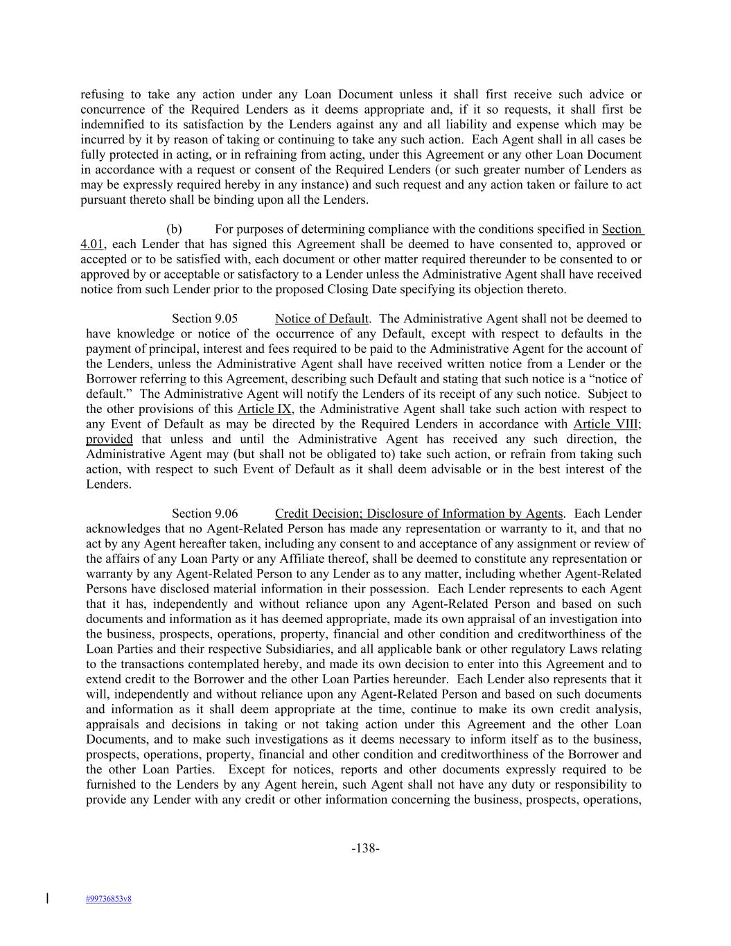refusing to take any action under any Loan Document unless it shall first receive such advice or concurrence of the Required Lenders as it deems appropriate and, if it so requests, it shall first be indemnified to its satisfaction by the Lenders against any and all liability and expense which may be incurred by it by reason of taking or continuing to take any such action. Each Agent shall in all cases be fully protected in acting, or in refraining from acting, under this Agreement or any other Loan Document in accordance with a request or consent of the Required Lenders (or such greater number of Lenders as may be expressly required hereby in any instance) and such request and any action taken or failure to act pursuant thereto shall be binding upon all the Lenders. (b) For purposes of determining compliance with the conditions specified in Section 4.01, each Lender that has signed this Agreement shall be deemed to have consented to, approved or accepted or to be satisfied with, each document or other matter required thereunder to be consented to or approved by or acceptable or satisfactory to a Lender unless the Administrative Agent shall have received notice from such Lender prior to the proposed Closing Date specifying its objection thereto. Section 9.05 Notice of Default. The Administrative Agent shall not be deemed to have knowledge or notice of the occurrence of any Default, except with respect to defaults in the payment of principal, interest and fees required to be paid to the Administrative Agent for the account of the Lenders, unless the Administrative Agent shall have received written notice from a Lender or the Borrower referring to this Agreement, describing such Default and stating that such notice is a “notice of default.” The Administrative Agent will notify the Lenders of its receipt of any such notice. Subject to the other provisions of this Article IX, the Administrative Agent shall take such action with respect to any Event of Default as may be directed by the Required Lenders in accordance with Article VIII; provided that unless and until the Administrative Agent has received any such direction, the Administrative Agent may (but shall not be obligated to) take such action, or refrain from taking such action, with respect to such Event of Default as it shall deem advisable or in the best interest of the Lenders. Section 9.06 Credit Decision; Disclosure of Information by Agents. Each Lender acknowledges that no Agent-Related Person has made any representation or warranty to it, and that no act by any Agent hereafter taken, including any consent to and acceptance of any assignment or review of the affairs of any Loan Party or any Affiliate thereof, shall be deemed to constitute any representation or warranty by any Agent-Related Person to any Lender as to any matter, including whether Agent-Related Persons have disclosed material information in their possession. Each Lender represents to each Agent that it has, independently and without reliance upon any Agent-Related Person and based on such documents and information as it has deemed appropriate, made its own appraisal of an investigation into the business, prospects, operations, property, financial and other condition and creditworthiness of the Loan Parties and their respective Subsidiaries, and all applicable bank or other regulatory Laws relating to the transactions contemplated hereby, and made its own decision to enter into this Agreement and to extend credit to the Borrower and the other Loan Parties hereunder. Each Lender also represents that it will, independently and without reliance upon any Agent-Related Person and based on such documents and information as it shall deem appropriate at the time, continue to make its own credit analysis, appraisals and decisions in taking or not taking action under this Agreement and the other Loan Documents, and to make such investigations as it deems necessary to inform itself as to the business, prospects, operations, property, financial and other condition and creditworthiness of the Borrower and the other Loan Parties. Except for notices, reports and other documents expressly required to be furnished to the Lenders by any Agent herein, such Agent shall not have any duty or responsibility to provide any Lender with any credit or other information concerning the business, prospects, operations, -138- #99736853v8