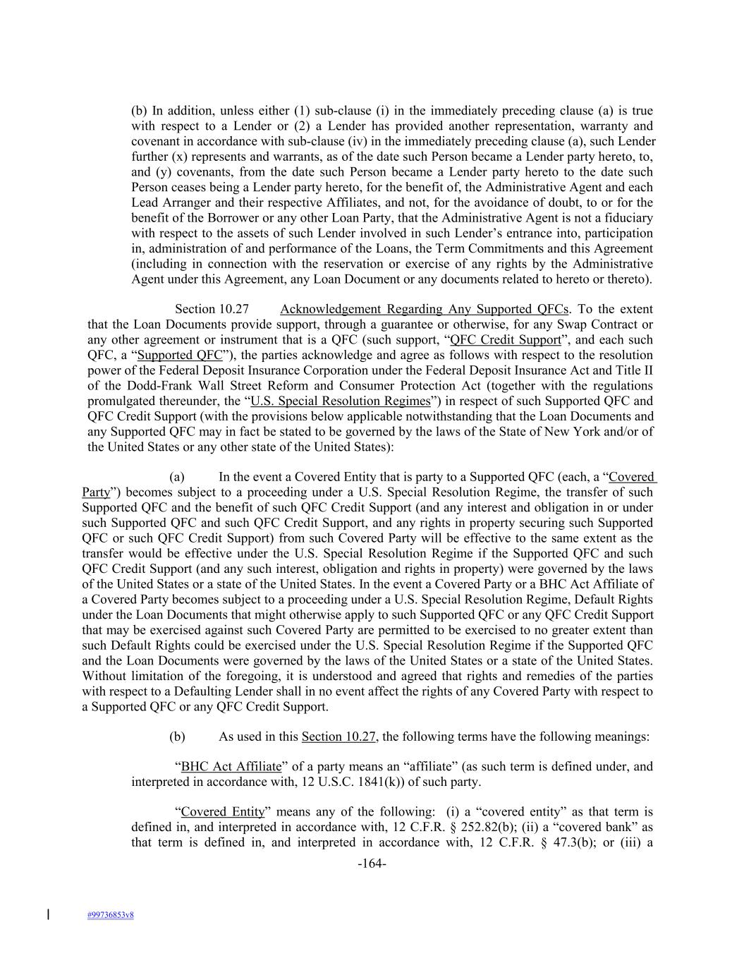 (b) In addition, unless either (1) sub-clause (i) in the immediately preceding clause (a) is true with respect to a Lender or (2) a Lender has provided another representation, warranty and covenant in accordance with sub-clause (iv) in the immediately preceding clause (a), such Lender further (x) represents and warrants, as of the date such Person became a Lender party hereto, to, and (y) covenants, from the date such Person became a Lender party hereto to the date such Person ceases being a Lender party hereto, for the benefit of, the Administrative Agent and each Lead Arranger and their respective Affiliates, and not, for the avoidance of doubt, to or for the benefit of the Borrower or any other Loan Party, that the Administrative Agent is not a fiduciary with respect to the assets of such Lender involved in such Lender’s entrance into, participation in, administration of and performance of the Loans, the Term Commitments and this Agreement (including in connection with the reservation or exercise of any rights by the Administrative Agent under this Agreement, any Loan Document or any documents related to hereto or thereto). Section 10.27 Acknowledgement Regarding Any Supported QFCs. To the extent that the Loan Documents provide support, through a guarantee or otherwise, for any Swap Contract or any other agreement or instrument that is a QFC (such support, “QFC Credit Support”, and each such QFC, a “Supported QFC”), the parties acknowledge and agree as follows with respect to the resolution power of the Federal Deposit Insurance Corporation under the Federal Deposit Insurance Act and Title II of the Dodd-Frank Wall Street Reform and Consumer Protection Act (together with the regulations promulgated thereunder, the “U.S. Special Resolution Regimes”) in respect of such Supported QFC and QFC Credit Support (with the provisions below applicable notwithstanding that the Loan Documents and any Supported QFC may in fact be stated to be governed by the laws of the State of New York and/or of the United States or any other state of the United States): (a) In the event a Covered Entity that is party to a Supported QFC (each, a “Covered Party”) becomes subject to a proceeding under a U.S. Special Resolution Regime, the transfer of such Supported QFC and the benefit of such QFC Credit Support (and any interest and obligation in or under such Supported QFC and such QFC Credit Support, and any rights in property securing such Supported QFC or such QFC Credit Support) from such Covered Party will be effective to the same extent as the transfer would be effective under the U.S. Special Resolution Regime if the Supported QFC and such QFC Credit Support (and any such interest, obligation and rights in property) were governed by the laws of the United States or a state of the United States. In the event a Covered Party or a BHC Act Affiliate of a Covered Party becomes subject to a proceeding under a U.S. Special Resolution Regime, Default Rights under the Loan Documents that might otherwise apply to such Supported QFC or any QFC Credit Support that may be exercised against such Covered Party are permitted to be exercised to no greater extent than such Default Rights could be exercised under the U.S. Special Resolution Regime if the Supported QFC and the Loan Documents were governed by the laws of the United States or a state of the United States. Without limitation of the foregoing, it is understood and agreed that rights and remedies of the parties with respect to a Defaulting Lender shall in no event affect the rights of any Covered Party with respect to a Supported QFC or any QFC Credit Support. (b) As used in this Section 10.27, the following terms have the following meanings: “BHC Act Affiliate” of a party means an “affiliate” (as such term is defined under, and interpreted in accordance with, 12 U.S.C. 1841(k)) of such party. “Covered Entity” means any of the following: (i) a “covered entity” as that term is defined in, and interpreted in accordance with, 12 C.F.R. § 252.82(b); (ii) a “covered bank” as that term is defined in, and interpreted in accordance with, 12 C.F.R. § 47.3(b); or (iii) a -164- #99736853v8