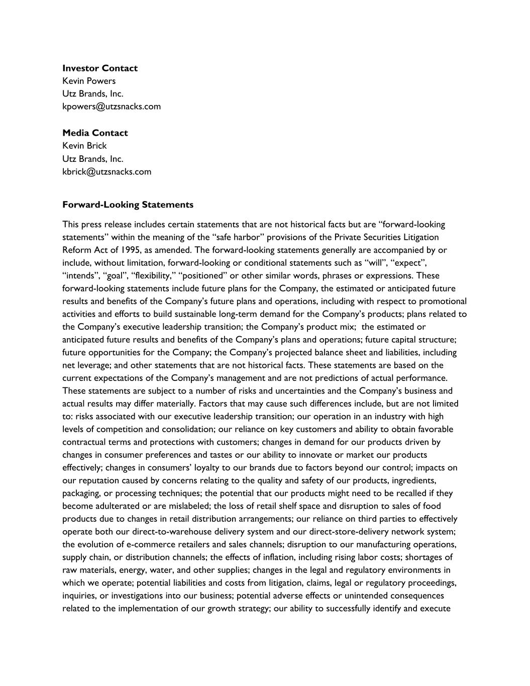 Investor Contact Kevin Powers Utz Brands, Inc. kpowers@utzsnacks.com Media Contact Kevin Brick Utz Brands, Inc. kbrick@utzsnacks.com Forward-Looking Statements This press release includes certain statements that are not historical facts but are “forward-looking statements” within the meaning of the “safe harbor” provisions of the Private Securities Litigation Reform Act of 1995, as amended. The forward-looking statements generally are accompanied by or include, without limitation, forward-looking or conditional statements such as “will”, “expect”, “intends”, “goal”, “flexibility,” “positioned” or other similar words, phrases or expressions. These forward-looking statements include future plans for the Company, the estimated or anticipated future results and benefits of the Company’s future plans and operations, including with respect to promotional activities and efforts to build sustainable long-term demand for the Company’s products; plans related to the Company’s executive leadership transition; the Company’s product mix; the estimated or anticipated future results and benefits of the Company’s plans and operations; future capital structure; future opportunities for the Company; the Company’s projected balance sheet and liabilities, including net leverage; and other statements that are not historical facts. These statements are based on the current expectations of the Company’s management and are not predictions of actual performance. These statements are subject to a number of risks and uncertainties and the Company’s business and actual results may differ materially. Factors that may cause such differences include, but are not limited to: risks associated with our executive leadership transition; our operation in an industry with high levels of competition and consolidation; our reliance on key customers and ability to obtain favorable contractual terms and protections with customers; changes in demand for our products driven by changes in consumer preferences and tastes or our ability to innovate or market our products effectively; changes in consumers’ loyalty to our brands due to factors beyond our control; impacts on our reputation caused by concerns relating to the quality and safety of our products, ingredients, packaging, or processing techniques; the potential that our products might need to be recalled if they become adulterated or are mislabeled; the loss of retail shelf space and disruption to sales of food products due to changes in retail distribution arrangements; our reliance on third parties to effectively operate both our direct-to-warehouse delivery system and our direct-store-delivery network system; the evolution of e-commerce retailers and sales channels; disruption to our manufacturing operations, supply chain, or distribution channels; the effects of inflation, including rising labor costs; shortages of raw materials, energy, water, and other supplies; changes in the legal and regulatory environments in which we operate; potential liabilities and costs from litigation, claims, legal or regulatory proceedings, inquiries, or investigations into our business; potential adverse effects or unintended consequences related to the implementation of our growth strategy; our ability to successfully identify and execute