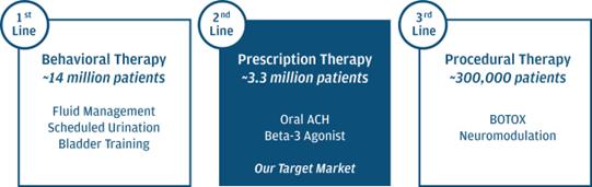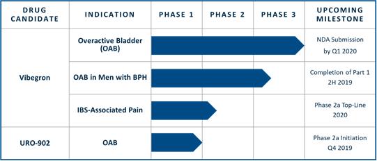 In March 2019, we reported positive top-line results from our international pivotal Phase 3 EMPOWUR trial evaluating vibegron for the treatment of OAB. In this pivotal Phase 3 clinical trial with over 1,500 patients, vibegron 75 mg met both co-primary efficacy endpoints and all seven key secondary endpoints. Onset of action for the co-primary endpoints was observed as early as week two, the first time point measured, and statistically significant efficacy was maintained at all timepoints measured through the end of the study. We plan to submit a new drug application, or NDA, to the U.S. Food and Drug Administration, or FDA, by the first quarter of 2020. OAB is a highly prevalent condition, with more than 30 million Americans over the age of 40 suffering from bothersome symptoms. In large, randomized, placebo-controlled, international Phase 2b and Japanese Phase 3 clinical trials in a total of over 2,600 OAB patients, vibegron 50 mg and 100 mg met all primary and secondary efficacy endpoints compared to placebo at week 8 and week 12, respectively. Our Phase 3 clinical trial had a design in line with these clinical trials. We believe vibegron, if approved by the FDA, may offer a differentiated profile compared to current OAB therapies, including the potential for broader efficacy claims if the FDA approves the inclusion of urgency data, rapid onset of action data, and a single convenient once-daily dose in the label. Vibegron has been well tolerated in all clinical trials to date, has not been associated with clinically relevant drug-drug interactions, such as the inhibition of CYP2D6, and has not demonstrated a QTc signal at any of the human doses tested.