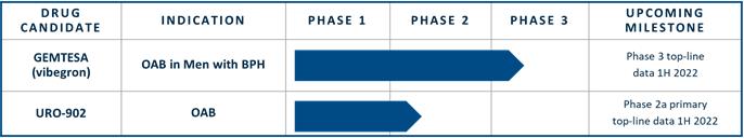 This Quarterly Report on Form 10-Q contains “forward-looking statements” within the meaning of Section 27A of the Securities Act of 1933, as amended (the “Securities Act”), and Section 21E of the Securities Exchange Act of 1934, as amended (the “Exchange Act”). These statements are often identified by the use of words such as “anticipate,” “believe,” “can,” “continue,” “could,” “estimate,” “expect,” “intend,” “likely,” “may,” “might,” “objective,” “ongoing,” “plan,” “potential,” “predict,” “project,” “should,” “to be,” “will,” “would,” or the negative or plural of these words, or similar expressions or variations, although not all forward-looking statements contain these words. Examples of forward-looking statements included in this Quarterly Report on Form 10-Q include statements concerning future matters such as our expected liquidity, the commercialization of our lead product GEMTESA (vibegron), the development of our product candidate, URO-902, our expense levels, expectations regarding the outcome of legal proceedings and other statements regarding matters that are not historical are forward-looking statements. We cannot assure you that the events and circumstances reflected in the forward-looking statements will be achieved or occur, and actual results could differ materially from those expressed or implied by these forward-looking statements.