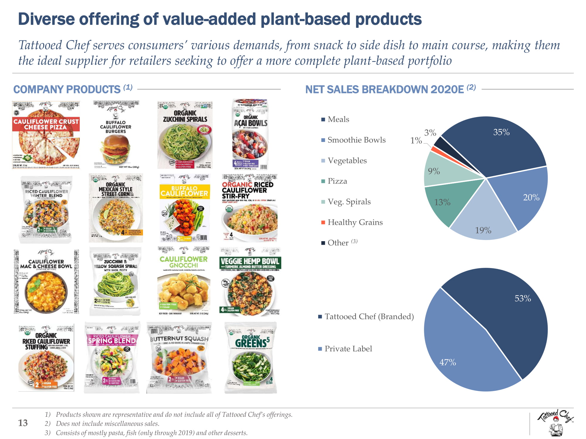 Prepared Foods $17.8 Pizza $4.9 Vegetables $3.1 Fruits $1.1 Pasta, Rice & Grains $0.2 Desserts $12.6 Meats (incl. Meat Alternatives) $6.8 Seafood $5.0 Others $3.7 Massive opportunity to disrupt the $55bn U.S. Frozen Food category 1) CY 2019, Nielsen xAOC + Conv. 2) 2019 Food & Health Survey. International Food Information Council 2019. 3) Grand View Research. 12 Plant - based products are gaining share across multiple segments within the frozen food category 2019 U.S. FROZEN RETAIL SALES (1) : $55.2bn Tattooed Chef’s Current Opportunity: $27.1bn Tattooed Chef’s Long - Term Opportunity: $15.5bn o The growth in the frozen food category has been primarily driven by the recent product innovation as a response to the growing demand for great tasting, clean label and convenient options o The overall frozen food category outpaced the general center of store food categories (1) o Millennials and Gen Z are driving growth in the frozen foods section due to convenience, frozen fresh and plant - based foods – The number of consumers who say convenience had a significant impact on their food purchase decision has grown from 49% in 2017 to 57% in 2019 (2) o Longer term opportunity to penetrate the $380 billion global frozen food market (3) Tattooed Chef’s Near - Term Opportunity: $12.6bn