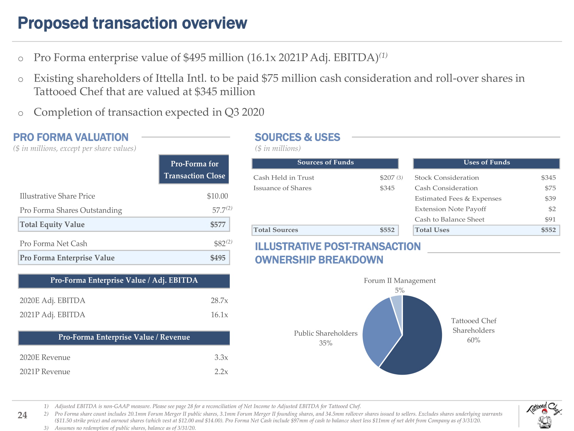 Disclaimer This investor presentation (this “presentation”) is for informational purposes only and has been prepared to assist parties i n m aking their own evaluation with respect to the proposed transaction (the “Business Combination”) between Ittella Internationa l (“Ittella” or “Tattooed Chef”) and Forum Merger II Corporation (“Forum”) contemplated by that certain agreement and plan of m erg er (the “Merger Agreement”), by and among Forum, MYJOJO, INC. and the other parties thereto and for no other purpose. It is not intended to form the basis of any investment decision or any other decisions with respect to the Business Co mbination. No Representation or Warranty. No representation or warranty, express or implied, is or will be given by Forum or Ittella or any of their respective affiliates, directors, officers, employees, advisers or any other person as to the accuracy or completene ss of the information in this presentation or any other written, oral or other communications transmitted or otherwise made availab le to any party in the course of its evaluation of the Business Combination, and no responsibility or liability whatsoever is accepted for the accuracy or sufficiency thereof or for any errors, omissions or misstatements, negligent or otherwise, relat ing thereto. This presentation does not purport to contain all of the information that may be required to evaluate a possible investment decision with respect to Forum, and does not constitute investment, tax or legal advice. The recipient also acknow led ges and agrees that the information contained in this presentation is preliminary in nature and is subject to change, and any such changes may be material. Forum and Ittella disclaim any duty to update the information contained in this presentation. An y and all trademarks and trade names referred to in this presentation are the property of their respective owners. Forward - Looking Statements. This presentation contains “forward looking statements” within the meaning of the Private Securities Litigation Reform Act of 1995. Forward - looking statements include, without limitation, statements regarding the estimated future financial performance, financial position and financial impacts of the Business Combination, satisfaction of cl osing conditions to the Business Combination, the level of redemption by Forum’s public stockholders and purchase price adjustments in connection with the Business Combination, the timing of the completion of the Business Combination, the antici pat ed Adjusted EBITDA of the combined company following the Business Combination, anticipated ownership percentages of the combined company’s stockholders following the Business Combination, and the business strategy, plans and objectives of ma nag ement for future operations, including as they relate to the potential Business Combination. Such statements may be identified by the use of words such as “anticipate,” “believe,” “expect,” “estimate,” “plan,” “outlook,” and “project” and ot her similar expressions that predict or indicate future events or trends or that are not statements of historical matters, but th e absence of these words does not mean that a statement is not forward - looking. When Forum discusses its strategies or plans, incl uding as they relate to the Business Combination, it is making projections, forecasts and forward looking statements. Such statements are based on the beliefs of, as well as assumptions made by and information currently available to, Forum’s manage men t. These forward - looking statements involve significant risk and uncertainties that could cause actual results to differ materially from the expected result. Most of these factors are outside Forum’s and Ittella’s control and are difficult to predict. Fact or s that may cause such differences include, but are not limited to: (1) the occurrence of any event, change or other circumstances th at could give rise to the termination of the Merger Agreement; (2) the outcome of any legal proceedings that may be instituted against the parties or the combined company following announcement of the proposed Business Combination; (3) the inability to co mplete the transactions contemplated by the Merger Agreement due to the failure to obtain approval of the stockholders of Forum or other conditions to closing in the Merger Agreement; (4) the risk that the announcement of the proposed Business Com bin ation disrupts current plans and operations; (5) the ability of the combined company to meet its financial and strategic goals, due to, among other things, competition, the ability of the combined company to grow and manage growth profitability a nd maintain relationships with suppliers and customers; (6) costs related to the Business Combination; (7) changes in applicable laws or regulations; (8) the possibility that the combined company may be adversely affected by other economic, bu sin ess, competitive factors, weather and/or commodity prices; and (9) other risks and uncertainties described in the documents filed with the U.S. Securities and Exchange Commission (the “SEC”) by Forum. You are cautioned not to place undue reliance u pon any forward - looking statements, which speak only as of the date made, and Forum and Ittella undertake no obligation to update or review the forward - looking statements whether as a result of new information, future events or otherwise. No Offer or Solicitation. This presentation shall not constitute a solicitation of a proxy, consent or authorization with res pec t to any securities or in respect of the Business Combination. This presentation shall also not constitute an offer to sell o r t he solicitation of an offer to buy any securities of Forum, Ittella or their affiliates. Use of Projections. This presentation contains financial forecasts. Neither Forum’s nor Ittella’s auditors have audited, revi ewe d, compiled or perf