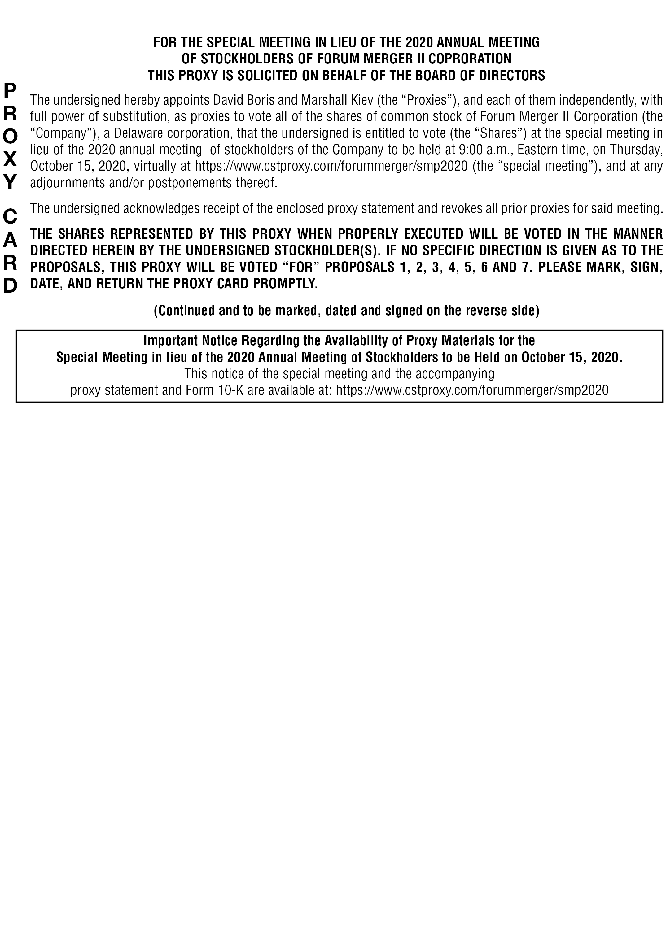 We cordially invite you to attend a special meeting in lieu of the 2020 annual meeting of the stockholders of Forum Merger II Corporation, a Delaware corporation (“Forum”, “we,” “us,” “our” or the “Company”), which will be held on Thursday, October 15, 2020, at 9:00 a.m., Eastern time at https://www.cstproxy.com/forummerger/smp2020 (the “special meeting”). In light of ongoing developments related to the novel coronavirus (COVID-19), after careful consideration, the Company has determined that the special meeting will be a virtual meeting conducted exclusively via live webcast in order to facilitate stockholder attendance and participation while safeguarding the health and safety of our stockholders, directors and management team. You or your proxyholder will be able to attend the virtual special meeting online, vote, view the list of stockholders entitled to vote at the special meeting and submit questions during the special meeting by visiting https://www.cstproxy.com/forummerger/smp2020 and using a control number assigned by Continental Stock Transfer & Trust Company. To register and receive access to the virtual meeting, registered stockholders and beneficial stockholders (those holding shares through a stock brokerage account or by a bank or other holder of record) will need to follow the instructions applicable to them provided in this proxy statement.