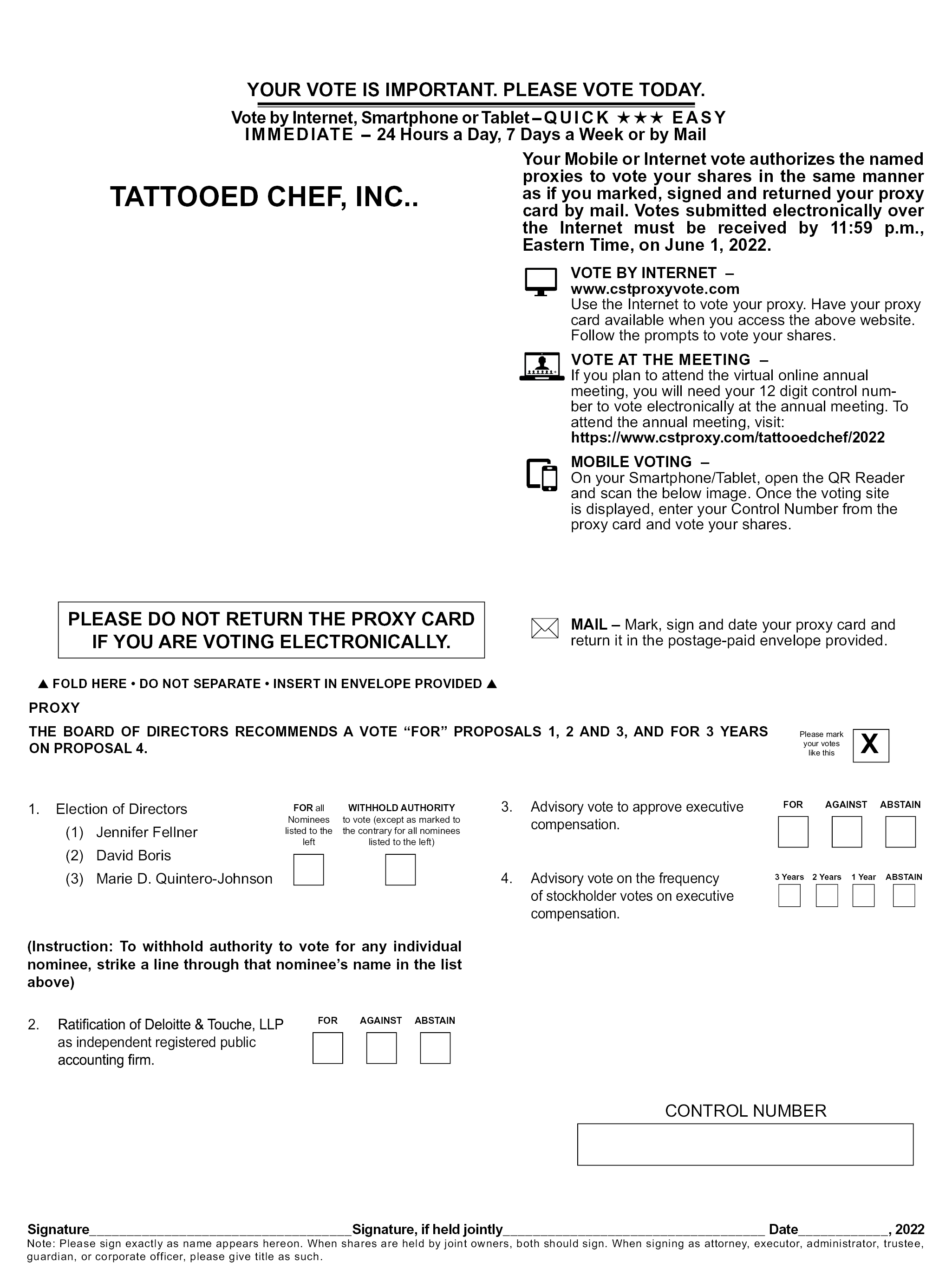 YOUR VOTE IS IMPORTANT. PLEASE VOTE TODAY. Vote by Internet, Smartphone or Tablet - QUICK EASY IMMEDIATE - 24 Hours a Day, 7 Days a Week or by Mail TATTOOED CHEF, INC.. Your Mobile or Internet vote authorizes the named proxies to vote your shares in the same manner as if you marked, signed and returned your proxy card by mail. Votes submitted electronically over the Internet must be received by 11:59 p.m., Eastern Time, on June 1, 2022. VOTE BY INTERNET – www.cstproxyvote.com Use the Internet to vote your proxy. Have your proxy card available when you access the above website. Follow the prompts to vote your shares. VOTE AT THE MEETING – If you plan to attend the virtual online annual meeting, you will need your 12 digit control num-ber to vote electronically at the annual meeting. To attend the annual meeting, visit: https://www.cstproxy.com/tattooedchef/2022 MOBILE VOTING – On your Smartphone/Tablet, open the QR Reader and scan the below image. Once the voting site is displayed, enter your Control Number from the proxy card and vote your shares. MAIL – Mark, sign and date your proxy card and return it in the postage-paid envelope provided. PLEASE DO NOT RETURN THE PROXY CARD IF YOU ARE VOTING ELECTRONICALLY. FOLD HERE • DO NOT SEPARATE • INSERT IN ENVELOPE PROVIDED PROXY THE BOARD OF DIRECTORS RECOMMENDS A VOTE “FOR” PROPOSALS 1, 2 AND 3, AND FOR 3 YEARS ON PROPOSAL 4. Please mark your votes like this 1. Election of Directors (1) Jennifer Fellner (2) David Boris (3) Marie D. Quintero-Johnson WITHHOLD AUTHORITY to vote (except as marked to the contrary for all nominees listed to the left) FOR all Nominees listed to the left 3. Advisory vote to approve executive compensation. 4. Advisory vote on the frequency of stockholder votes on executive compensation. Please mark your votes like this FOR AGAINST ABSTAIN (Instruction: To withhold authority to vote for any individual nominee, strike a line through that nominee’s name in the list above) 3 Years 2 Years 1 Year ABSTAIN 2. Ratification of Deloitte & Touche, LLP as independent registered public accounting firm. FOR AGAINST ABSTAIN CONTROL NUMBER Signature___________________________________Signature, if held jointly___________________________________ Date____________, 2022 Note: Please sign exactly as name appears hereon. When shares are held by joint owners, both should sign. When signing as attorney, executor, administrator, trustee, guardian, or corporate officer, please give title as such.