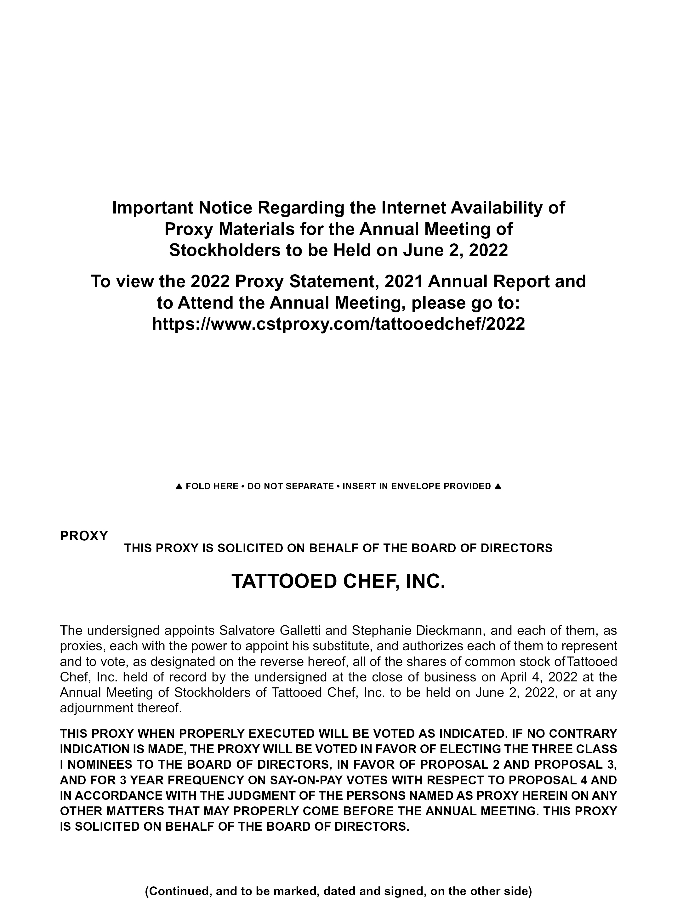 YOUR VOTE IS IMPORTANT. PLEASE VOTE TODAY. Vote by Internet, Smartphone or Tablet - QUICK EASY IMMEDIATE - 24 Hours a Day, 7 Days a Week or by Mail Your Mobile or Internet vote authorizes the named proxies to vote your shares in the same manner as if you marked, signed and returned your proxy card by mail. Votes submitted electronically over the Internet must be received by 11:59 p.m., Eastern Time, on June 1, 2022. TATTOOED CHEF, INC.. VOTE BY INTERNET – www.cstproxyvote.com Use the Internet to vote your proxy. Have your proxy card available when you access the above website. Follow the prompts to vote your shares. VOTE AT THE MEETING – If you plan to attend the virtual online annual meeting, you will need your 12 digit control num¬ber to vote electronically at the annual meeting. To attend the annual meeting, visit: https://www.cstproxy.com/tattooedchef/2022 MOBILE VOTING – On your Smartphone/Tablet, open the QR Reader and scan the below image. Once the voting site is displayed, enter your Control Number from the proxy card and vote your shares. MAIL – Mark, sign and date your proxy card and return it in the postage-paid envelope provided. PLEASE DO NOT RETURN THE PROXY CARD IF YOU ARE VOTING ELECTRONICALLY. FOLD HERE • DO NOT SEPARATE • INSERT IN ENVELOPE PROVIDED PROXY THE BOARD OF DIRECTORS RECOMMENDS A VOTE “FOR” PROPOSALS 1, 2 AND 3, AND FOR 3 YEARSON PROPOSAL 4. Please mark your votes like this