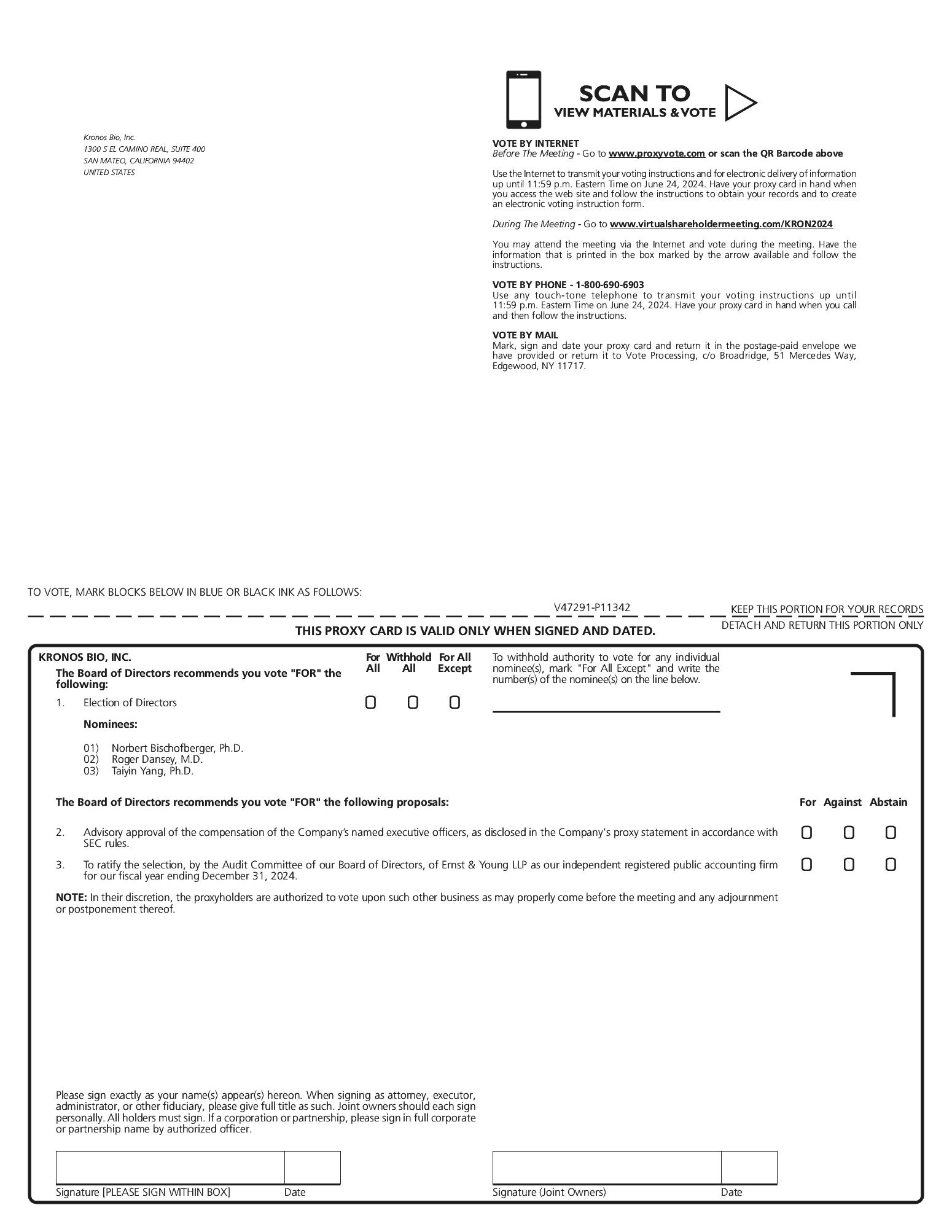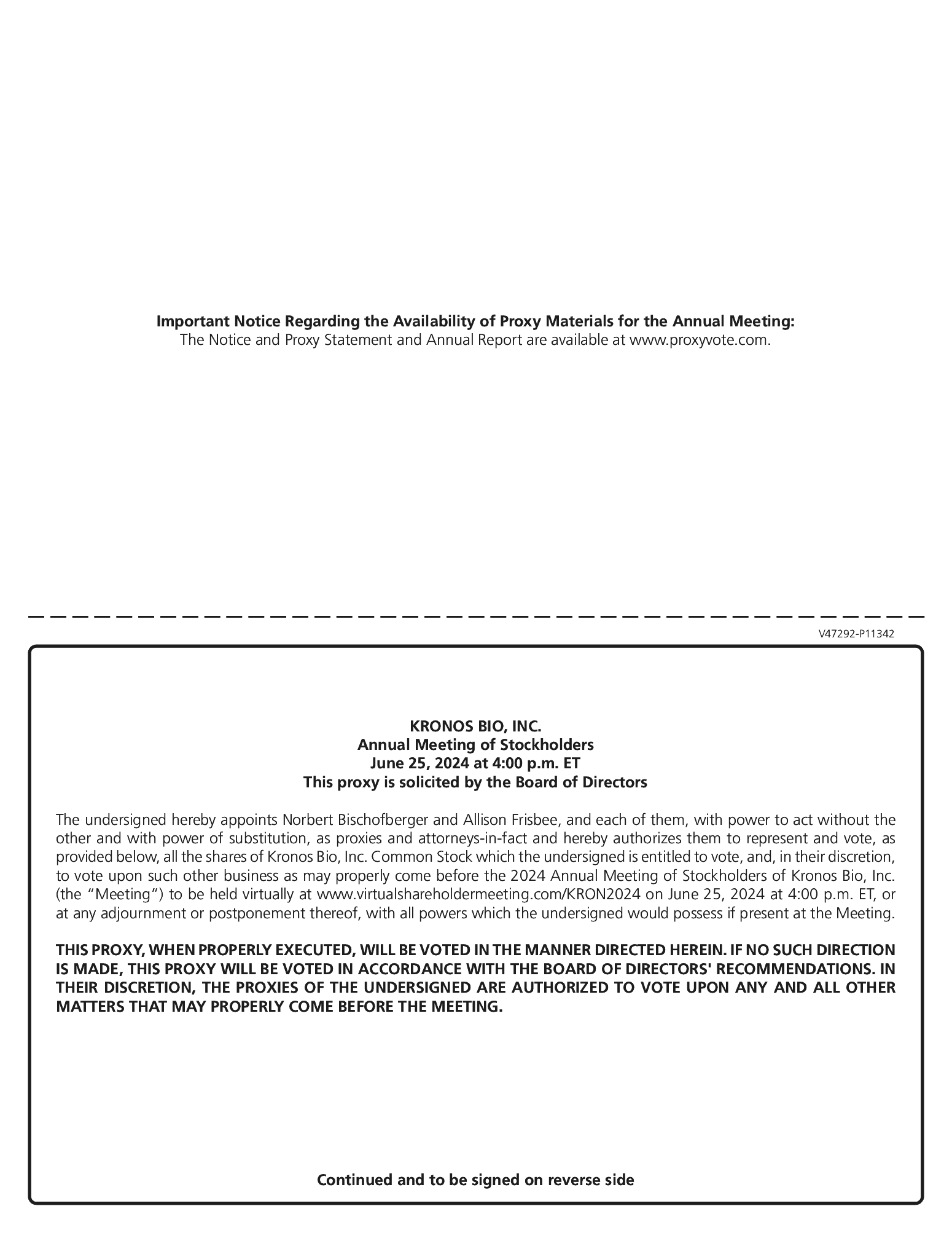 Why did I receive a notice regarding the availability of proxy materials on the internet? | | | Pursuant to rules adopted by the Securities and Exchange Commission (the “SEC”), we have elected to provide access to our proxy materials over the internet. Accordingly, we have sent you a Notice of Internet Availability of Proxy Materials (the “Notice”) because the Board of Directors (sometimes referred to as the “Board”) of Kronos Bio, Inc. (sometimes referred to as “we,” “us,” “our,” the “Company” or “Kronos Bio”) is soliciting your proxy to vote at the 2024 Annual Meeting of Stockholders (“Annual Meeting”), including at any adjournments or postponements of the meeting. The Annual Meeting will be held virtually on June 25, 2024 at 4:00 p.m. Eastern Time. You can attend the Annual Meeting by visiting www.virtualshareholdermeeting.com/KRON2024, where you will be able to listen to the meeting live, submit questions, and vote online. All stockholders will have the ability to access the proxy materials on the website referred to in the Notice or request to receive a printed set of the proxy materials. Instructions on how to access the proxy materials over the internet or to request a printed copy may be found in the Notice. | ||||||