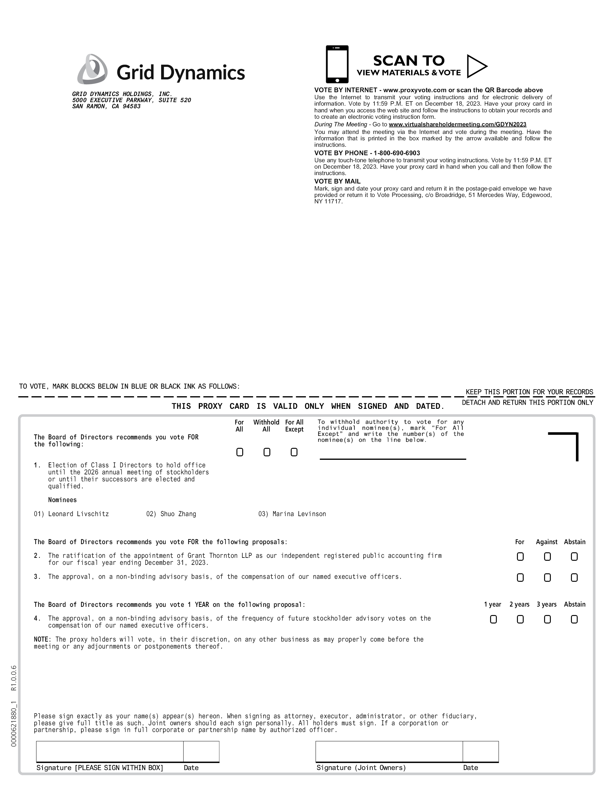 GRID DYNAMICS HOLDINGS, INC. 5000 EXECUTIVE PARKWAY, SUITE 520 SAN RAMON, CA 94583 SCAN TO VIEW MATERIALS & VOTE VOTE BY INTERNET - www.proxyvote.com or scan the QR Barcode above Use the Internet to transmit your voting instructions and for electronic delivery of information. Vote by 11:59 P.M. ET on December 18, 2023. Have your proxy card in hand when you access the web site and follow the instructions to obtain your records and to create an electronic voting instruction form. During The Meeting - Go to www.virtualshareholdermeeting.com/GDYN2023 You may attend the meeting via the Internet and vote during the meeting. Have the information that is printed in the box marked by the arrow available and follow the instructions. VOTE BY PHONE - 1-800-690-6903 Use any touch-tone telephone to transmit your voting instructions. Vote by 11:59 P.M. ET on December 18, 2023. Have your proxy card in hand when you call and then follow the instructions. VOTE BY MAIL Mark, sign and date your proxy card and return it in the postage-paid envelope we have provided or return it to Vote Processing, c/o Broadridge, 51 Mercedes Way, Edgewood, NY 11717. TO VOTE, MARK BLOCKS BELOW IN BLUE OR BLACK INK AS FOLLOWS: KEEP THIS PORTION FOR YOUR RECORDS THIS PROXY CARD IS VALID ONLY WHEN SIGNED AND DATED. DETACH AND RETURN THIS PORTION ONLY For Withhold For All All All Except To withhold authority to vote for any individual nominee(s), mark “For All Except” and write the number(s) of the nominee(s) on the line below. The Board of Directors recommends you vote FOR the following: 1. Election of Class I Directors to hold office until the 2026 annual meeting of stockholders or until their successors are elected and qualified. Nominees 01) Leonard Livschitz 02) Shuo Zhang 03) Marina Levinson The Board of Directors recommends you vote FOR the following proposals: For Against Abstain 2. The ratification of the appointment of Grant Thornton LLP as our independent registered public accounting firm for our fiscal year ending December 31, 2023. 3. The approval, on a non-binding advisory basis, of the compensation of our named executive officers. The Board of Directors recommends you vote 1 YEAR on the following proposal: 1 year 2 years 3 years Abstain 4. The approval, on a non-binding advisory basis, of the frequency of future stockholder advisory votes on the compensation of our named executive officers. NOTE: The proxy holders will vote, in their discretion, on any other business as may properly come before the meeting or any adjournments or postponements thereof. Please sign exactly as your name(s) appear(s) hereon. When signing as attorney, executor, administrator, or other fiduciary, please give full title as such. Joint owners should each sign personally. All holders must sign. If a corporation or partnership, please sign in full corporate or partnership name by authorized officer. Signature [PLEASE SIGN WITHIN BOX] Date Signature (Joint Owners) Date