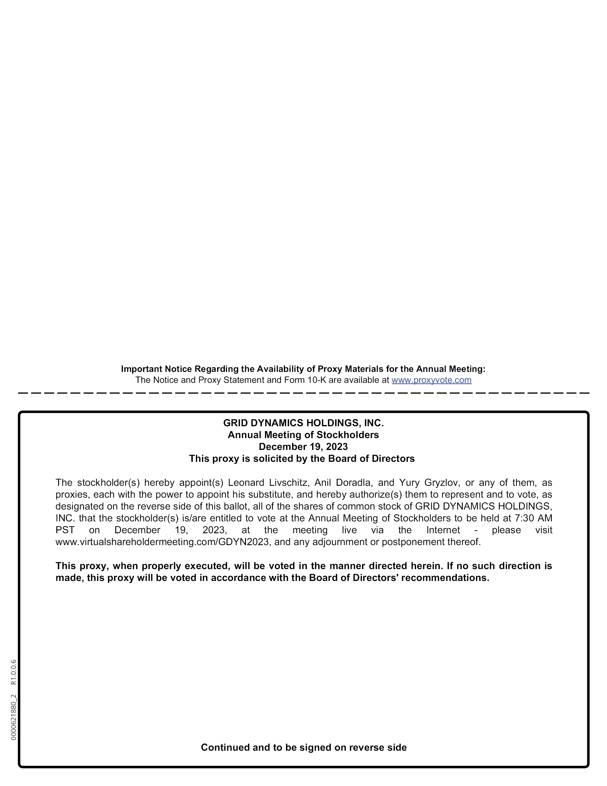Important Notice Regarding the Availability of Proxy Materials for the Annual Meeting: The Notice and Proxy Statement and Form 10-K are available at www.proxyvote.com GRID DYNAMICS HOLDINGS, INC. Annual Meeting of Stockholders December 19, 2023 This proxy is solicited by the Board of Directors The stockholder(s) hereby appoint(s) Leonard Livschitz, Anil Doradla, and Yury Gryzlov, or any of them, as proxies, each with the power to appoint his substitute, and hereby authorize(s) them to represent and to vote, as designated on the reverse side of this ballot, all of the shares of common stock of GRID DYNAMICS HOLDINGS, INC. that the stockholder(s) is/are entitled to vote at the Annual Meeting of Stockholders to be held at 7:30 AM PST on December 19, 2023, at the meeting live via the Internet - please visit www.virtualshareholdermeeting.com/GDYN2023, and any adjournment or postponement thereof. This proxy, when properly executed, will be voted in the manner directed herein. If no such direction is made, this proxy will be voted in accordance with the Board of Directors’ recommendations. Continued and to be signed on reverse side 0000621880_2 R1.0.0.6