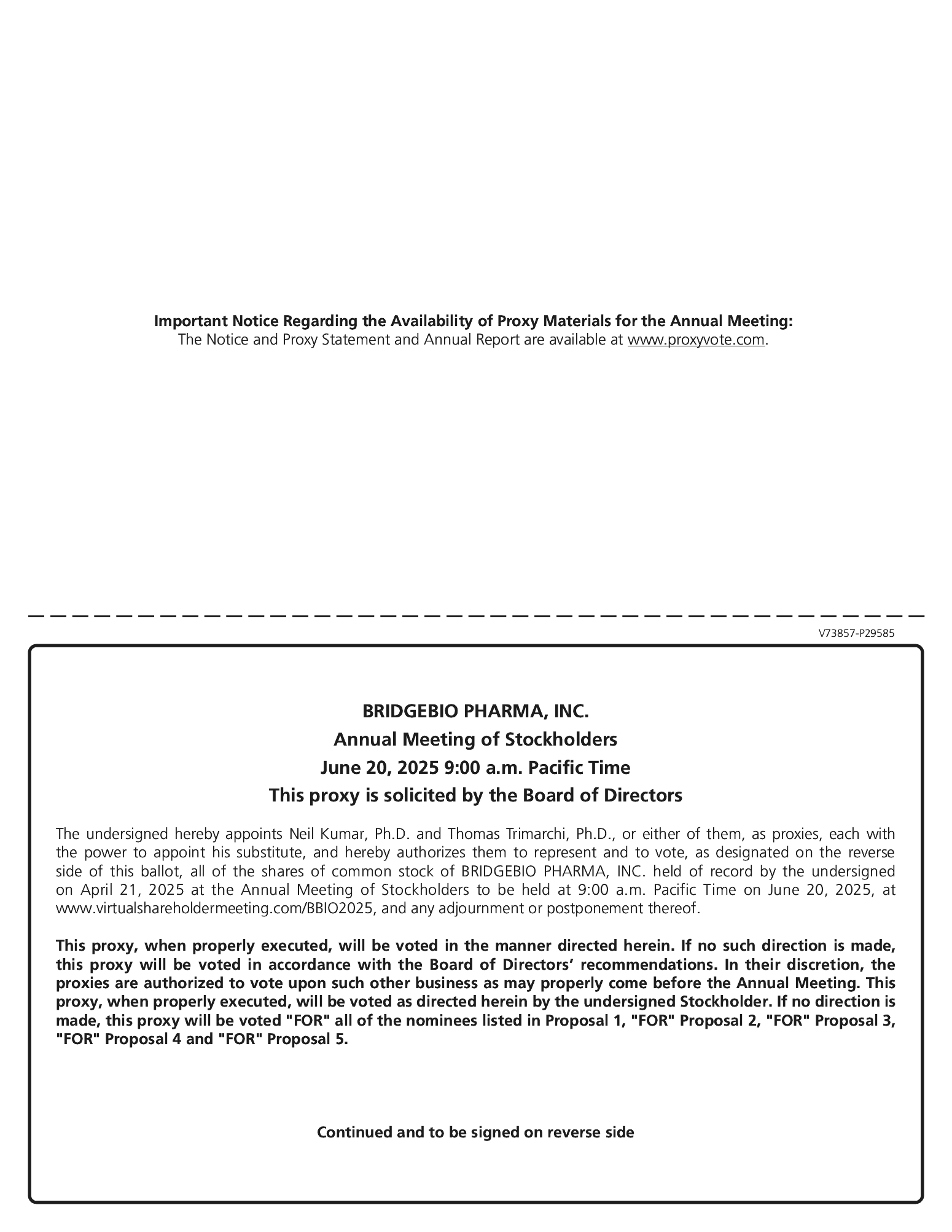 You are cordially invited to attend the 2025 Annual Meeting of Stockholders (the “Annual Meeting”) of BridgeBio Pharma, Inc., a Delaware corporation (the “Company”). The Annual Meeting will be held on Friday, June 20, 2025, at 9:00 a.m. (Pacific time), via live audio webcast at www.virtualshareholdermeeting.com/BBIO2025 for the following purposes: