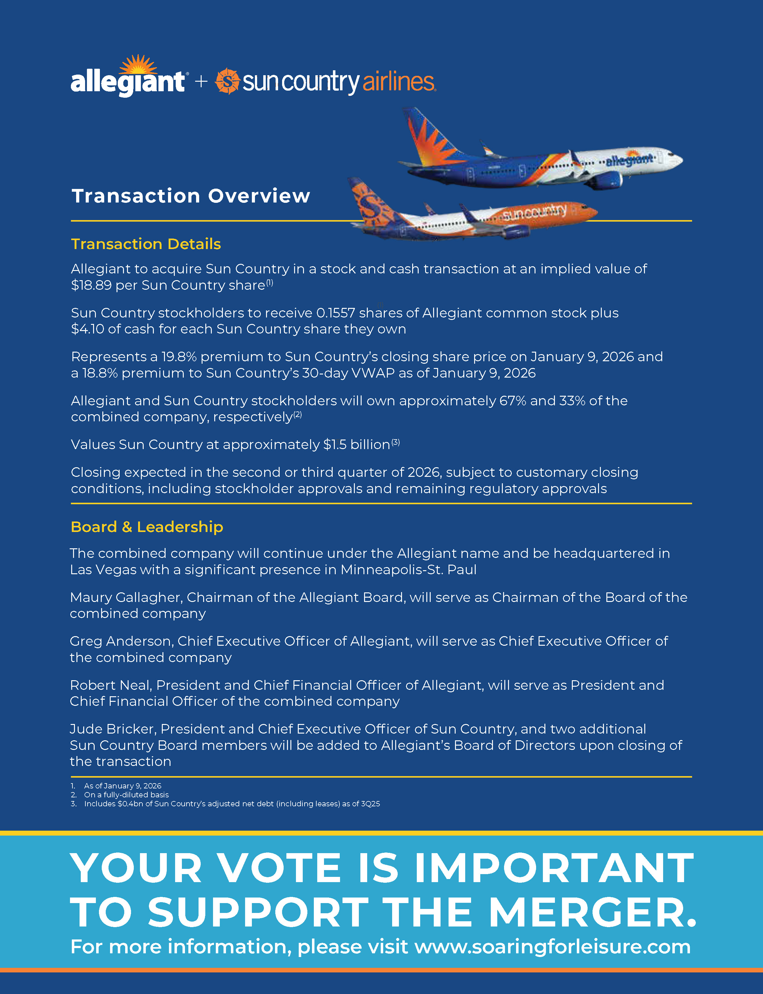 Each of Allegiant and Sun Country may also file with or furnish to the SEC other relevant documents regarding the proposed transaction. This communication is not a substitute for the Registration Statement, the Definitive Joint Proxy Statement/Prospectus or any other document that Allegiant or Sun Country may file with the SEC or send to their respective stockholders in connection with the proposed transaction. INVESTORS AND SECURITY HOLDERS OF ALLEGIANT AND SUN COUNTRY ARE URGED TO READ THE REGISTRATION STATEMENT AND THE DEFINITIVE JOINT PROXY STATEMENT/PROSPECTUS INCLUDED WITHIN THE REGISTRATION STATEMENT, AS WELL AS ANY OTHER RELEVANT DOCUMENTS FILED WITH THE SEC IN CONNECTION WITH THE PROPOSED TRANSACTION OR INCORPORATED BY REFERENCE INTO THE REGISTRATION STATEMENT AND THE DEFINITIVE JOINT PROXY STATEMENT/PROSPECTUS (INCLUDING ANY AMENDMENTS OR SUPPLEMENTS THERETO), BECAUSE THEY WILL CONTAIN IMPORTANT INFORMATION REGARDING ALLEGIANT, SUN COUNTRY, THE PROPOSED TRANSACTION AND RELATED MATTERS. Investors and security holders of Allegiant and Sun Country may obtain free copies of these documents and other documents filed with the SEC by Allegiant or Sun Country through the website maintained by the SEC at http://www.sec.gov or from Allegiant at its website, https://ir.allegiantair.com/financials/sec-filings/default.aspx, or from Sun Country at its website, https://ir.suncountry.com/financials/sec-filings. Documents filed with the SEC by Allegiant will be available free of charge by accessing Allegiant’s website at https://ir.allegiantair.com/financials/sec-filings/default.aspx, or alternatively by directing a request by mail to Allegiant’s Investor Relations department, 1201 North Town Center Drive, Las Vegas, NV 89144, and documents filed with the SEC by Sun Country will be available free of charge by accessing Sun Country’s website at https://ir.suncountry.com/financials/sec-filings, or alternatively by directing a request by mail to Sun Country’s Investor Relations department, 2005 Cargo Road, Minneapolis, MN 55450.