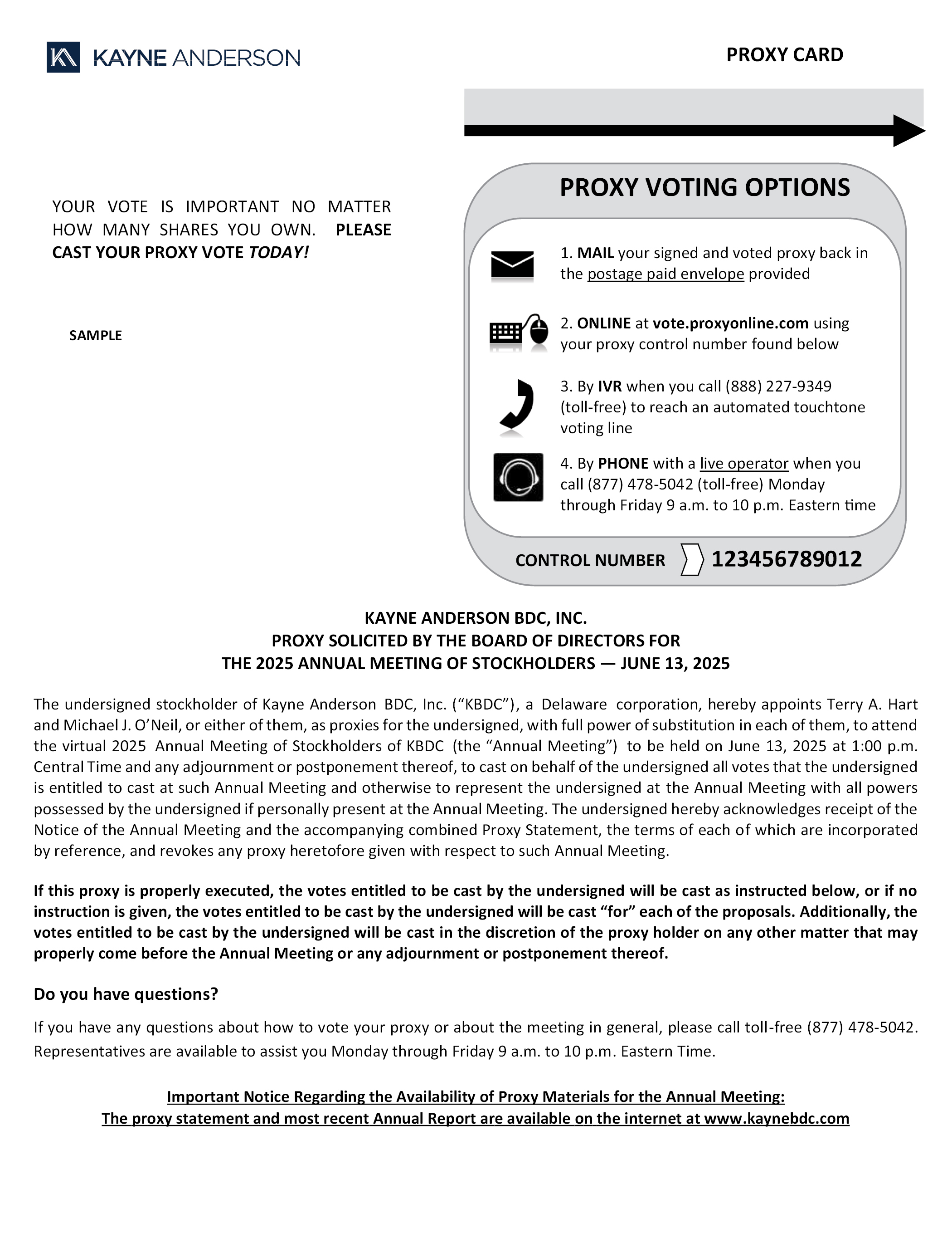 PROXY CARD YOUR VOTE IS IMPORTANT NO MATTER HOW MANY SHARES YOU OWN. PLEASE CAST YOUR PROXY VOTE TODAY! SAMPLE PROXY VOTING OPTIONS 1. MAIL your signed and voted proxy back in the postage paid envelope provided 2. ONLINE at vote.proxyonline.com using your proxy control number found below 3. By IVR when you call (888) 227-9349 (toll-free) to reach an automated touchtone voting line 4. By PHONE with a live operator when you call (877) 478-5042 (toll-free) Monday through Friday 9 a.m. to 10 p.m. Eastern time 123456789012 CONTROL NUMBER KAYNE ANDERSON BDC, INC. PROXY SOLICITED BY THE BOARD OF DIRECTORS FOR THE 2025 ANNUAL MEETING OF STOCKHOLDERS —JUNE 13, 2025 The undersigned stockholder of Kayne Anderson BDC, Inc. (“KBDC”), a Delaware corporation, hereby appoints Terry A. Hart and Michael J. O’Neil, or either of them, as proxies for the undersigned, with full power of substitution in each of them, to attend the virtual 2025 Annual Meeting of Stockholders of KBDC (the “Annual Meeting”) to be held on June 13, 2025 at 1:00 p.m. Central Time and any adjournment or postponement thereof, to cast on behalf of the undersigned all votes that the undersigned is entitled to cast at such Annual Meeting and otherwise to represent the undersigned at the Annual Meeting with all powers possessed by the undersigned if personally present at the Annual Meeting. The undersigned hereby acknowledges receipt of the Notice of the Annual Meeting and the accompanying combined Proxy Statement, the terms of each of which are incorporated by reference, and revokes any proxy heretofore given with respect to such Annual Meeting. If this proxy is properly executed, the votes entitled to be cast by the undersigned will be cast as instructed below, or if no instruction is given, the votes entitled to be cast by the undersigned will be cast “for” each of the proposals. Additionally, the votes entitled to be cast by the undersigned will be cast in the discretion of the proxy holder on any other matter that may properly come before the Annual Meeting or any adjournment or postponement thereof. Do you have questions? If you have any questions about how to vote your proxy or about the meeting in general, please call toll-free (877) 478-5042. Representatives are available to assist you Monday through Friday 9 a.m. to 10 p.m. Eastern Time. Important Notice Regarding the Availability of Proxy Materials for the Annual Meeting: The proxy statement and most recent Annual Report are available on the internet at www.kaynebdc.com