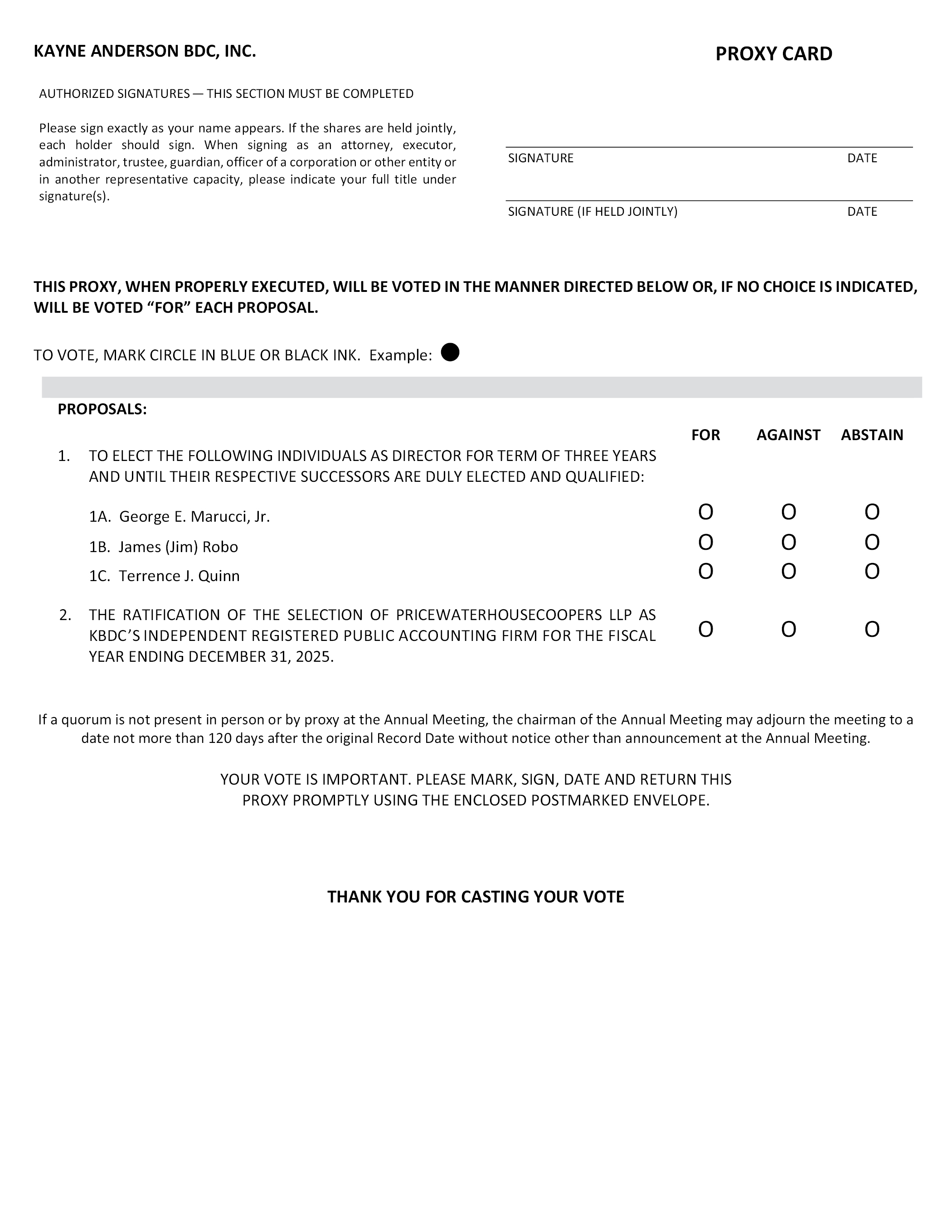 PROXY CARD KAYNE ANDERSON BDC, INC. AUTHORIZED SIGNATURES—THIS SECTIONMUST BE COMPLETED Please sign exactly as your name appears. If the shares are held jointly, each holder should sign. When signing as an attorney, executor, administrator, trustee, guardian, officer of a corporation or other entity or in another representative capacity, please indicate your full title under signature(s). SIGNATURE DATE SIGNATURE (IF HELD JOINTLY) DATE THIS PROXY, WHEN PROPERLY EXECUTED, WILL BE VOTED IN THE MANNER DIRECTED BELOW OR, IF NO CHOICE IS INDICATED, WILL BE VOTED “FOR” EACH PROPOSAL. TO VOTE, MARK CIRCLE IN BLUE OR BLACK INK. Example: PROPOSALS: 1. TO ELECT THE FOLLOWING INDIVIDUALS AS DIRECTOR FOR TERM OF THREE YEARS 1A. George E. Marucci, Jr. 1B. James (Jim) Robo 1C. Terrence J. Quinn 2. THE RATIFICATION OF THE SELECTION OF PRICEWATERHOUSECOOPERS LLP AS KBDC’S INDEPENDENT REGISTERED PUBLIC ACCOUNTING FIRM FOR THE FISCAL YEAR ENDING DECEMBER 31, 2025. AND UNTIL THEIR RESPECTIVE SUCCESSORS ARE DULY ELECTED AND QUALIFIED: FOR AGAINST ABSTAIN If a quorum is not present in person or by proxy at the Annual Meeting, the chairman of the Annual Meeting may adjourn the meeting to a date not more than 120 days after the original Record Date without notice other than announcement at the Annual Meeting. YOUR VOTE IS IMPORTANT. PLEASE MARK, SIGN, DATE AND RETURN THIS PROXY PROMPTLY USING THE ENCLOSED POSTMARKED ENVELOPE. THANK YOU FOR CASTING YOUR VOTE