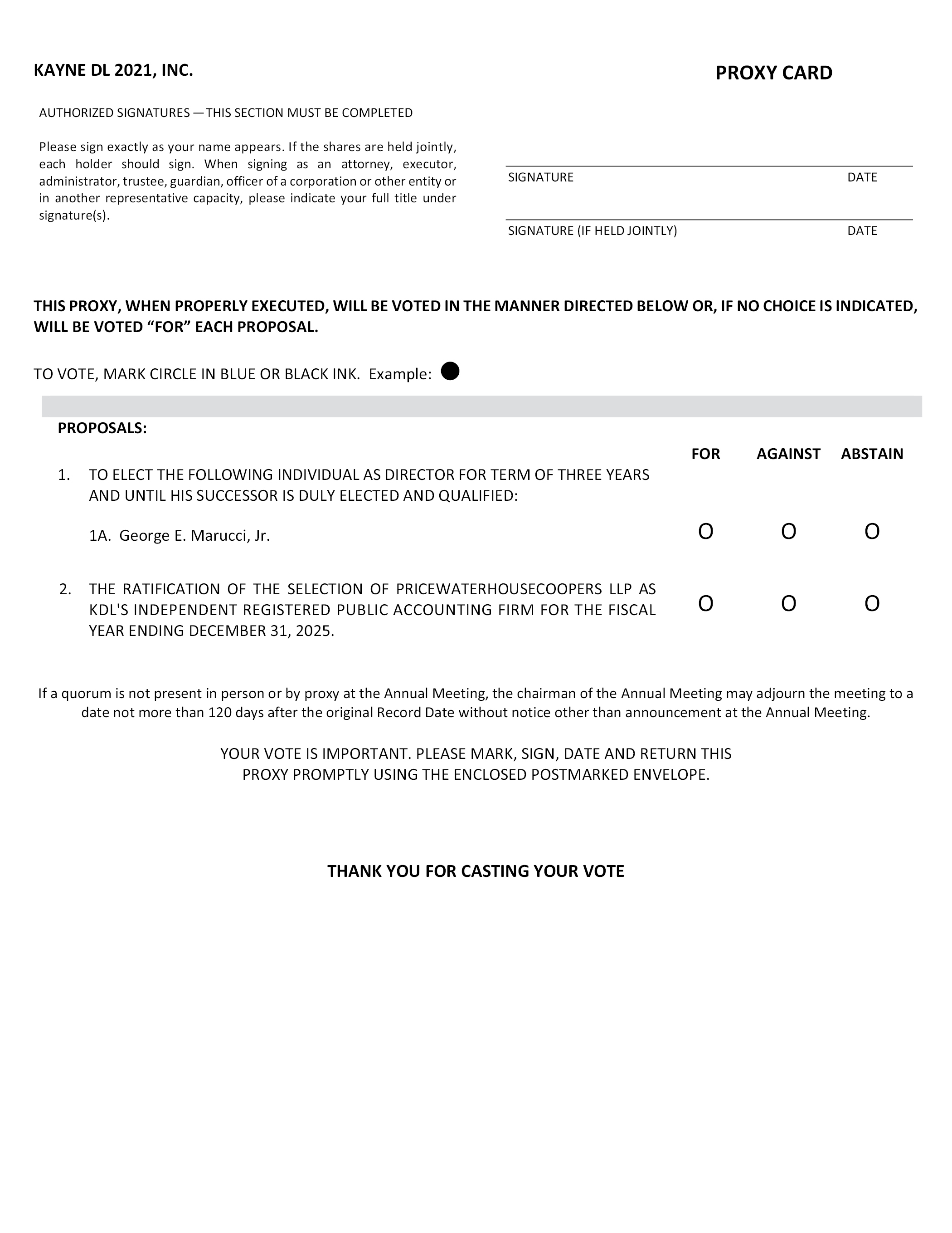 PROXY CARD KAYNE DL 2021, INC. AUTHORIZED SIGNATURES—THIS SECTION MUST BE COMPLETED Please sign exactly as your name appears. If the shares are held jointly, each holder should sign. When signing as an attorney, executor, administrator, trustee, guardian, officer of a corporation or other entity or in another representative capacity, please indicate your full title under signature(s). SIGNATURE DATE SIGNATURE (IF HELD JOINTLY) DATE THIS PROXY, WHEN PROPERLY EXECUTED, WILL BE VOTED IN THE MANNER DIRECTED BELOW OR, IF NO CHOICE IS INDICATED, WILL BE VOTED “FOR” EACH PROPOSAL. TO VOTE, MARK CIRCLE IN BLUE OR BLACK INK. Example: PROPOSALS: 1. TO ELECT THE FOLLOWING INDIVIDUAL AS DIRECTOR FOR TERM OF THREE YEARS AND UNTIL HIS SUCCESSOR IS DULY ELECTED AND QUALIFIED: 1A. George E. Marucci, Jr. 2. THE RATIFICATION OF THE SELECTION OF PRICEWATERHOUSECOOPERS LLP AS KDL’S INDEPENDENT REGISTERED PUBLIC ACCOUNTING FIRM FOR THE FISCAL YEAR ENDING DECEMBER 31, 2025. FOR AGAINST ABSTAIN If a quorum is not present in person or by proxy at the Annual Meeting, the chairman of the Annual Meeting may adjourn the meeting to a date not more than 120 days after the original Record Date without notice other than announcement at the Annual Meeting. YOUR VOTE IS IMPORTANT. PLEASE MARK, SIGN, DATE AND RETURN THIS PROXY PROMPTLY USING THE ENCLOSED POSTMARKED ENVELOPE. THANK YOU FOR CASTING YOUR VOTE