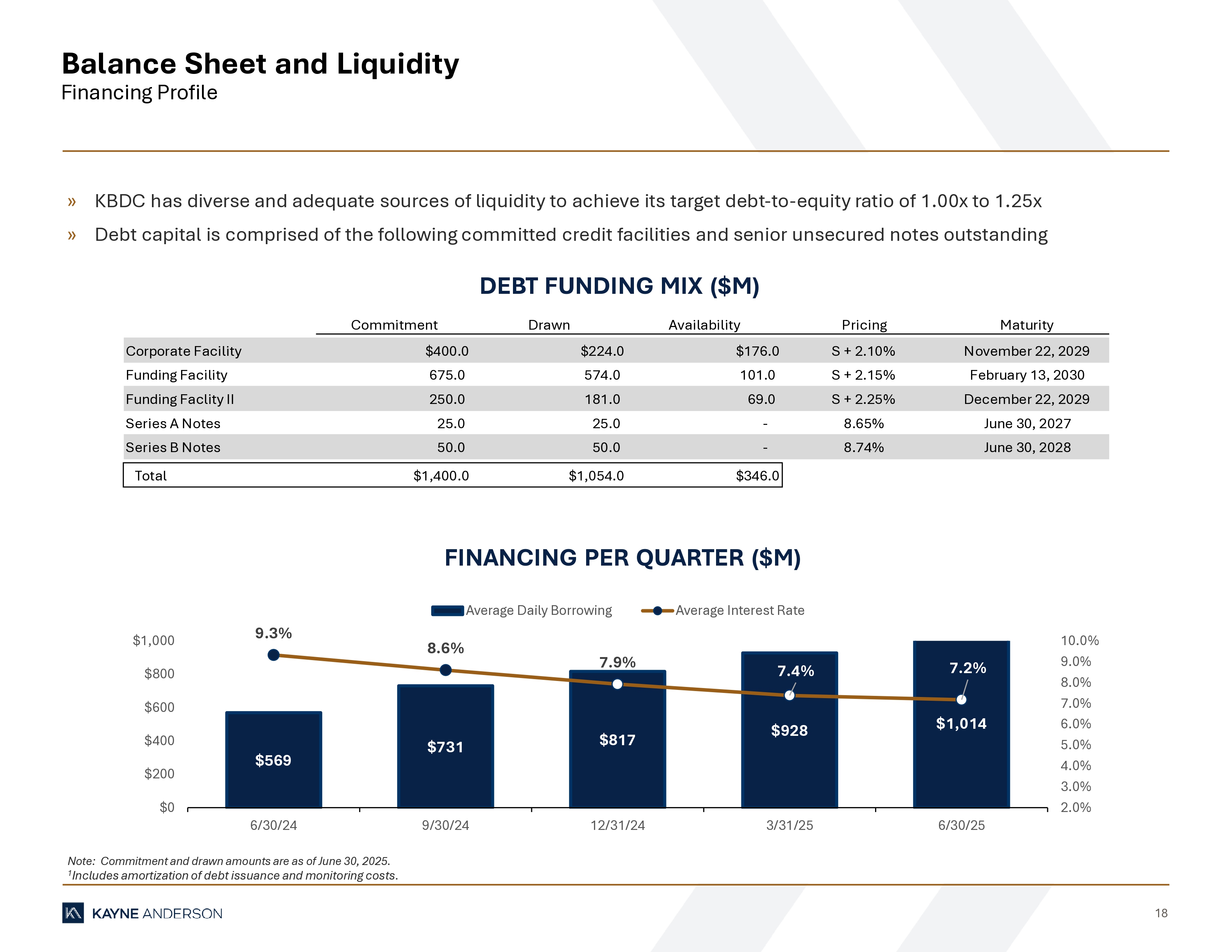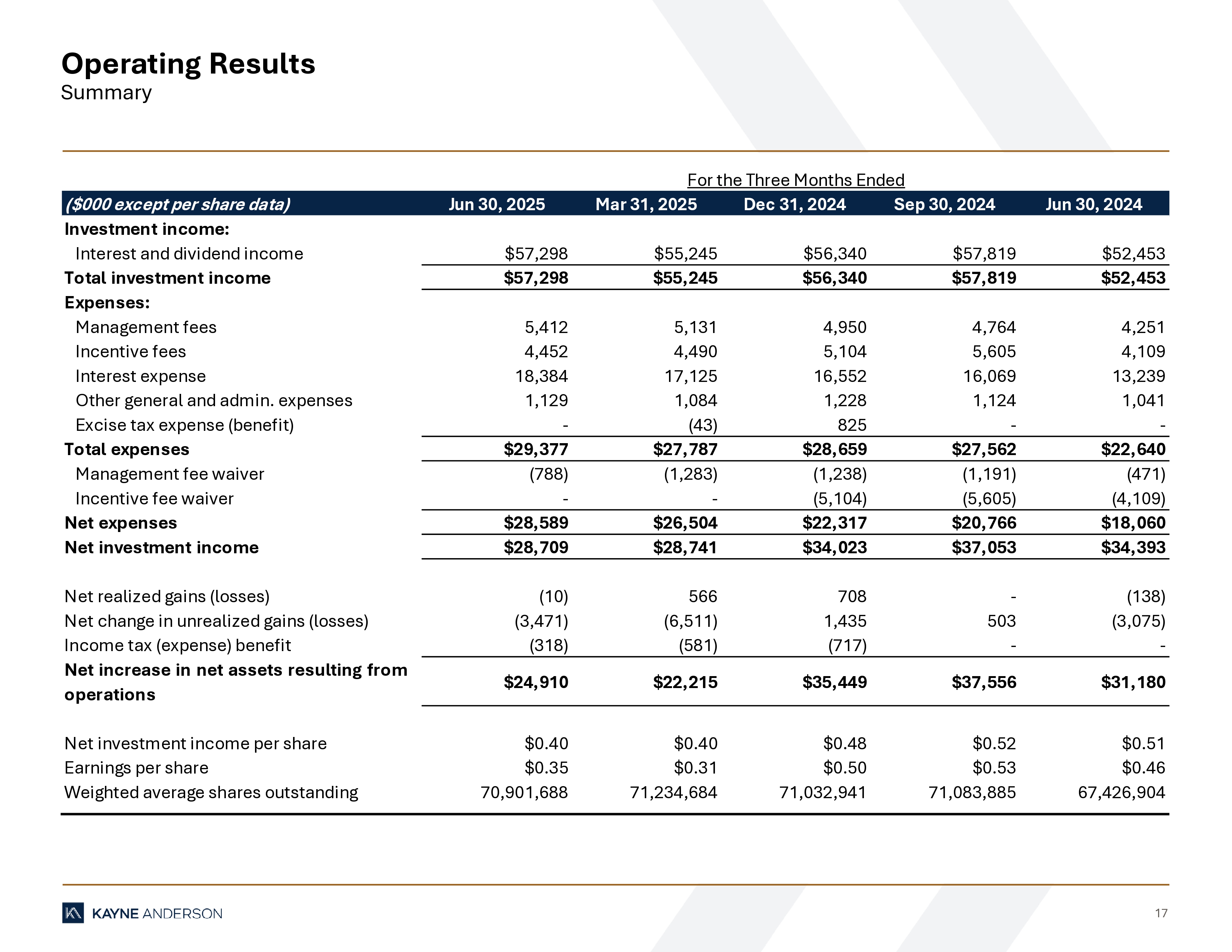 17 Operating Results Summary ($000 except per share data) Jun 30, 2025 Mar 31, 2025 Dec 31, 2024 Sep 30, 2024 Jun 30, 2024 Investment income: Interest and dividend income $57,298 $55,245 $56,340 $57,819 $52,453 Total investment income $57,298 $55,245 $56,340 $57,819 $52,453 Expenses: Management fees 5,412 5,131 4,950 4,764 4,251 Incentive fees 4,452 4,490 5,104 5,605 4,109 Interest expense 18,384 17,125 16,552 16,069 13,239 Other general and admin. expenses 1,129 1,084 1,228 1,124 1,041 Excise tax expense (benefit) - (43) 825 - - Total expenses $29,377 $27,787 $28,659 $27,562 $22,640 Management fee waiver (788) (1,283) (1,238) (1,191) (471) Incentive fee waiver - - (5,104) (5,605) (4,109) Net expenses $28,589 $26,504 $22,317 $20,766 $18,060 Net investment income $28,709 $28,741 $34,023 $37,053 $34,393 Net realized gains (losses) (10) 566 708 - (138) Net change in unrealized gains (losses) (3,471) (6,511) 1,435 503 (3,075) Income tax (expense) benefit (318) (581) (717) - - Net increase in net assets resulting from operations $24,910 $22,215 $35,449 $37,556 $31,180 Net investment income per share $0.40 $0.40 $0.48 $0.52 $0.51 Earnings per share $0.35 $0.31 $0.50 $0.53 $0.46 Weighted average shares outstanding 70,901,688 71,234,684 71,032,941 71,083,885 67,426,904 For the Three Months Ended