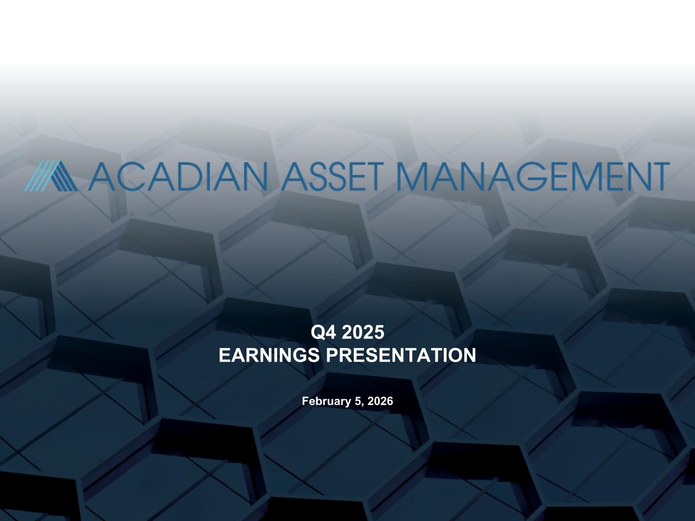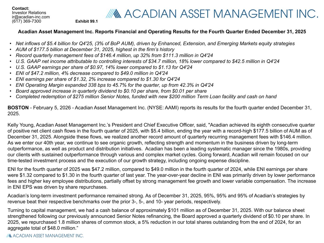 Acadian Asset Management Inc. Reports Financial and Operating Results for the Fourth Quarter Ended December 31, 2025 • Net inflows of $5.4 billion for Q4'25, (3% of BoP AUM), driven by Enhanced, Extension, and Emerging Markets equity strategies • AUM of $177.5 billion at December 31, 2025, highest in the firm’s history • Record quarterly management fees of $146.4 million, up 32% from $111.3 million in Q4'24 • U.S. GAAP net income attributable to controlling interests of $34.7 million, 18% lower compared to $42.5 million in Q4'24 • U.S. GAAP earnings per share of $0.97, 14% lower compared to $1.13 for Q4'24 • ENI of $47.2 million, 4% decrease compared to $49.0 million in Q4'24 • ENI earnings per share of $1.32, 2% increase compared to $1.30 for Q4'24 • ENI Operating Margin expanded 338 bps to 45.7% for the quarter, up from 42.3% in Q4'24 • Board approved increase in quarterly dividend to $0.10 per share, from $0.01 per share • Completed redemption of $275 million Senior Notes, funded with new $200 million Term Loan facility and cash on hand BOSTON - February 5, 2026 - Acadian Asset Management Inc. (NYSE: AAMI) reports its results for the fourth quarter ended December 31, 2025. Kelly Young, Acadian Asset Management Inc.’s President and Chief Executive Officer, said, "Acadian achieved its eighth consecutive quarter of positive net client cash flows in the fourth quarter of 2025, with $5.4 billion, ending the year with a record-high $177.5 billion of AUM as of December 31, 2025. Alongside these flows, we realized another record amount of quarterly recurring management fees with $146.4 million. As we enter our 40th year, we continue to see organic growth, reflecting strength and momentum in the business driven by long-term outperformance, as well as product and distribution initiatives. Acadian has been a leading systematic manager since the 1980s, providing our clients with sustained outperformance through various and complex market cycles. Going forward, Acadian will remain focused on our time-tested investment process and the execution of our growth strategy, including ongoing expense discipline. ENI for the fourth quarter of 2025 was $47.2 million, compared to $49.0 million in the fourth quarter of 2024, while ENI earnings per share were $1.32 compared to $1.30 in the fourth quarter of last year. The year-over-year decline in ENI was primarily driven by lower performance fees and higher key employee distributions, partially offset by strong management fee growth and lower variable compensation. The increase in ENI EPS was driven by share repurchases. Acadian’s long-term investment performance remained strong. As of December 31, 2025, 95%, 95% and 95% of Acadian’s strategies by revenue beat their respective benchmarks over the prior 3-, 5-, and 10- year periods, respectively. Turning to capital management, we had a cash balance of approximately $101 million as of December 31, 2025. With our balance sheet strengthened following our previously announced Senior Notes refinancing, the Board approved a quarterly dividend of $0.10 per share. In 2025, we repurchased 1.8 million shares of common stock, a 5% reduction in our total shares outstanding from the end of 2024, for an aggregate total of $48.0 million.” Contact: Investor Relations ir@acadian-inc.com (617) 369-7300