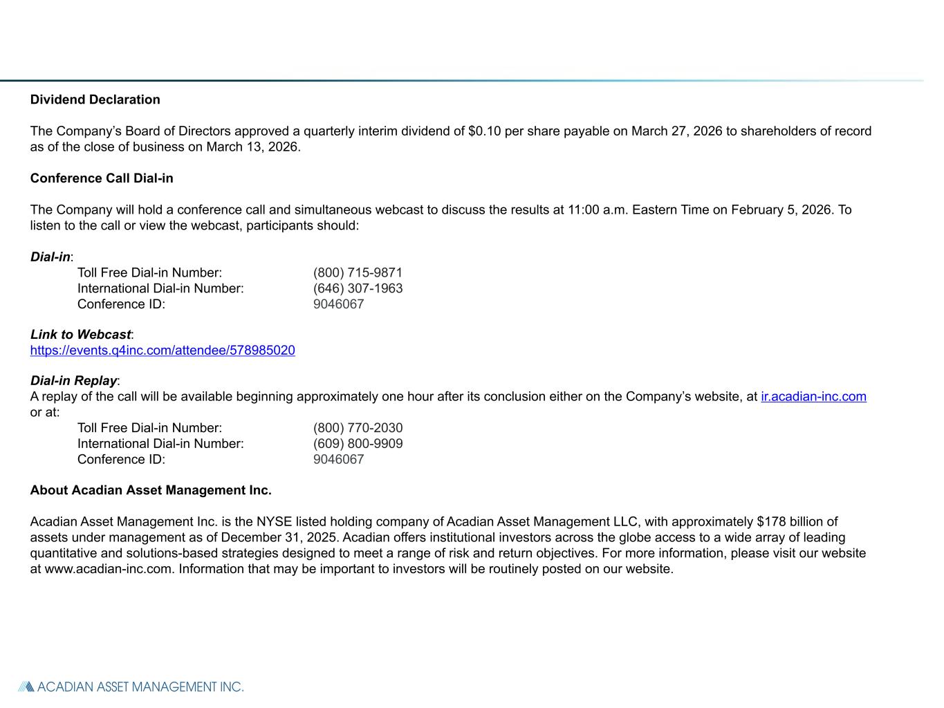 Dividend Declaration The Company’s Board of Directors approved a quarterly interim dividend of $0.10 per share payable on March 27, 2026 to shareholders of record as of the close of business on March 13, 2026. Conference Call Dial-in The Company will hold a conference call and simultaneous webcast to discuss the results at 11:00 a.m. Eastern Time on February 5, 2026. To listen to the call or view the webcast, participants should: Dial-in: Toll Free Dial-in Number: (800) 715-9871 International Dial-in Number: (646) 307-1963 Conference ID: 9046067 Link to Webcast: https://events.q4inc.com/attendee/578985020 Dial-in Replay: A replay of the call will be available beginning approximately one hour after its conclusion either on the Company’s website, at ir.acadian-inc.com or at: Toll Free Dial-in Number: (800) 770-2030 International Dial-in Number: (609) 800-9909 Conference ID: 9046067 About Acadian Asset Management Inc. Acadian Asset Management Inc. is the NYSE listed holding company of Acadian Asset Management LLC, with approximately $178 billion of assets under management as of December 31, 2025. Acadian offers institutional investors across the globe access to a wide array of leading quantitative and solutions-based strategies designed to meet a range of risk and return objectives. For more information, please visit our website at www.acadian-inc.com. Information that may be important to investors will be routinely posted on our website.