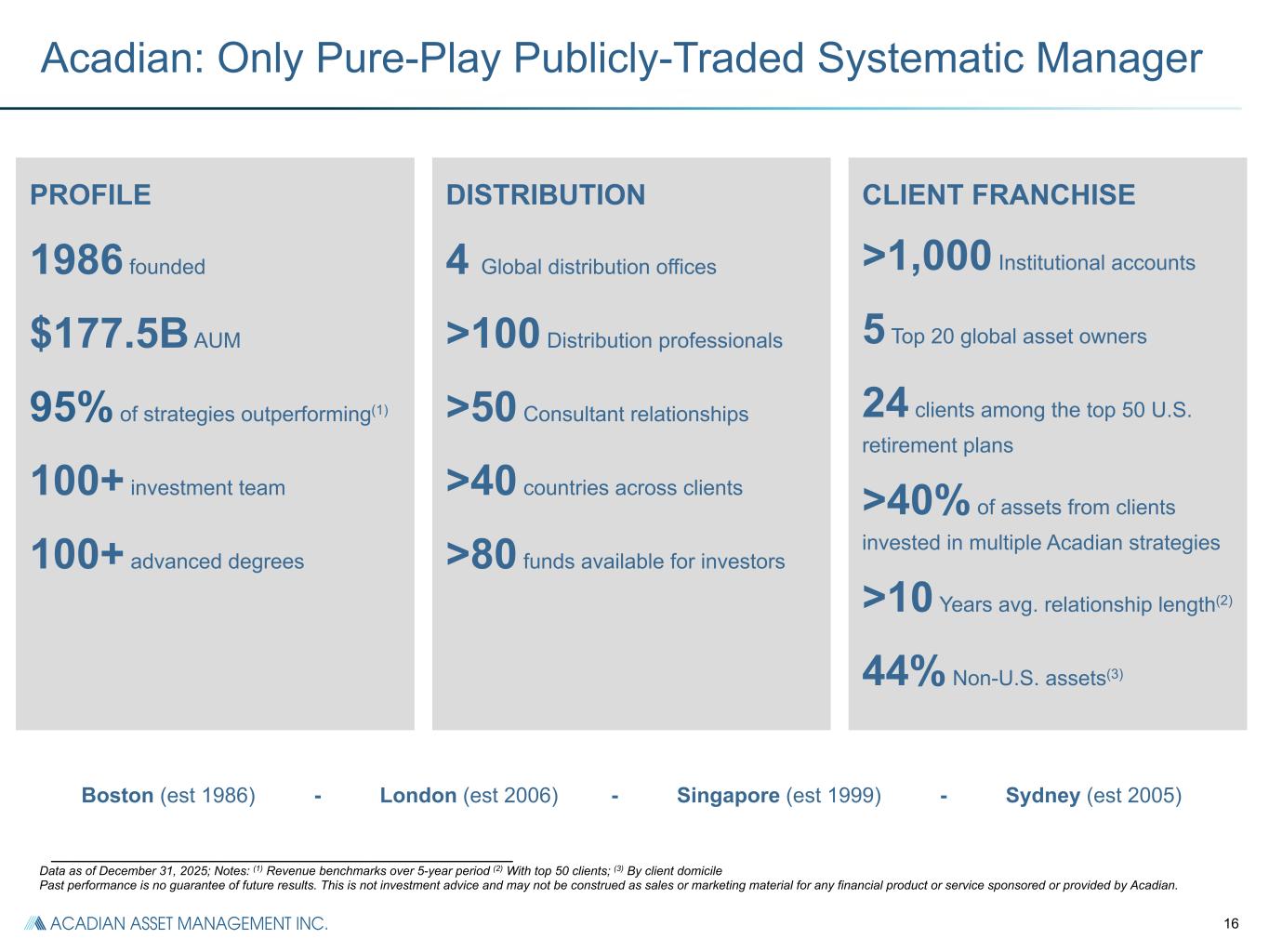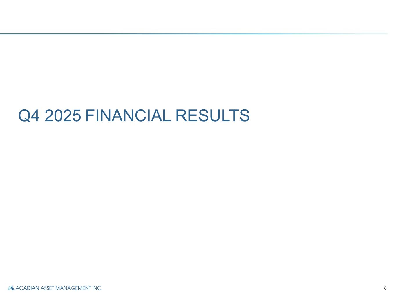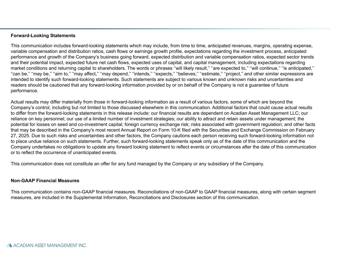 Forward-Looking Statements This communication includes forward-looking statements which may include, from time to time, anticipated revenues, margins, operating expense, variable compensation and distribution ratios, cash flows or earnings growth profile, expectations regarding the investment process, anticipated performance and growth of the Company’s business going forward, expected distribution and variable compensation ratios, expected sector trends and their potential impact, expected future net cash flows, expected uses of capital, and capital management, including expectations regarding market conditions and returning capital to shareholders. The words or phrases ‘‘will likely result,’’ ‘‘are expected to,’’ ‘‘will continue,’’ ‘‘is anticipated,’’ ‘‘can be,’’ ‘‘may be,’’ ‘‘aim to,’’ ‘‘may affect,’’ ‘‘may depend,’’ ‘‘intends,’’ ‘‘expects,’’ ‘‘believes,’’ ‘‘estimate,’’ ‘‘project,’’ and other similar expressions are intended to identify such forward-looking statements. Such statements are subject to various known and unknown risks and uncertainties and readers should be cautioned that any forward-looking information provided by or on behalf of the Company is not a guarantee of future performance. Actual results may differ materially from those in forward-looking information as a result of various factors, some of which are beyond the Company’s control, including but not limited to those discussed elsewhere in this communication. Additional factors that could cause actual results to differ from the forward-looking statements in this release include: our financial results are dependent on Acadian Asset Management LLC; our reliance on key personnel; our use of a limited number of investment strategies; our ability to attract and retain assets under management; the potential for losses on seed and co-investment capital; foreign currency exchange risk; risks associated with government regulation; and other facts that may be described in the Company's most recent Annual Report on Form 10-K filed with the Securities and Exchange Commission on February 27, 2025. Due to such risks and uncertainties and other factors, the Company cautions each person receiving such forward-looking information not to place undue reliance on such statements. Further, such forward-looking statements speak only as of the date of this communication and the Company undertakes no obligations to update any forward looking statement to reflect events or circumstances after the date of this communication or to reflect the occurrence of unanticipated events. This communication does not constitute an offer for any fund managed by the Company or any subsidiary of the Company. Non-GAAP Financial Measures This communication contains non-GAAP financial measures. Reconciliations of non-GAAP to GAAP financial measures, along with certain segment measures, are included in the Supplemental Information, Reconciliations and Disclosures section of this communication.