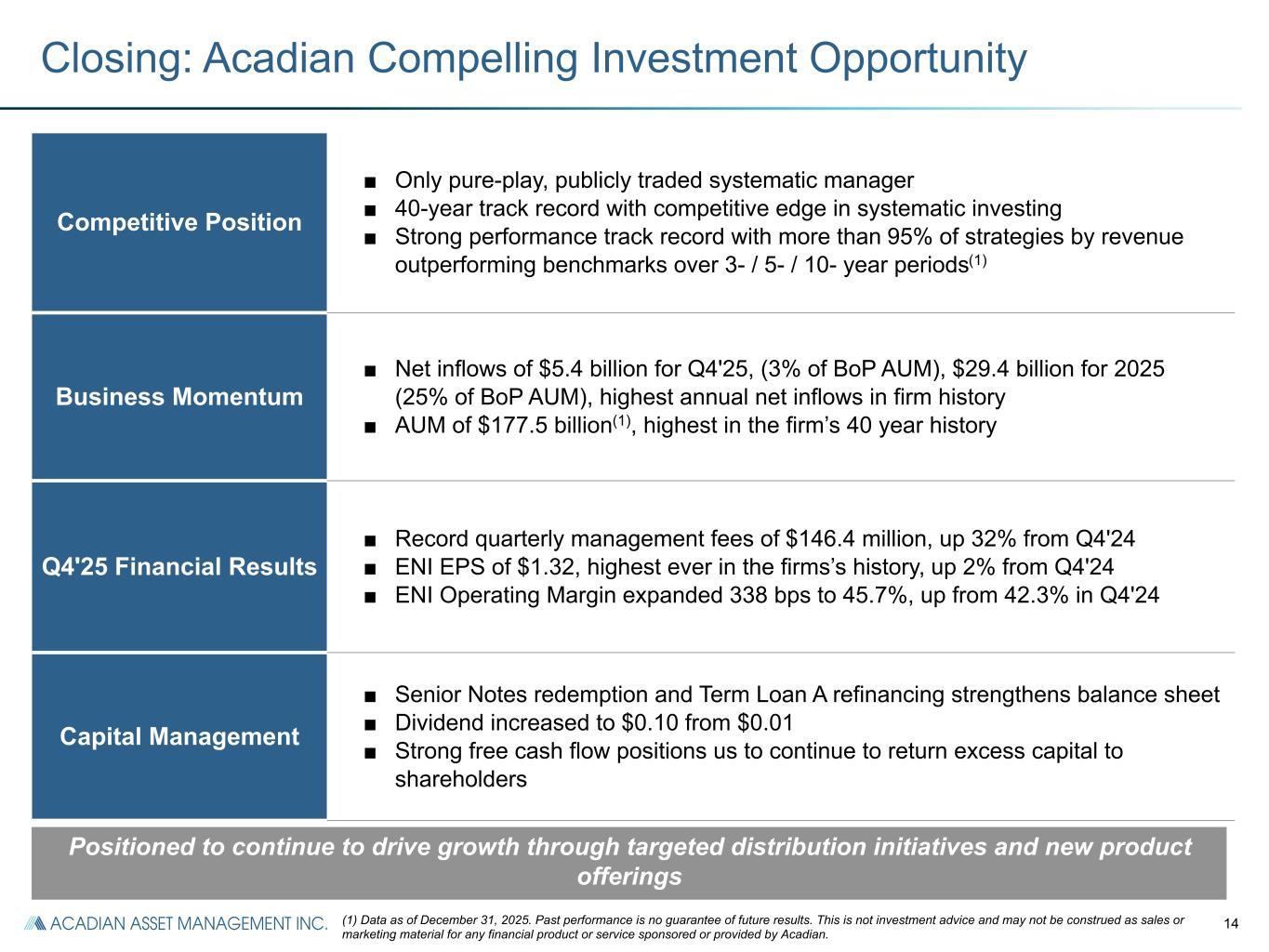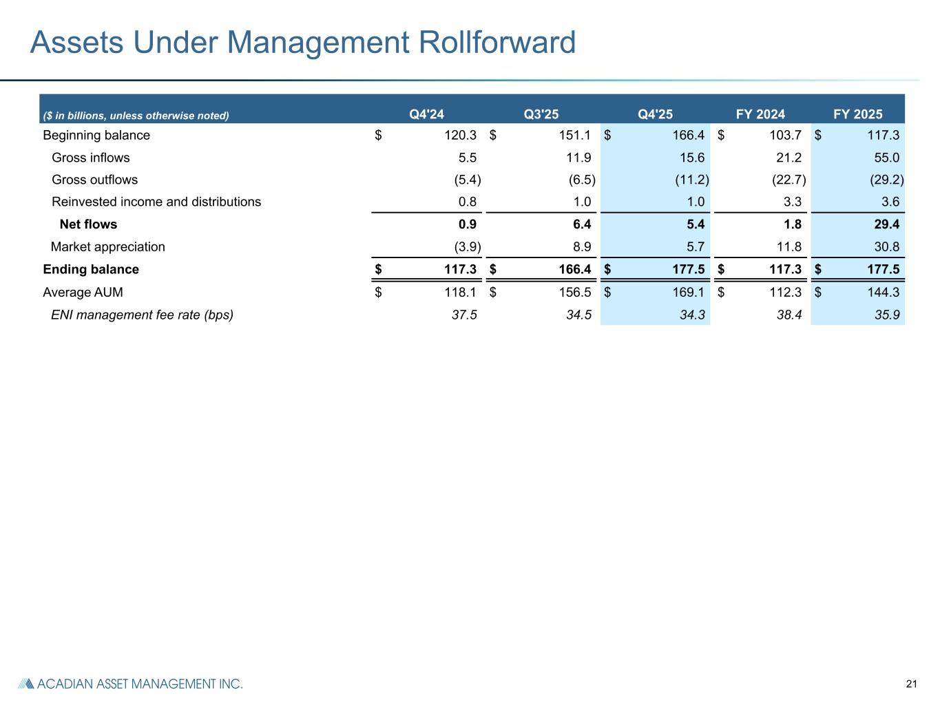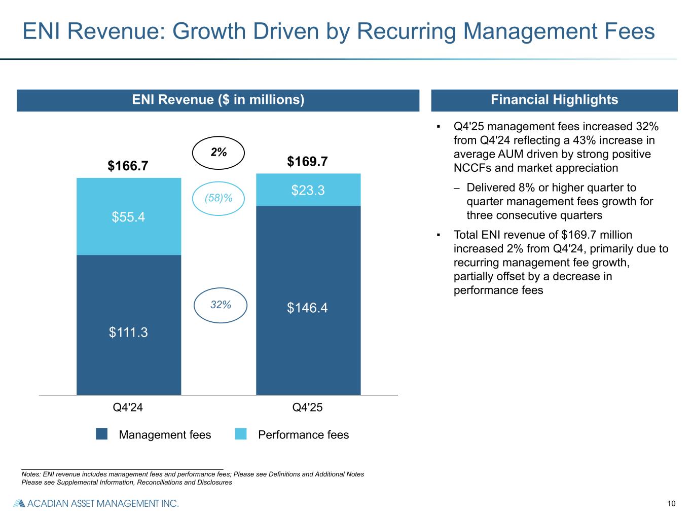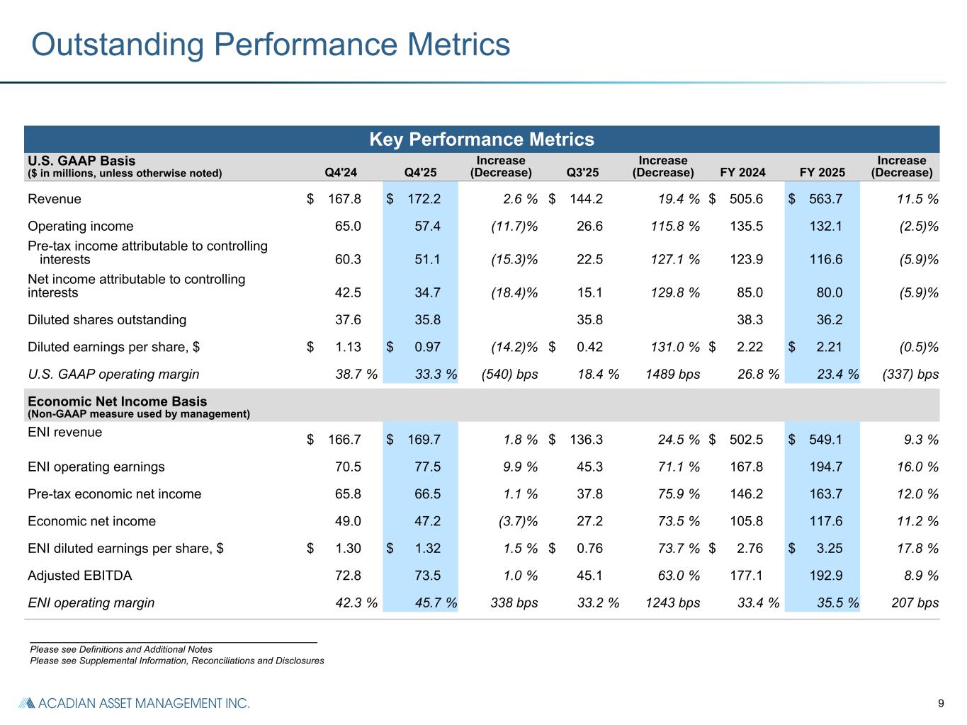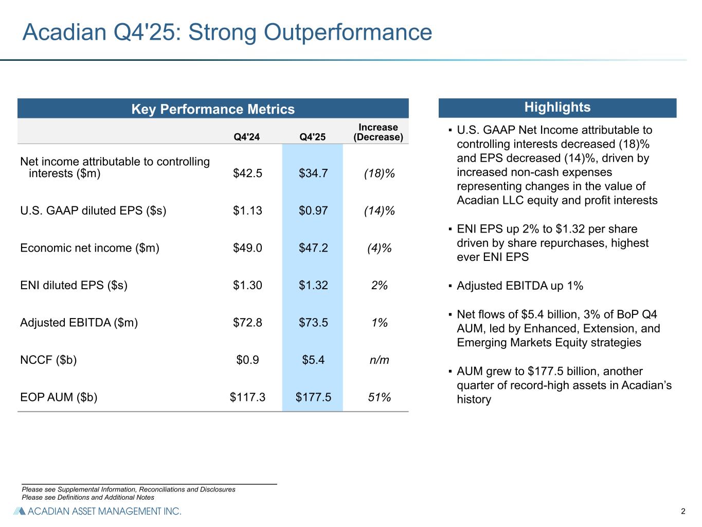 25 Segment Reconciliation ($ in millions) Q4'24 Q4'25 Q3'25 FY 2024 FY 2025 U.S. GAAP Consolidated Revenue $ 167.8 $ 172.2 $ 144.2 $ 505.6 $ 563.7 Exclude revenue from consolidated Funds (a) 1.1 2.5 7.9 3.1 14.6 Quant & Solutions Segment ENI Revenue 166.7 169.7 136.3 502.5 549.1 Quant & Solutions Segment ENI Expenses Fixed compensation and benefits (b) 23.8 23.4 26.4 90.7 96.1 Variable compensation (c) 38.1 30.5 31.1 119.9 121.8 Acadian LLC key employee distributions (d) 2.3 9.1 5.2 9.7 21.4 Depreciation and amortization (e) 4.4 4.1 4.1 18.1 16.6 Other segment items (f) 25.2 29.4 25.3 87.9 101.6 Segment ENI $ 72.9 $ 73.2 $ 44.2 $ 176.2 $ 191.6 Reconciliation of segment ENI to net income attributable to controlling interests: Unallocated Corporate expenses (g) (5.1) (4.8) (4.2) (19.4) (18.3) Adjustments and reconciling items (h) 0.8 1.0 2.9 1.9 6.5 Non-cash compensation expenses for Acadian LLC key employee equity and profit interest revaluations (i) (3.6) (12.0) (16.3) (23.2) (47.7) Investment income (loss) (0.3) (0.2) — 2.2 (0.1) Interest income 0.7 0.9 0.9 3.5 3.7 Interest expense (4.4) (7.0) (4.6) (19.4) (21.7) Loss on extinguishment of debt — (1.4) — — (1.4) Net consolidated funds' investment gains (losses) (2.6) 3.4 11.5 3.9 30.6 Income before Income Taxes $ 58.4 $ 53.1 $ 34.4 $ 125.7 $ 143.2 Income tax expense (17.8) (16.4) (7.4) (38.9) (36.6) Consolidated Net Income $ 40.6 $ 36.7 $ 27.0 $ 86.8 $ 106.6 Net income attributable to non-controlling interests in consolidated Funds 1.9 (2.0) (11.9) (1.8) (26.6) Net income attributable to controlling interests $ 42.5 $ 34.7 $ 15.1 $ 85.0 $ 80.0 (a) Adjusted to exclude consolidated Funds revenues which are included in U.S. GAAP revenue. (b) Fixed compensation and benefits includes base salaries, payroll taxes and the cost of benefit programs provided. (c) Variable compensation is contractually set and calculated individually for Acadian LLC bonuses, adjusted for non-cash Acadian LLC key employee equity revaluations and severance relating to restructuring costs. (d) Acadian LLC key employee distributions includes the share of Acadian LLC profits after variable compensation that is attributable to the Acadian LLC key employee equity and profits interests holders, according to their ownership interests. (e) Depreciation and amortization includes US GAAP depreciation and amortization. (f) Other segment items includes segment systems, portfolio administration costs, sales commissions and other general & administrative expenses. (g) Unallocated corporate expenses include compensation and benefits of $2.8 million and general and administrative expenses of $2.3 million related to Hold Co which are reflected in U.S. GAAP net income attributable to controlling interests for Q4'24. Unallocated corporate expenses include compensation and benefits of $3.2 million and general and administrative expenses of $1.6 million related to Hold Co which are included in U.S. GAAP net income attributable to controlling interests for Q4'25. Unallocated corporate expenses include compensation and benefits of $2.7 million and general and administrative expenses of $1.5 million related to Hold Co which are included in U.S. GAAP net income attributable to controlling interests for Q3'25. Unallocated corporate expenses include compensation and benefits of $10.0 million and general and administrative expenses of $9.4 million related to Hold Co which are included in U.S. GAAP net income attributable to controlling interests for FY 2024. Unallocated corporate expenses include compensation and benefits of $10.9 million and general and administrative expenses of $7.4 million related to Hold Co which are included in U.S. GAAP net income attributable to controlling interests for FY 2025. (h) Adjustments and reconciling items includes consolidated Funds revenue and expense and restructuring costs. (i) Non-cash Acadian LLC key employee equity revaluations represent changes in the value of Acadian LLC equity and profit interests held by Acadian LLC key employees, which are included within U.S. GAAP compensation and benefits expense.