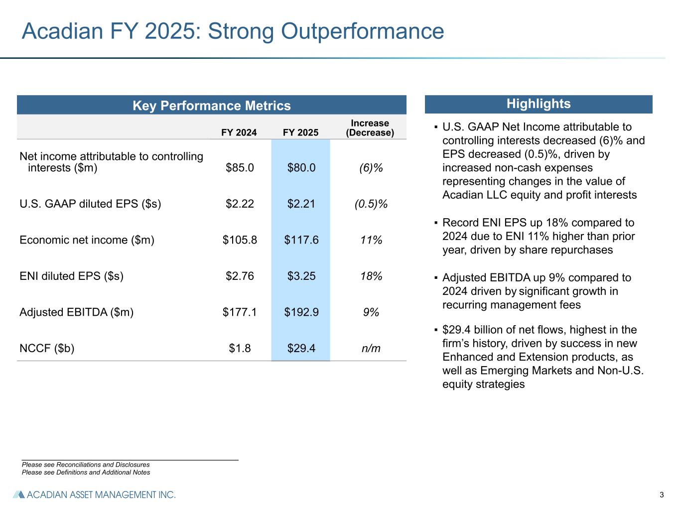 2 Key Performance Metrics Q4'24 Q4'25 Increase (Decrease) Net income attributable to controlling interests ($m) $42.5 $34.7 a s e d (18)% U.S. GAAP diluted EPS ($s) $1.13 $0.97 a s e d (14)% Economic net income ($m) $49.0 $47.2 (4)% ENI diluted EPS ($s) $1.30 $1.32 2% Adjusted EBITDA ($m) $72.8 $73.5 1% NCCF ($b) $0.9 $5.4 n/m EOP AUM ($b) $117.3 $177.5 51% Acadian Q4'25: Strong Outperformance Highlights ▪ U.S. GAAP Net Income attributable to controlling interests decreased (18)% and EPS decreased (14)%, driven by increased non-cash expenses representing changes in the value of Acadian LLC equity and profit interests ▪ ENI EPS up 2% to $1.32 per share driven by share repurchases, highest ever ENI EPS ▪ Adjusted EBITDA up 1% ▪ Net flows of $5.4 billion, 3% of BoP Q4 AUM, led by Enhanced, Extension, and Emerging Markets Equity strategies ▪ AUM grew to $177.5 billion, another quarter of record-high assets in Acadian’s history ___________________________________________________________ Please see Supplemental Information, Reconciliations and Disclosures Please see Definitions and Additional Notes