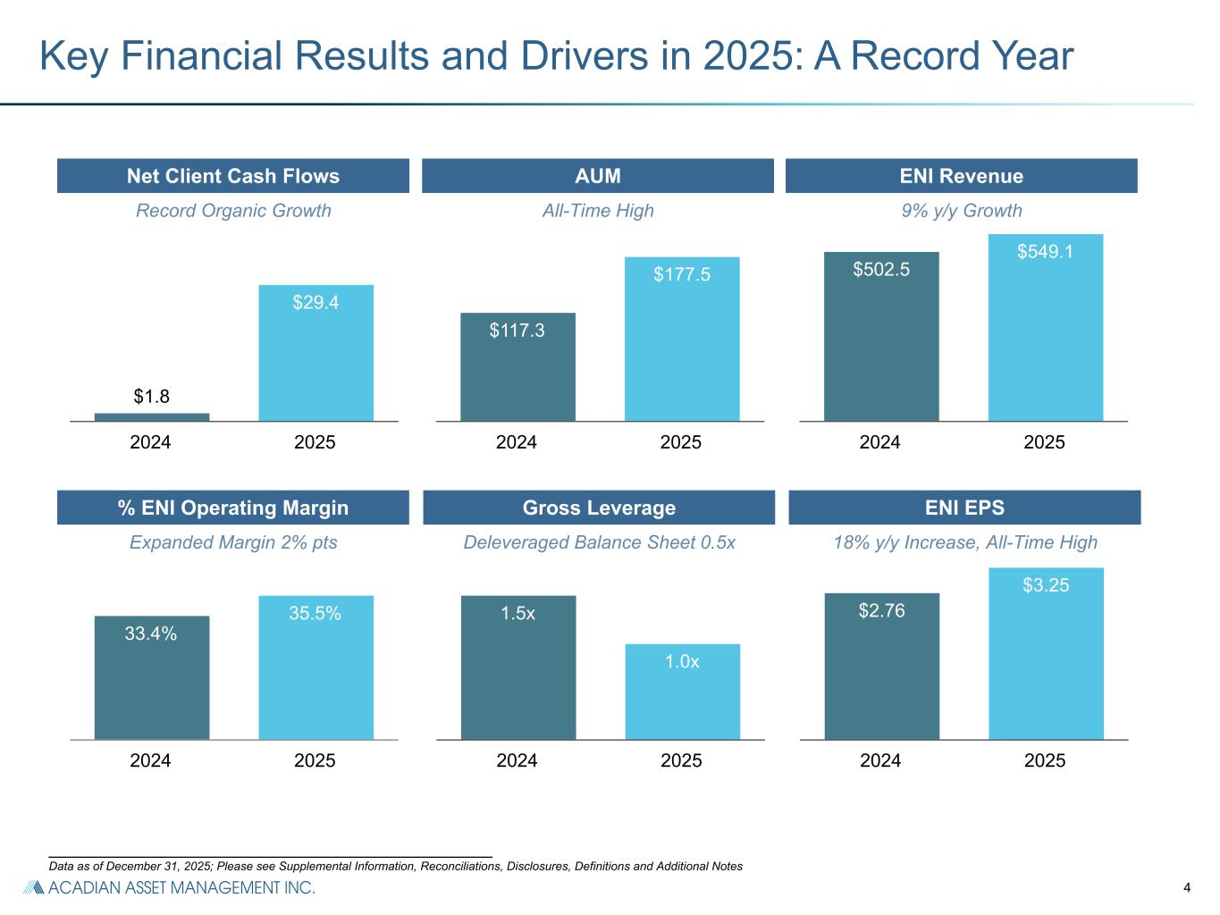 3 Key Performance Metrics FY 2024 FY 2025 Increase (Decrease) Net income attributable to controlling interests ($m) $85.0 $80.0 (6)% U.S. GAAP diluted EPS ($s) $2.22 $2.21 (0.5)% Economic net income ($m) $105.8 $117.6 11% ENI diluted EPS ($s) $2.76 $3.25 18% Adjusted EBITDA ($m) $177.1 $192.9 9% NCCF ($b) $1.8 $29.4 n/m Acadian FY 2025: Strong Outperformance Highlights ___________________________________________________________ Please see Reconciliations and Disclosures Please see Definitions and Additional Notes ▪ U.S. GAAP Net Income attributable to controlling interests decreased (6)% and EPS decreased (0.5)%, driven by increased non-cash expenses representing changes in the value of Acadian LLC equity and profit interests ▪ Record ENI EPS up 18% compared to 2024 due to ENI 11% higher than prior year, driven by share repurchases ▪ Adjusted EBITDA up 9% compared to 2024 driven by significant growth in recurring management fees ▪ $29.4 billion of net flows, highest in the firm’s history, driven by success in new Enhanced and Extension products, as well as Emerging Markets and Non-U.S. equity strategies