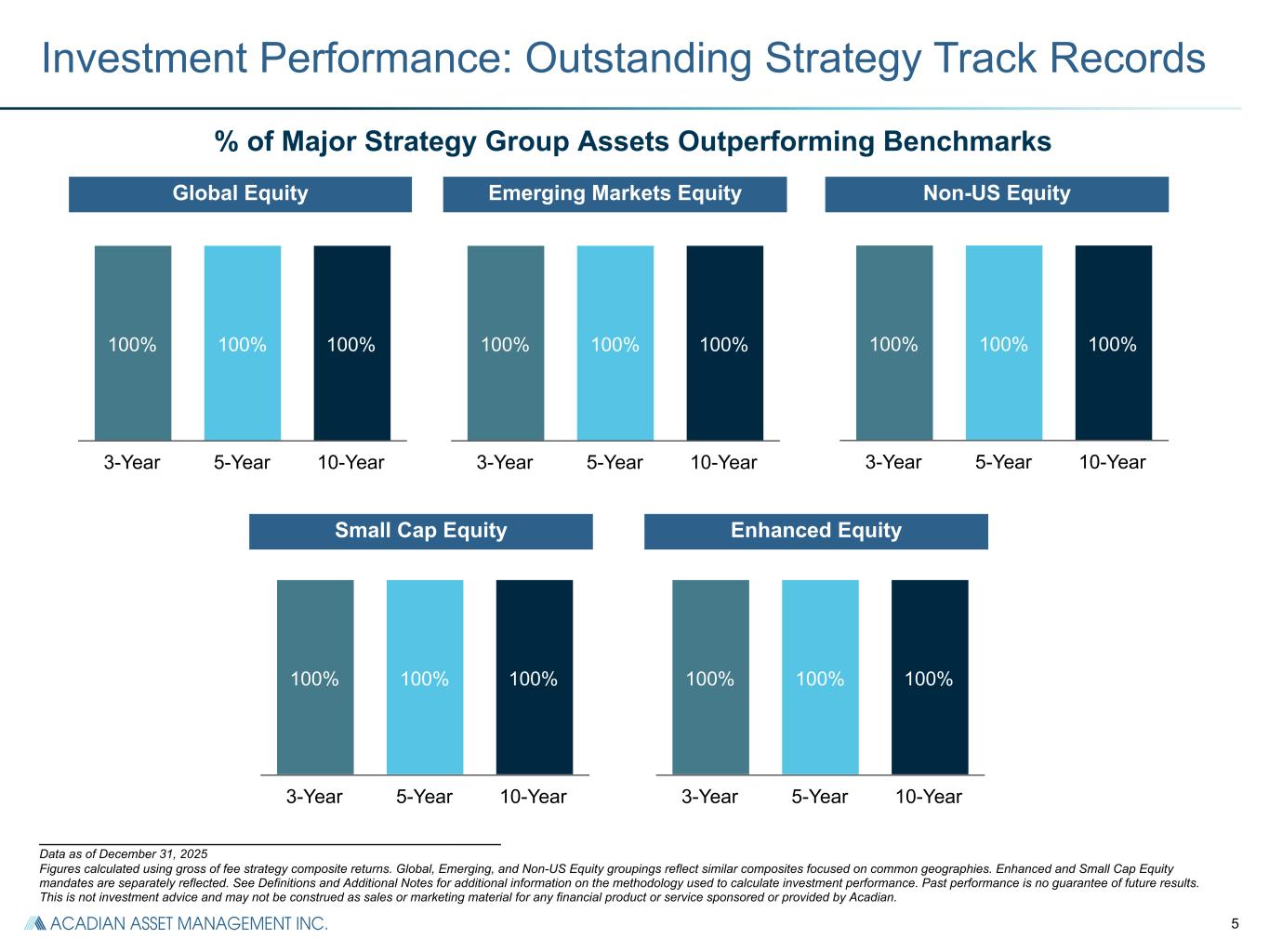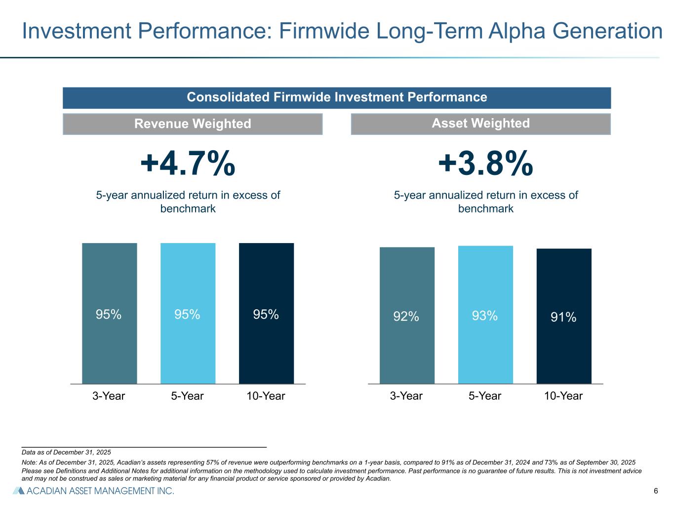 5 100% 100% 100% 3-Year 5-Year 10-Year 100% 100% 100% 3-Year 5-Year 10-Year 100% 100% 100% 3-Year 5-Year 10-Year 100% 100% 100% 3-Year 5-Year 10-Year 100% 100% 100% 3-Year 5-Year 10-Year Global Equity Investment Performance: Outstanding Strategy Track Records % of Major Strategy Group Assets Outperforming Benchmarks Emerging Markets Equity Non-US Equity Small Cap Equity Enhanced Equity ___________________________________________________________ Data as of December 31, 2025 Figures calculated using gross of fee strategy composite returns. Global, Emerging, and Non-US Equity groupings reflect similar composites focused on common geographies. Enhanced and Small Cap Equity mandates are separately reflected. See Definitions and Additional Notes for additional information on the methodology used to calculate investment performance. Past performance is no guarantee of future results. This is not investment advice and may not be construed as sales or marketing material for any financial product or service sponsored or provided by Acadian.