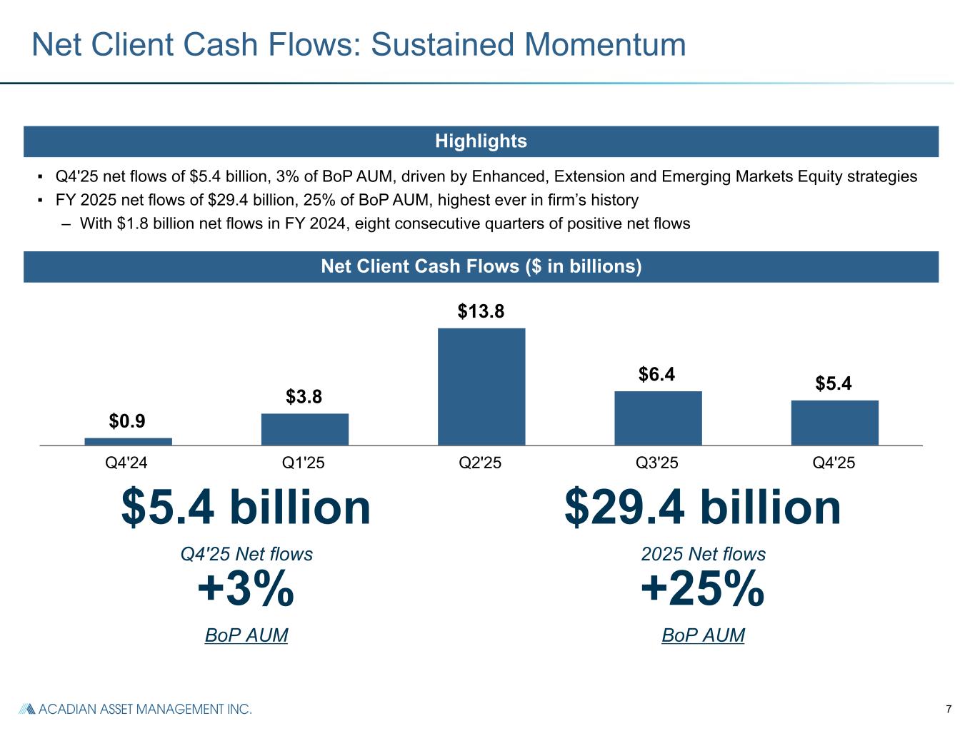 7 $0.9 $3.8 $13.8 $6.4 $5.4 Q4'24 Q1'25 Q2'25 Q3'25 Q4'25 Net Client Cash Flows: Sustained Momentum ▪ Q4'25 net flows of $5.4 billion, 3% of BoP AUM, driven by Enhanced, Extension and Emerging Markets Equity strategies ▪ FY 2025 net flows of $29.4 billion, 25% of BoP AUM, highest ever in firm’s history – With $1.8 billion net flows in FY 2024, eight consecutive quarters of positive net flows Highlights Net Client Cash Flows ($ in billions) $5.4 billion Q4'25 Net flows +3% BoP AUM $29.4 billion 2025 Net flows +25% BoP AUM