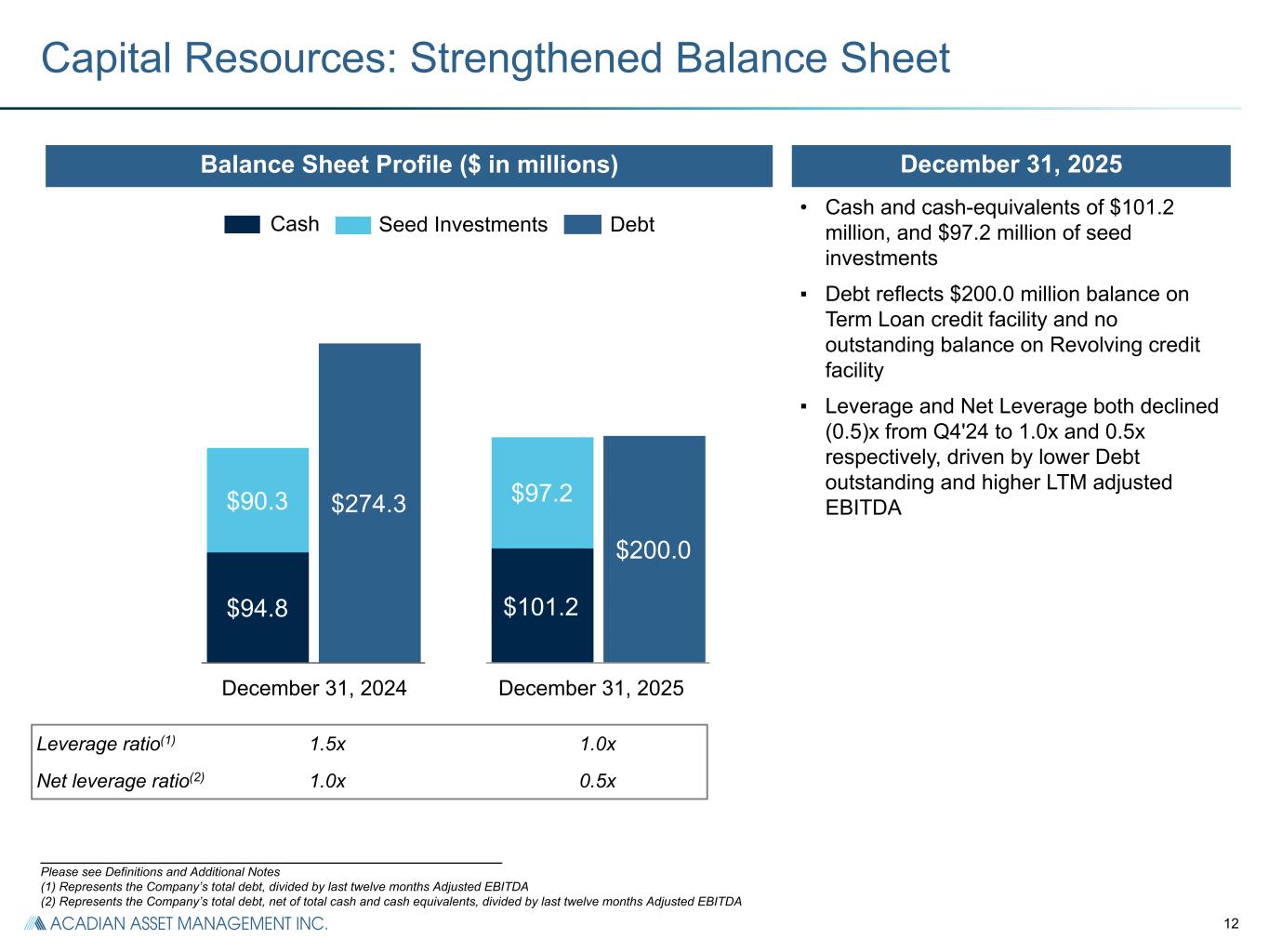 11 $96.2 $92.2 $57.0 $59.9 $39.2 $32.3 Variable Compensation Operating Expenses Q4'24 Q4'25 ENI Expenses and Variable Compensation: Margin Expansion Financial HighlightsENI Operating Expenses and Variable Compensation ($ millions)2% 5% _______________________________________________________ Notes: ENI operating expenses reflect the Company’s operating expenses (excluding variable compensation); Variable compensation is primarily comprised of a contractual percentage of ENI earnings before variable compensation and a contractual split of performance fees, which is awarded to employees and recognized over a contractual vesting period; Variable compensation also includes non-cash compensation in the form of Acadian LLC equity provided through recycling and AAMI equity; (1) Operating Expense (OpEx) Ratio reflects total ENI operating expenses as a percent of management fees and is subject to fluctuations as AUM and ENI management fees change; (2) Variable Compensation (VC) Ratio is calculated as variable compensation divided by ENI earnings before variable compensation. % Operating Margin 42.3% 45.7% % OpEx Ratio (1) 51.2% 40.9% % VC Ratio (2) 35.7% 29.4% (18)% ▪ Q4'25 ENI Operating Expenses increased 5% primarily driven by higher sales-based compensation as well as General and Administrative costs including continued investment in IT and infrastructure – Q4'25 ENI Operating Margin expanded 338 bps y/y to 45.7% mainly driven by increased ENI management fees – Q4'25 Operating Expenses (OpEx) Ratio(1) fell (10)%pts y/y to 40.9% reflecting improved operating leverage ▪ Q4'25 Variable Compensation (VC) decreased (18)% y/y primarily driven by reduced performance fee related compensation – Q4'25 VC Ratio(3) decreased (632) bps y/y to 29.4% – 2025 VC Ratio decreased to 39.4% from 42.3% in 2024 – Assuming revenue mix and levels similar to 2025, contractual allocations would imply a 2026 VC Ratio of 40%-43%,