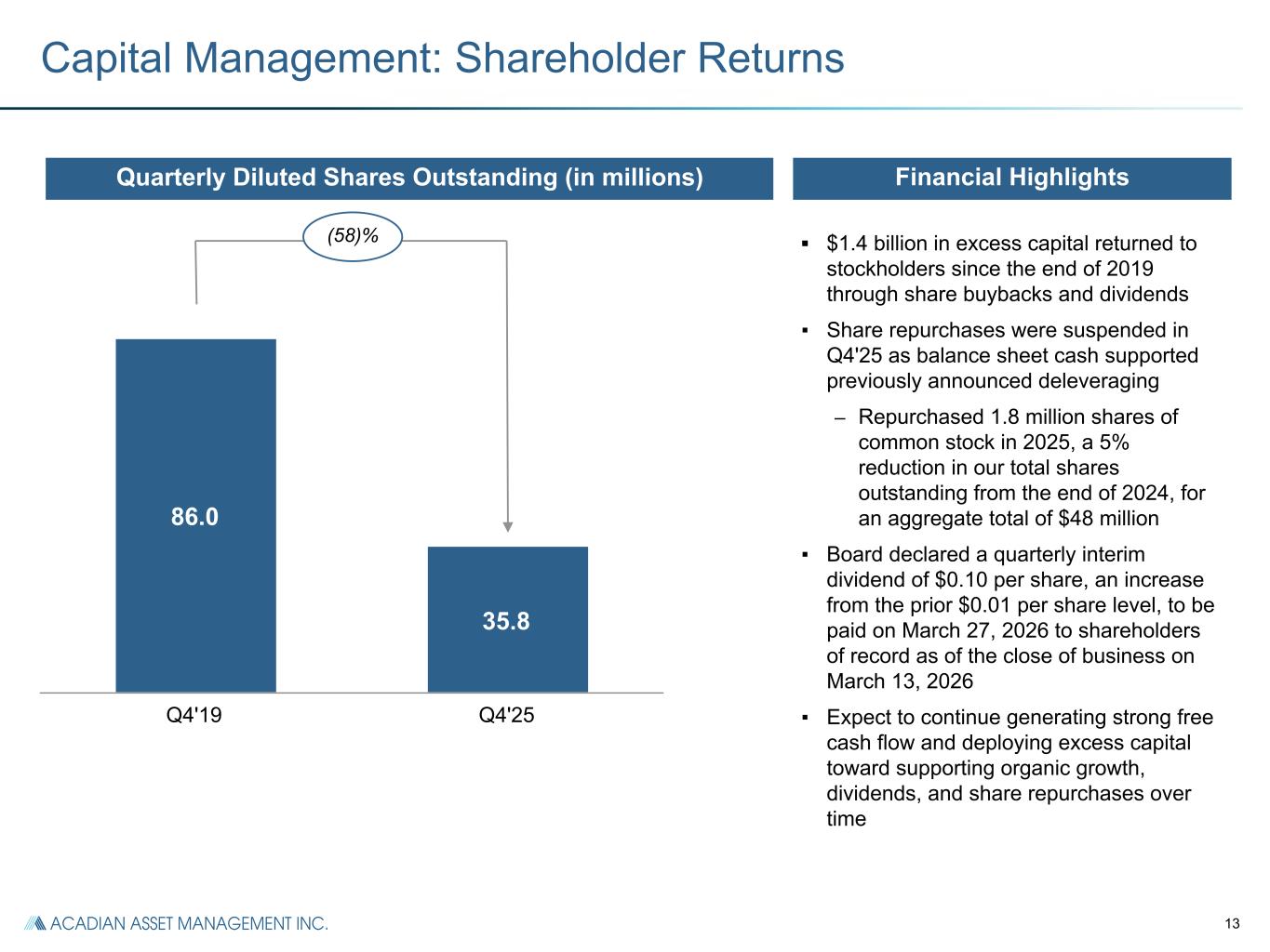 12 $101.2 $97.2 $200.0 ___________________________________________________________ Please see Definitions and Additional Notes (1) Represents the Company’s total debt, divided by last twelve months Adjusted EBITDA (2) Represents the Company’s total debt, net of total cash and cash equivalents, divided by last twelve months Adjusted EBITDA Capital Resources: Strengthened Balance Sheet • Cash and cash-equivalents of $101.2 million, and $97.2 million of seed investments ▪ Debt reflects $200.0 million balance on Term Loan credit facility and no outstanding balance on Revolving credit facility ▪ Leverage and Net Leverage both declined (0.5)x from Q4'24 to 1.0x and 0.5x respectively, driven by lower Debt outstanding and higher LTM adjusted EBITDA December 31, 2025 $94.8 $90.3 $274.3 Cash Debt Balance Sheet Profile ($ in millions) Seed Investments Leverage ratio(1) 1.5x 1.0x Net leverage ratio(2) 1.0x 0.5x December 31, 2024 December 31, 2025
