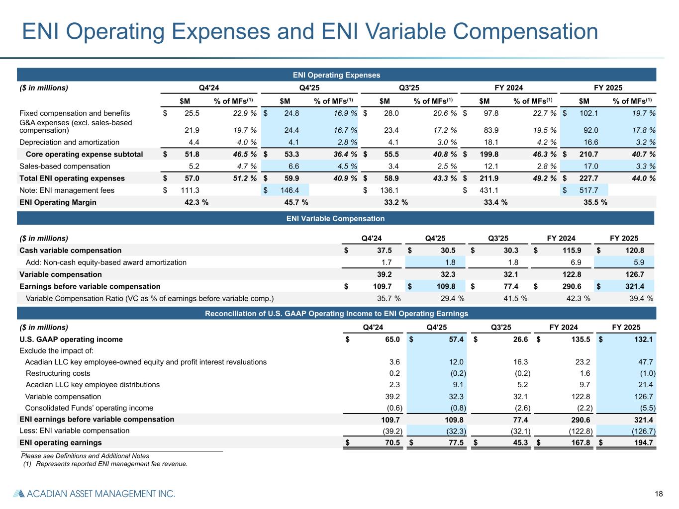 17 U.S. GAAP Statement of Operations ($ in millions, unless otherwise noted) Q4'24 Q4'25 Increase (Decrease) Q3'25 FY 2024 FY 2025 Management fees $ 111.3 $ 146.4 31.5 % $ 136.1 $ 431.1 $ 517.7 Performance fees 55.4 23.3 (57.9) % 0.2 71.4 31.4 Consolidated Funds’ revenue 1.1 2.5 n/m 7.9 3.1 14.6 Total revenue 167.8 172.2 2.6 % 144.2 505.6 563.7 Compensation and benefits 75.6 84.6 11.9 % 84.7 265.5 313.9 General and administrative 22.3 24.4 9.4 % 23.5 85.2 92.0 Depreciation and amortization 4.4 4.1 (6.8) % 4.1 18.5 16.6 Consolidated Funds’ expense 0.5 1.7 n/m 5.3 0.9 9.1 Total operating expenses 102.8 114.8 11.7 % 117.6 370.1 431.6 Operating income 65.0 57.4 (11.7) % 26.6 135.5 132.1 Investment income (loss) (0.3) (0.2) n/m — 2.2 (0.1) Interest income 0.7 0.9 28.6 % 0.9 3.5 3.7 Interest expense (4.4) (7.0) 59.1 % (4.6) (19.4) (21.7) Loss on extinguishment of debt — (1.4) n/m — — (1.4) Net consolidated Funds’ investment gains (2.6) 3.4 n/m 11.5 3.9 30.6 Income before income taxes 58.4 53.1 (9.1) % 34.4 125.7 143.2 Income tax expense 17.8 16.4 (7.9) % 7.4 38.9 36.6 Net income 40.6 36.7 (9.6) % 27.0 86.8 106.6 Net income attributable to non-controlling interests (1.9) 2.0 n/m 11.9 1.8 26.6 Net income attributable to controlling interests $ 42.5 $ 34.7 (18.4) % $ 15.1 $ 85.0 $ 80.0 Earnings per share, basic, $ $ 1.14 $ 0.97 (14.9) % $ 0.42 $ 2.25 $ 2.21 Earnings per share, diluted, $ $ 1.13 $ 0.97 (14.2) % $ 0.42 $ 2.22 $ 2.21 Average basic shares outstanding (in millions) 37.4 35.7 35.8 37.8 36.2 Average diluted shares outstanding (in millions) 37.6 35.8 35.8 38.3 36.2 U.S. GAAP operating margin 39 % 33 % (540) bps 18 % 27 % 23 % Pre-tax income attributable to controlling interests $ 60.3 $ 51.1 (15.3) % $ 22.5 $ 123.9 $ 116.6 Net income attributable to controlling interests $ 42.5 $ 34.7 (18.4) % $ 15.1 $ 85.0 $ 80.0 Q4'25 vs. Q4'24 ▪ Total revenue increased 2.6% from Q4'24 driven by higher management fees reflecting an increase in average AUM in Q4'25 compared to Q4'24 ▪ Operating expenses increased 11.7% from Q4'24 driven by an increase in compensation and benefits expense primarily due to an increase in the value of the equity plan liability and an increase in Acadian LLC key employee distributions in Q4'25 compared to Q4'24 ▪ Income tax expense decreased (7.9)% from Q4'24 as a result of a decrease in pre-tax income attributable to controlling interests ▪ U.S. GAAP net income attributable to controlling interests decreased (18.4)% from Q4'24 primarily due to the increase in operating expenses ▪ Diluted earnings per share decreased (14.2)% from Q4'24 due to lower net income attributable to controlling interests in Q4'25, partially offset by lower diluted shares outstanding ___________________________________________________________ Please see Definitions and Additional Notes