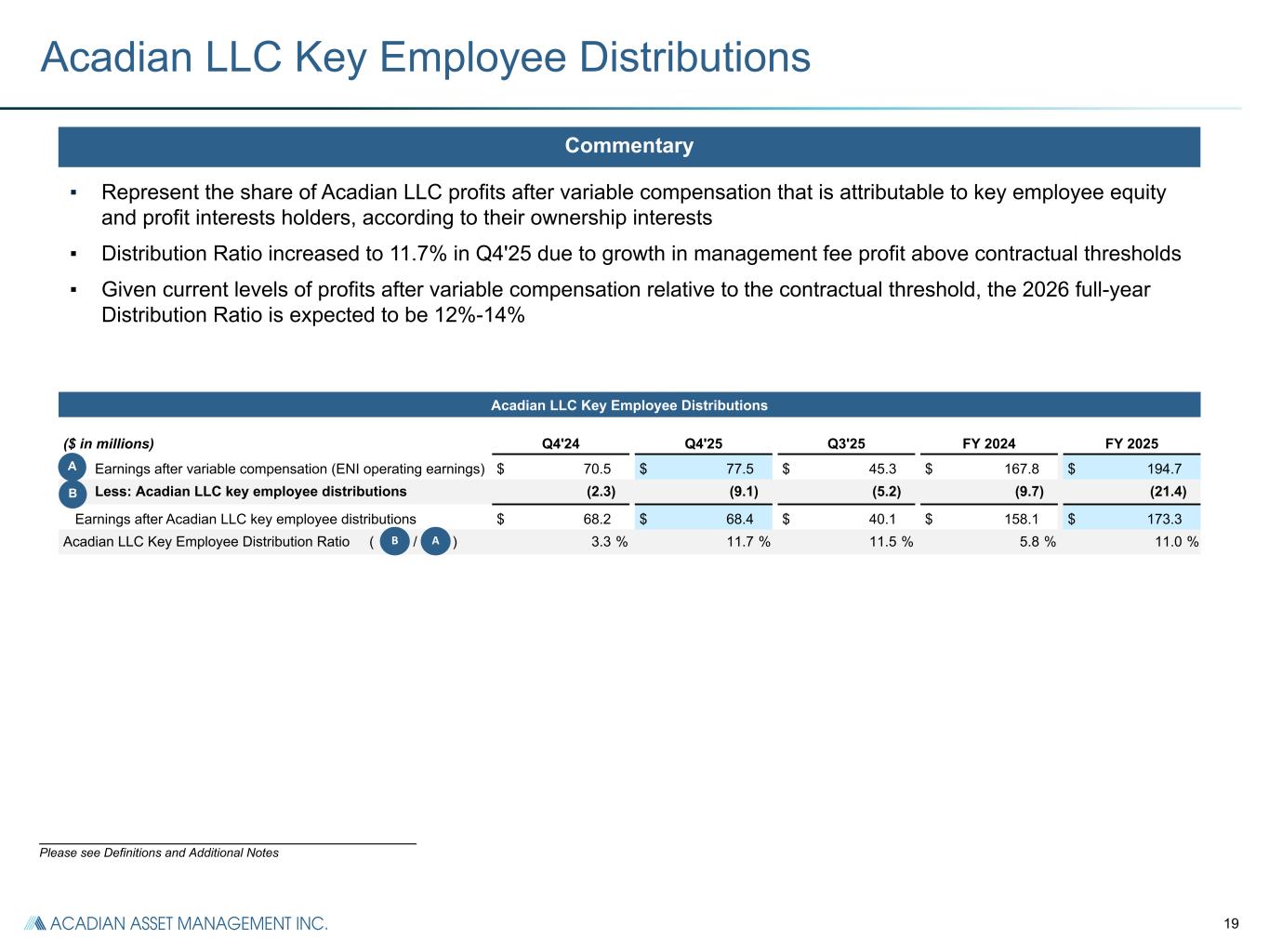18 _______________________________________________________ Please see Definitions and Additional Notes (1) Represents reported ENI management fee revenue. ENI Operating Expenses and ENI Variable Compensation ENI Operating Expenses ($ in millions) Q4'24 Q4'25 Q3'25 FY 2024 FY 2025 $M % of MFs(1) $M % of MFs(1) $M % of MFs(1) $M % of MFs(1) $M % of MFs(1) Fixed compensation and benefits $ 25.5 22.9 % $ 24.8 16.9 % $ 28.0 20.6 % $ 97.8 22.7 % $ 102.1 19.7 % G&A expenses (excl. sales-based compensation) 21.9 19.7 % 24.4 16.7 % 23.4 17.2 % 83.9 19.5 % 92.0 17.8 % Depreciation and amortization 4.4 4.0 % 4.1 2.8 % 4.1 3.0 % 18.1 4.2 % 16.6 3.2 % Core operating expense subtotal $ 51.8 46.5 % $ 53.3 36.4 % $ 55.5 40.8 % $ 199.8 46.3 % $ 210.7 40.7 % Sales-based compensation 5.2 4.7 % 6.6 4.5 % 3.4 2.5 % 12.1 2.8 % 17.0 3.3 % Total ENI operating expenses $ 57.0 51.2 % $ 59.9 40.9 % $ 58.9 43.3 % $ 211.9 49.2 % $ 227.7 44.0 % Note: ENI management fees $ 111.3 $ 146.4 $ 136.1 $ 431.1 $ 517.7 ENI Operating Margin 42.3 % 45.7 % 33.2 % 33.4 % 35.5 % ENI Variable Compensation ($ in millions) Q4'24 Q4'25 Q3'25 FY 2024 FY 2025 Cash variable compensation $ 37.5 $ 30.5 $ 30.3 $ 115.9 $ 120.8 Add: Non-cash equity-based award amortization 1.7 1.8 1.8 6.9 5.9 Variable compensation 39.2 32.3 32.1 122.8 126.7 Earnings before variable compensation $ 109.7 $ 109.8 $ 77.4 $ 290.6 $ 321.4 Variable Compensation Ratio (VC as % of earnings before variable comp.) 35.7 % 29.4 % 41.5 % 42.3 % 39.4 % Reconciliation of U.S. GAAP Operating Income to ENI Operating Earnings ($ in millions) Q4'24 Q4'25 Q3'25 FY 2024 FY 2025 U.S. GAAP operating income $ 65.0 $ 57.4 $ 26.6 $ 135.5 $ 132.1 Exclude the impact of: Acadian LLC key employee-owned equity and profit interest revaluations 3.6 12.0 16.3 23.2 47.7 Restructuring costs 0.2 (0.2) (0.2) 1.6 (1.0) Acadian LLC key employee distributions 2.3 9.1 5.2 9.7 21.4 Variable compensation 39.2 32.3 32.1 122.8 126.7 Consolidated Funds’ operating income (0.6) (0.8) (2.6) (2.2) (5.5) ENI earnings before variable compensation 109.7 109.8 77.4 290.6 321.4 Less: ENI variable compensation (39.2) (32.3) (32.1) (122.8) (126.7) ENI operating earnings $ 70.5 $ 77.5 $ 45.3 $ 167.8 $ 194.7