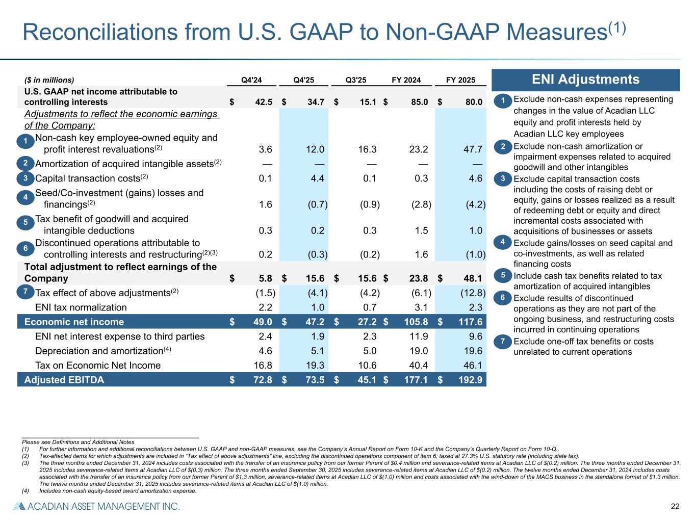 24 Reconciliations from U.S. GAAP to Non-GAAP Measures(1) _______________________________________________________ Please see Definitions and Additional Notes (1) For further information and additional reconciliations between U.S. GAAP and non-GAAP measures, see the Company’s Annual Report on Form 10-K and the Company’s Quarterly Report on Form 10-Q. (2) The three months ended December 31, 2024 includes costs associated with the transfer of an insurance policy from our former Parent of $0.4 million and severance-related items at Acadian LLC of $(0.2) million.The three months ended December 31, 2025 includes severance-related items at Acadian LLC of $(0.3) million.The three months ended September 30, 2025 includes severance-related items at Acadian LLC of $(0.2) million. The twelve months ended December 31, 2024 includes costs associated with the transfer of an insurance policy from our former Parent of $1.3 million, severance-related items at Acadian LLC of $(1.0) million and costs associated with the wind-down of the MACS business in the standalone format of $1.3 million. The twelve months ended December 31, 2025 includes severance-related items at Acadian LLC of $(1.0) million. Reconciliation of U.S. GAAP Pre-tax Income to Pre-tax ENI ($ in millions) Q4'24 Q4'25 Q3'25 FY 2024 FY 2025 U.S. GAAP pre-tax income $ 58.4 $ 53.1 $ 34.4 $ 125.7 $ 143.2 Adjustments to reflect the economic earnings of the Company: Non-cash key employee-owned equity and profit interest revaluations 3.6 12.0 16.3 23.2 47.7 Capital transaction costs 0.1 4.4 0.1 0.3 4.6 Seed/Co-investment (gains) losses and financings 1.6 (0.7) (0.9) (2.8) (4.2) Discontinued operations and restructuring costs(2) 0.2 (0.3) (0.2) 1.6 (1.0) Net income attributable to non-controlling interests 1.9 (2.0) (11.9) (1.8) (26.6) Pre-tax ENI $ 65.8 $ 66.5 $ 37.8 $ 146.2 $ 163.7