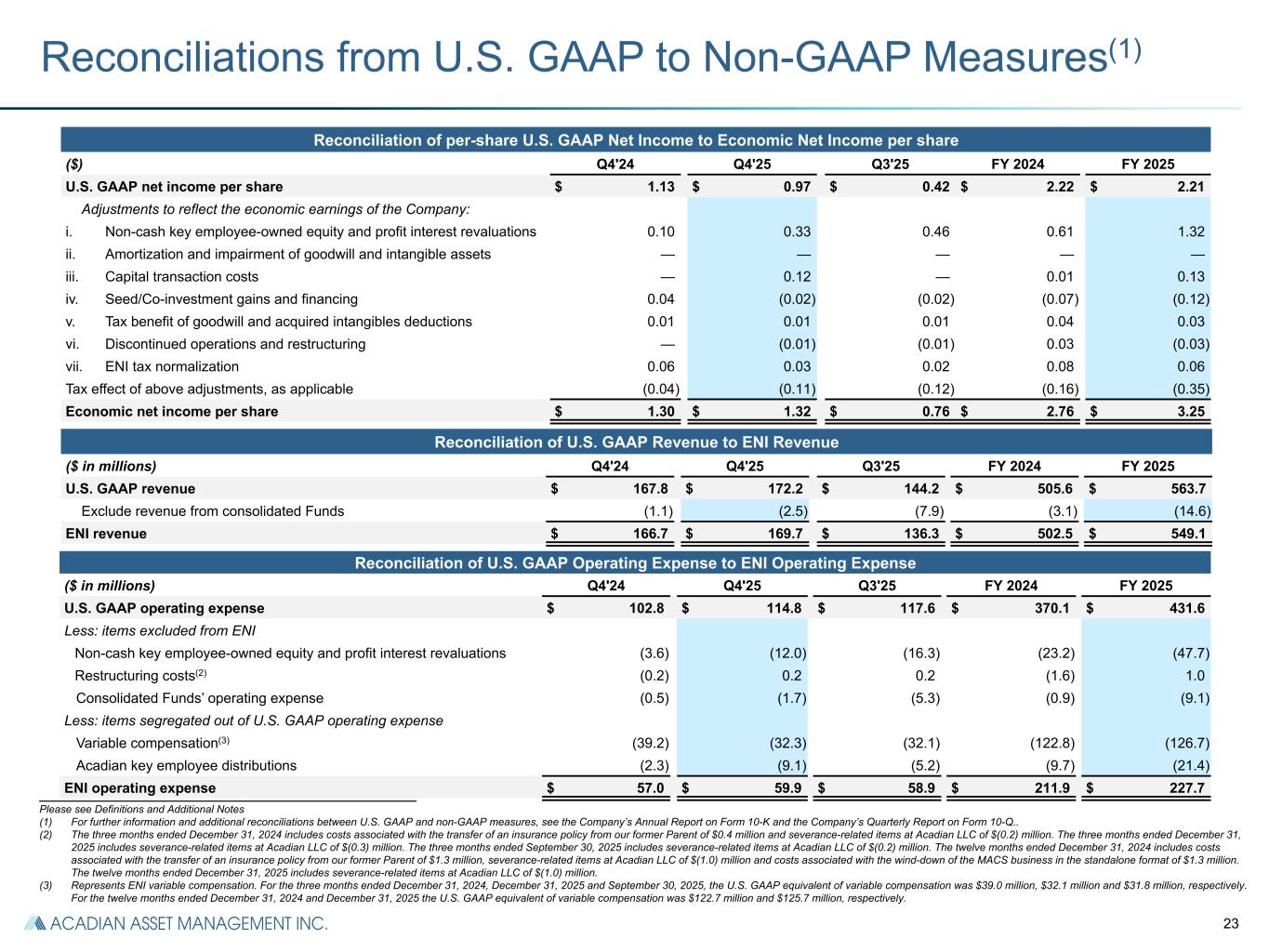 22 ($ in millions) Q4'24 Q4'25 Q3'25 FY 2024 FY 2025 U.S. GAAP net income attributable to controlling interests $ 42.5 $ 34.7 $ 15.1 $ 85.0 $ 80.0 Adjustments to reflect the economic earnings of the Company: Non-cash key employee-owned equity and profit interest revaluations(2) 3.6 12.0 16.3 23.2 47.7 Amortization of acquired intangible assets(2) — — — — — Capital transaction costs(2) 0.1 4.4 0.1 0.3 4.6 Seed/Co-investment (gains) losses and financings(2) 1.6 (0.7) (0.9) (2.8) (4.2) Tax benefit of goodwill and acquired intangible deductions 0.3 0.2 0.3 1.5 1.0 Discontinued operations attributable to controlling interests and restructuring(2)(3) 0.2 (0.3) (0.2) 1.6 (1.0) Total adjustment to reflect earnings of the Company $ 5.8 $ 15.6 $ 15.6 $ 23.8 $ 48.1 Tax effect of above adjustments(2) (1.5) (4.1) (4.2) (6.1) (12.8) ENI tax normalization 2.2 1.0 0.7 3.1 2.3 Economic net income $ 49.0 $ 47.2 $ 27.2 $ 105.8 $ 117.6 ENI net interest expense to third parties 2.4 1.9 2.3 11.9 9.6 Depreciation and amortization(4) 4.6 5.1 5.0 19.0 19.6 Tax on Economic Net Income 16.8 19.3 10.6 40.4 46.1 Adjusted EBITDA $ 72.8 $ 73.5 $ 45.1 $ 177.1 $ 192.9 Reconciliations from U.S. GAAP to Non-GAAP Measures(1) i Exclude non-cash expenses representing changes in the value of Acadian LLC equity and profit interests held by Acadian LLC key employees ii Exclude non-cash amortization or impairment expenses related to acquired goodwill and other intangibles iii Exclude capital transaction costs including the costs of raising debt or equity, gains or losses realized as a result of redeeming debt or equity and direct incremental costs associated with acquisitions of businesses or assets iv Exclude gains/losses on seed capital and co-investments, as well as related financing costs v Include cash tax benefits related to tax amortization of acquired intangibles vi Exclude results of discontinued operations as they are not part of the ongoing business, and restructuring costs incurred in continuing operations vii Exclude one-off tax benefits or costs unrelated to current operations ENI Adjustments 1 3 2 3 4 5 7 6 2 1 4 5 6 7 _______________________________________________________ Please see Definitions and Additional Notes (1) For further information and additional reconciliations between U.S. GAAP and non-GAAP measures, see the Company’s Annual Report on Form 10-K and the Company’s Quarterly Report on Form 10-Q.. (2) Tax-affected items for which adjustments are included in “Tax effect of above adjustments” line, excluding the discontinued operations component of item 6; taxed at 27.3% U.S. statutory rate (including state tax). (3) The three months ended December 31, 2024 includes costs associated with the transfer of an insurance policy from our former Parent of $0.4 million and severance-related items at Acadian LLC of $(0.2) million. The three months ended December 31, 2025 includes severance-related items at Acadian LLC of $(0.3) million. The three months ended September 30, 2025 includes severance-related items at Acadian LLC of $(0.2) million. The twelve months ended December 31, 2024 includes costs associated with the transfer of an insurance policy from our former Parent of $1.3 million, severance-related items at Acadian LLC of $(1.0) million and costs associated with the wind-down of the MACS business in the standalone format of $1.3 million. The twelve months ended December 31, 2025 includes severance-related items at Acadian LLC of $(1.0) million. (4) Includes non-cash equity-based award amortization expense.