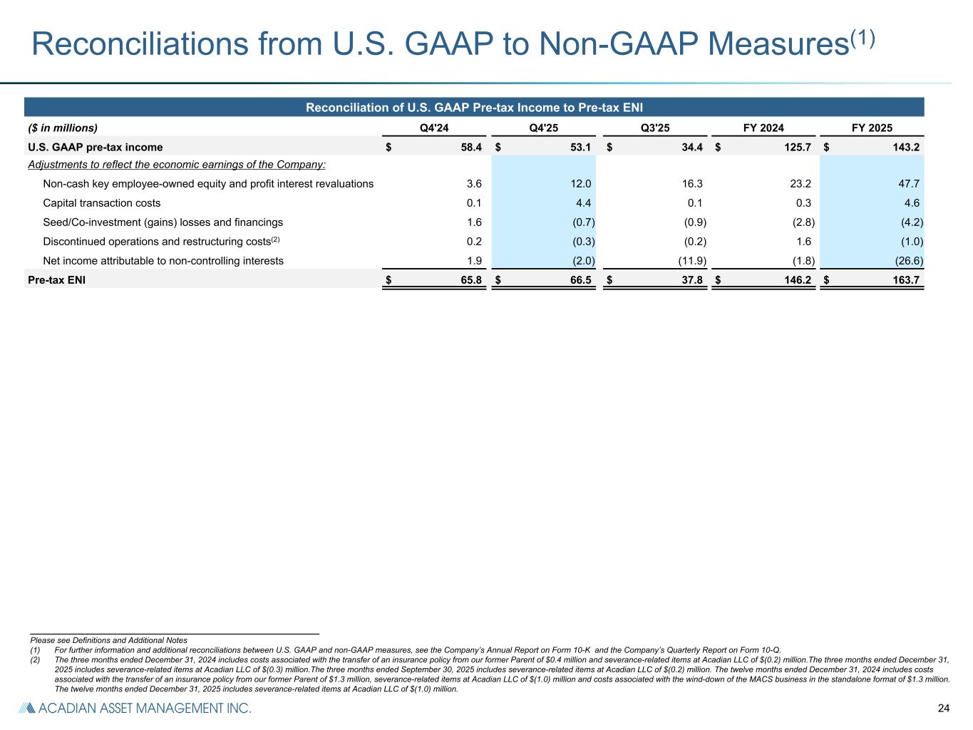 23 Reconciliations from U.S. GAAP to Non-GAAP Measures(1) Reconciliation of per-share U.S. GAAP Net Income to Economic Net Income per share ($) Q4'24 Q4'25 Q3'25 FY 2024 FY 2025 U.S. GAAP net income per share $ 1.13 $ 0.97 $ 0.42 $ 2.22 $ 2.21 Adjustments to reflect the economic earnings of the Company: i. Non-cash key employee-owned equity and profit interest revaluations 0.10 0.33 0.46 0.61 1.32 ii. Amortization and impairment of goodwill and intangible assets — — — — — iii. Capital transaction costs — 0.12 — 0.01 0.13 iv. Seed/Co-investment gains and financing 0.04 (0.02) (0.02) (0.07) (0.12) v. Tax benefit of goodwill and acquired intangibles deductions 0.01 0.01 0.01 0.04 0.03 vi. Discontinued operations and restructuring — (0.01) (0.01) 0.03 (0.03) vii. ENI tax normalization 0.06 0.03 0.02 0.08 0.06 Tax effect of above adjustments, as applicable (0.04) (0.11) (0.12) (0.16) (0.35) Economic net income per share $ 1.30 $ 1.32 $ 0.76 $ 2.76 $ 3.25 Reconciliation of U.S. GAAP Revenue to ENI Revenue ($ in millions) Q4'24 Q4'25 Q3'25 FY 2024 FY 2025 U.S. GAAP revenue $ 167.8 $ 172.2 $ 144.2 $ 505.6 $ 563.7 Exclude revenue from consolidated Funds (1.1) (2.5) (7.9) (3.1) (14.6) ENI revenue $ 166.7 $ 169.7 $ 136.3 $ 502.5 $ 549.1 _______________________________________________________ Please see Definitions and Additional Notes (1) For further information and additional reconciliations between U.S. GAAP and non-GAAP measures, see the Company’s Annual Report on Form 10-K and the Company’s Quarterly Report on Form 10-Q.. (2) The three months ended December 31, 2024 includes costs associated with the transfer of an insurance policy from our former Parent of $0.4 million and severance-related items at Acadian LLC of $(0.2) million. The three months ended December 31, 2025 includes severance-related items at Acadian LLC of $(0.3) million. The three months ended September 30, 2025 includes severance-related items at Acadian LLC of $(0.2) million. The twelve months ended December 31, 2024 includes costs associated with the transfer of an insurance policy from our former Parent of $1.3 million, severance-related items at Acadian LLC of $(1.0) million and costs associated with the wind-down of the MACS business in the standalone format of $1.3 million. The twelve months ended December 31, 2025 includes severance-related items at Acadian LLC of $(1.0) million. (3) Represents ENI variable compensation. For the three months ended December 31, 2024, December 31, 2025 and September 30, 2025, the U.S. GAAP equivalent of variable compensation was $39.0 million, $32.1 million and $31.8 million, respectively. For the twelve months ended December 31, 2024 and December 31, 2025 the U.S. GAAP equivalent of variable compensation was $122.7 million and $125.7 million, respectively. Reconciliation of U.S. GAAP Operating Expense to ENI Operating Expense ($ in millions) Q4'24 Q4'25 Q3'25 FY 2024 FY 2025 U.S. GAAP operating expense $ 102.8 $ 114.8 $ 117.6 $ 370.1 $ 431.6 Less: items excluded from ENI Non-cash key employee-owned equity and profit interest revaluations (3.6) (12.0) (16.3) (23.2) (47.7) Restructuring costs(2) (0.2) 0.2 0.2 (1.6) 1.0 Consolidated Funds’ operating expense (0.5) (1.7) (5.3) (0.9) (9.1) Less: items segregated out of U.S. GAAP operating expense Variable compensation(3) (39.2) (32.3) (32.1) (122.8) (126.7) Acadian key employee distributions (2.3) (9.1) (5.2) (9.7) (21.4) ENI operating expense $ 57.0 $ 59.9 $ 58.9 $ 211.9 $ 227.7