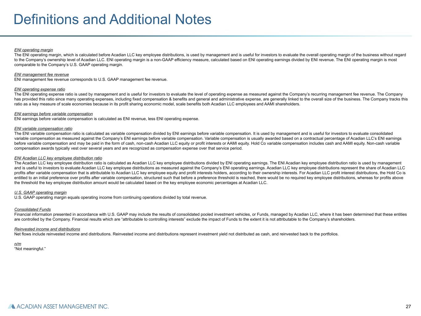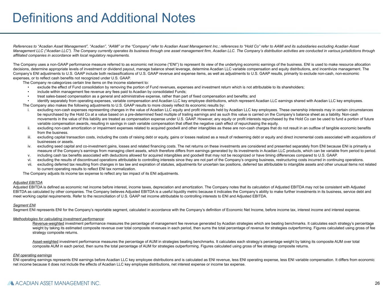 26 References to “Acadian Asset Management”, “Acadian”, “AAMI” or the “Company” refer to Acadian Asset Management Inc.; references to “Hold Co” refer to AAMI and its subsidiaries excluding Acadian Asset Management LLC (“Acadian LLC”). The Company currently operates its business through one asset management firm, Acadian LLC. The Company’s distribution activities are conducted in various jurisdictions through affiliated companies in accordance with local regulatory requirements. The Company uses a non-GAAP performance measure referred to as economic net income (“ENI”) to represent its view of the underlying economic earnings of the business. ENI is used to make resource allocation decisions, determine appropriate levels of investment or dividend payout, manage balance sheet leverage, determine Acadian LLC variable compensation and equity distributions, and incentivize management. The Company’s ENI adjustments to U.S. GAAP include both reclassifications of U.S. GAAP revenue and expense items, as well as adjustments to U.S. GAAP results, primarily to exclude non-cash, non-economic expenses, or to reflect cash benefits not recognized under U.S. GAAP. The Company re-categorizes certain line items on the income statement to: • exclude the effect of Fund consolidation by removing the portion of Fund revenues, expenses and investment return which is not attributable to its shareholders; • include within management fee revenue any fees paid to Acadian by consolidated Funds; • treat sales-based compensation as a general and administrative expense, rather than part of fixed compensation and benefits; and • identify separately from operating expenses, variable compensation and Acadian LLC key employee distributions, which represent Acadian LLC earnings shared with Acadian LLC key employees. The Company also makes the following adjustments to U.S. GAAP results to more closely reflect its economic results by: i. excluding non-cash expenses representing changes in the value of Acadian LLC equity and profit interests held by Acadian LLC key employees. These ownership interests may in certain circumstances be repurchased by the Hold Co at a value based on a pre-determined fixed multiple of trailing earnings and as such this value is carried on the Company’s balance sheet as a liability. Non-cash movements in the value of this liability are treated as compensation expense under U.S. GAAP. However, any equity or profit interests repurchased by the Hold Co can be used to fund a portion of future variable compensation awards, resulting in savings in cash variable compensation that offset the negative cash effect of repurchasing the equity. ii. excluding non-cash amortization or impairment expenses related to acquired goodwill and other intangibles as these are non-cash charges that do not result in an outflow of tangible economic benefits from the business. iii. excluding capital transaction costs, including the costs of raising debt or equity, gains or losses realized as a result of redeeming debt or equity and direct incremental costs associated with acquisitions of businesses or assets. iv. excluding seed capital and co-investment gains, losses and related financing costs. The net returns on these investments are considered and presented separately from ENI because ENI is primarily a measure of the Company’s earnings from managing client assets, which therefore differs from earnings generated by its investments in Acadian LLC products, which can be variable from period to period. v. including cash tax benefits associated with deductions allowed for acquired intangibles and goodwill that may not be recognized or have timing differences compared to U.S. GAAP. vi. excluding the results of discontinued operations attributable to controlling interests since they are not part of the Company’s ongoing business, restructuring costs incurred in continuing operations. vii. excluding deferred tax resulting from changes in tax law and expiration of statutes, adjustments for uncertain tax positions, deferred tax attributable to intangible assets and other unusual items not related to current operating results to reflect ENI tax normalization. The Company adjusts its income tax expense to reflect any tax impact of its ENI adjustments. Adjusted EBITDA Adjusted EBITDA is defined as economic net income before interest, income taxes, depreciation and amortization. The Company notes that its calculation of Adjusted EBITDA may not be consistent with Adjusted EBITDA as calculated by other companies. The Company believes Adjusted EBITDA is a useful liquidity metric because it indicates the Company’s ability to make further investments in its business, service debt and meet working capital requirements. Refer to the reconciliation of U.S. GAAP net income attributable to controlling interests to ENI and Adjusted EBITDA. Segment ENI Segment ENI represents ENI for the Company’s reportable segment, calculated in accordance with the Company’s definition of Economic Net Income, before income tax, interest income and interest expense. Methodologies for calculating investment performance: Revenue-weighted investment performance measures the percentage of management fee revenue generated by Acadian strategies which are beating benchmarks. It calculates each strategy’s percentage weight by taking its estimated composite revenue over total composite revenues in each period, then sums the total percentage of revenue for strategies outperforming. Figures calculated using gross of fee strategy composite returns. Asset-weighted investment performance measures the percentage of AUM in strategies beating benchmarks. It calculates each strategy’s percentage weight by taking its composite AUM over total composite AUM in each period, then sums the total percentage of AUM for strategies outperforming. Figures calculated using gross of fee strategy composite returns. ENI operating earnings ENI 