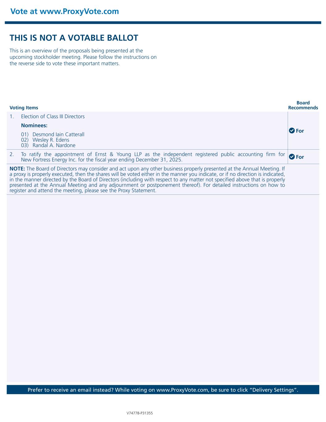 Vote at www.ProxyVote.com Prefer to receive an email instead? While voting on www.ProxyVote.com, be sure to click “Delivery Settings”. V74778-P31355 Voting Items Board Recommends THIS IS NOT A VOTABLE BALLOT This is an overview of the proposals being presented at the upcoming stockholder meeting. Please follow the instructions on the reverse side to vote these important matters. 1. Election of Class III Directors For Nominees: 01) Desmond Iain Catterall 02) Wesley R. Edens 03) Randal A. Nardone 2. To ratify the appointment of Ernst & Young LLP as the independent registered public accounting firm for New Fortress Energy Inc. for the fiscal year ending December 31, 2025. For NOTE: The Board of Directors may consider and act upon any other business properly presented at the Annual Meeting. If a proxy is properly executed, then the shares will be voted either in the manner you indicate, or if no direction is indicated, in the manner directed by the Board of Directors (including with respect to any matter not specified above that is properly presented at the Annual Meeting and any adjournment or postponement thereof). For detailed instructions on how to register and attend the meeting, please see the Proxy Statement.