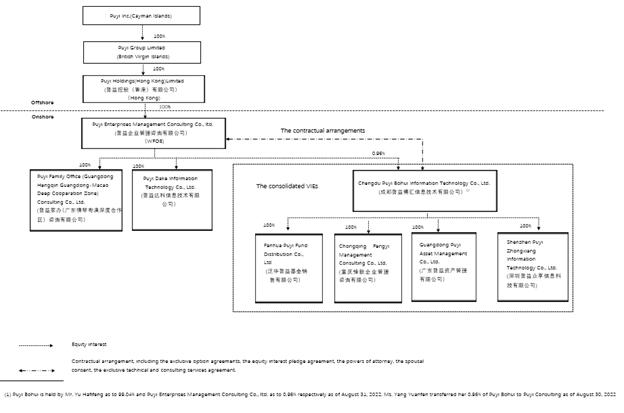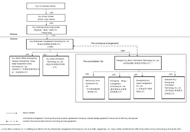 Puyi Inc. is not an operating company but a Cayman Islands holding company with operations primarily conducted by its subsidiaries and by the consolidated VIEs based in China through contractual arrangements. Due to the PRC legal restrictions on foreign investment in wealth and asset management businesses when our group was established, which restrictions were removed from the Special Administrative Measures (Negative List) for Foreign Investment Access (2020 Edition), we operate a significant part of our business through contractual arrangements between the VIE and Puyi Inc.’s subsidiary. The contractual arrangements are not equivalent to an equity ownership in the business of the consolidated VIEs. As of the date of this annual report, we owned only 0.96% equity interests in the consolidated VIEs through our WFOE, and thus may be unable to enforce the terms of the contractual arrangements. Any reference to control or benefits that accrue to us because of the contractual arrangement with the consolidated VIEs are limited to and subject to conditions that we have satisfied for consolidation of the VIEs under U.S. GAAP. Puyi Inc. consolidates the operations and financial results of the consolidated VIEs in its financial statements as the primary beneficiary for accounting purposes. Investors in our ADSs thus are not purchasing equity interest in the consolidated VIEs in China (except for the 0.96% equity interests we own in the consolidated VIEs) but instead are purchasing equity interest in a Cayman Islands holding company.
