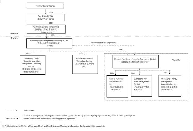 Puyi Inc. is not an operating company but a Cayman Islands holding company with operations primarily conducted by its subsidiaries and by the VIEs based in China through contractual arrangements. Due to the PRC legal restrictions on foreign investment in wealth and asset management businesses when our group was established, which restrictions were removed from the Special Administrative Measures (Negative List) for Foreign Investment Access (2020 Edition), we operate a significant part of our business through contractual arrangements between the VIE and our WFOE. The contractual arrangements are not equivalent to an equity ownership in the business of the VIEs. As of the date of this annual report, we owned only 0.96% equity interests in the VIEs through our WFOE, and thus may be unable to enforce the terms of the contractual arrangements. Any reference to control or benefits that accrue to us because of the contractual arrangement with the VIEs are limited to and subject to conditions that we have satisfied for consolidation of the VIEs under U.S. GAAP. Puyi Inc. consolidates the operations and financial results of the VIEs in its financial statements as the primary beneficiary for accounting purposes. In addition, we, through the VIEs, hold the required licenses and permits necessary to conduct our business in China. Investors in our ADSs thus are not purchasing equity interest in the VIEs in China (except for the 0.96% equity interests we own in the VIEs) but instead are purchasing equity interest in a Cayman Islands holding company.