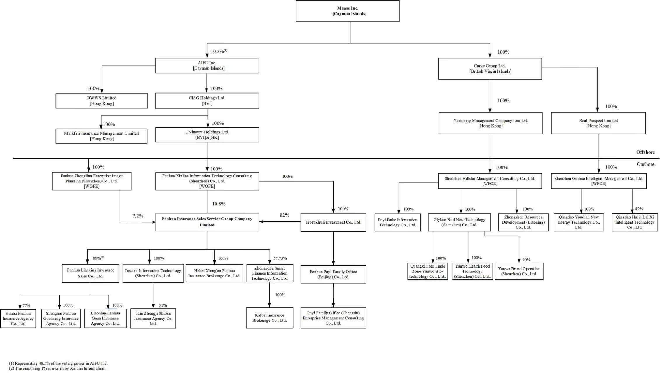 | ● | “the consolidated VIEs” refer to Chengdu Puyi Bohui Information Technology Co., Ltd., or Puyi Bohui (成都普益博汇信息技术有限公司), Shenzhen Xinbao Investment Management Co., Ltd., or Xinbao Investment (深圳新保投资管理有限公司), Fanhua RONS (Beijing) Technologies Co., Ltd., or RONS Technologies (泛华榕数(北京)科技有限公司) and their respective subsidiaries, all of which were consolidated in the financial statements of Maase Inc. in the reporting periods of this annual report, the primary beneficiary through the contractual arrangements, in accordance with U.S. GAAP; |