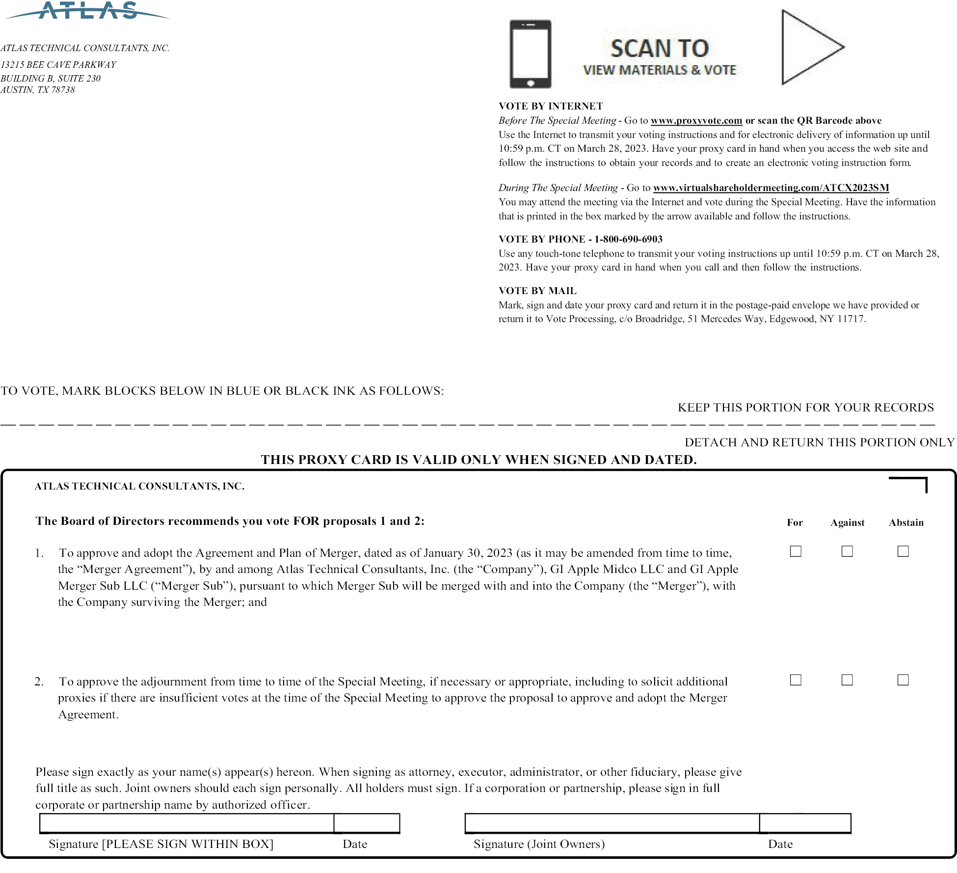 ATLAS TECHNICAL CONSULTANTS, INC. 13215 BEE CAVE PARKWAY BUILDING B, SUITE 230 AUSTIN, TX 78738 VOTE BY INTERNET Before The Special Meeting - Go to www.proxyvote.com or scan the QR Barcode above Use the Internet to transmit your voting instructions and for electronic delivery of information up until 10:59 p.m. CT on March 28, 2023. Have your proxy card in hand when you access the web site and follow the instructions to obtain your records and to create an electronic voting instruction form. During The Special Meeting - Go to www.virtualshareholdermeeting.com/ATCX2023SM You may attend the meeting via the Internet and vote during the Special Meeting. Have the information that is printed in the box marked by the arrow available and follow the instructions. VOTE BY PHONE - 1-800-690-6903 Use any touch-tone telephone to transmit your voting instructions up until 10:59 p.m. CT on March 28, 2023. Have your proxy card in hand when you call and then follow the instructions. VOTE BY MAIL Mark, sign and date your proxy card and return it in the postage-paid envelope we have provided or return it to Vote Processing, c/o Broadridge, 51 Mercedes Way, Edgewood, NY 11717. TO VOTE, MARK BLOCKS BELOW IN BLUE OR BLACK INK AS FOLLOWS: KEEP THIS PORTION FOR YOUR RECORDS DETACH AND RETURN THIS PORTION ONLY THIS PROXY CARD IS VALID ONLY WHEN SIGNED AND DATED. ATLAS TECHNICAL CONSULTANTS, INC. The Board of Directors recommends you vote FOR proposals 1 and 2: For Against Abstain 1. To approve and adopt the Agreement and Plan of Merger, dated as of January 30, 2023 (as it may be amended from time to time, the “Merger Agreement”), by and among Atlas Technical Consultants, Inc. (the “Company”), GI Apple Midco LLC and GI Apple Merger Sub LLC (“Merger Sub”), pursuant to which Merger Sub will be merged with and into the Company (the “Merger”), with the Company surviving the Merger; and 2. To approve the adjournment from time to time of the Special Meeting, if necessary or appropriate, including to solicit additional proxies if there are insufficient votes at the time of the Special Meeting to approve the proposal to approve and adopt the Merger Agreement. Please sign exactly as your name(s) appear(s) hereon. When signing as attorney, executor, administrator, or other fiduciary, please give full title as such. Joint owners should each sign personally. All holders must sign. If a corporation or partnership, please sign in full corporate or partnership name by authorized officer. Signature [PLEASE SIGN WITHIN BOX] Date Signature (Joint Owners) Date