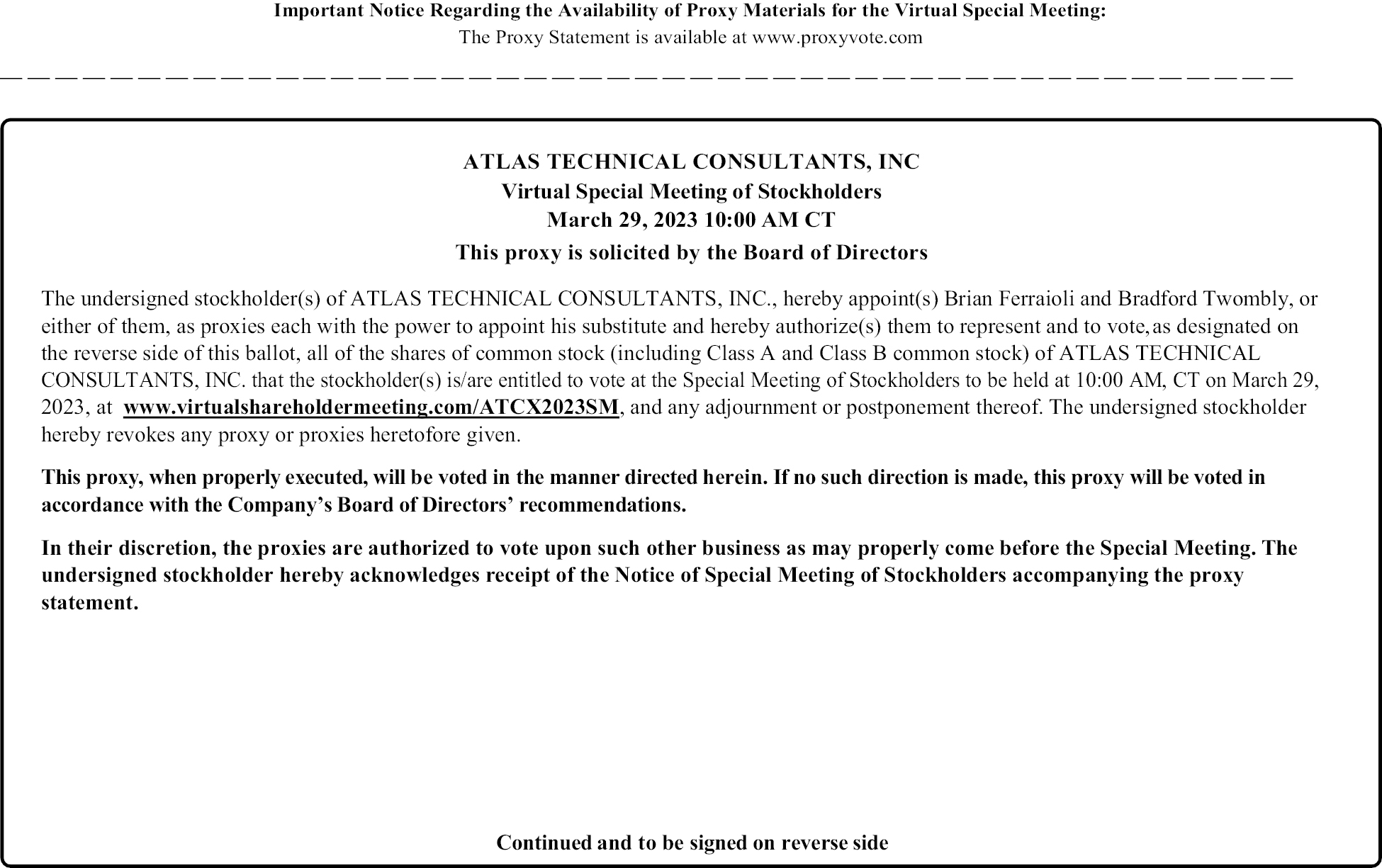 Important Notice Regarding the Availability of Proxy Materials for the Virtual Special Meeting: The Proxy Statement is available at www.proxyvote.com ATLAS TECHNICAL CONSULTANTS, INC Virtual Special Meeting of Stockholders March 29, 2023 10.00 AM CT This proxy is solicited by the Board of Directors The undersigned stockholder(s) of ATLAS TECHNICAL CONSULTANTS, INC., hereby appoint(s) Brian Ferraioli and Bradford Twombly, or either of them, as proxies each with the power to appoint his substitute and hereby authorize(s) them to represent and to vote, as designated on the reverse side of this ballot, all of the shares of common stock (including Class A and Class B common stock) of ATLAS TECHNICAL CONSULTANTS, INC. that the stockholder(s) is/are entitled to vote at the Special Meeting of Stockholders to be held at 10:00 AM, CT on March 29, 2023, at www.virtualshareholdermeeting.com/ATCX2023SM, and any adjournment or postponement thereof. The undersigned stockholder hereby revokes any proxy or proxies heretofore given. This proxy, when properly executed, will be voted in the manner directed herein. If no such direction is made, this proxy will be voted in accordance with the Company’s Board of Directors’ recommendations. In their discretion, the proxies are authorized to vote upon such other business as may properly come before the Special Meeting. The undersigned stockholder hereby acknowledges receipt of the Notice of Special Meeting of Stockholders accompanying the proxy statement. Continued and to be signed on reverse side