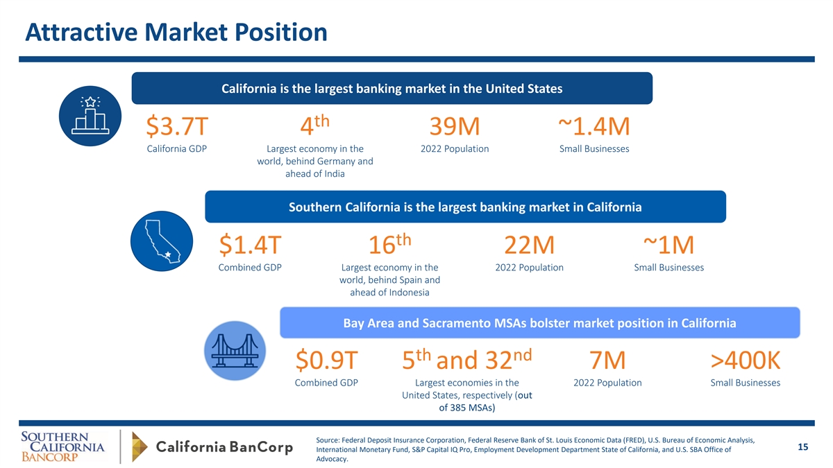 Attractive Market Position California is the largest banking market in the United States th $3.7T 4 39M ~1.4M California GDP Largest economy in the 2022 Population Small Businesses world, behind Germany and ahead of India Southern California is the largest banking market in California th $1.4T 16 22M ~1M Combined GDP Largest economy in the 2022 Population Small Businesses world, behind Spain and ahead of Indonesia Bay Area and Sacramento MSAs bolster market position in California th nd $0.9T 5 and 32 7M >400K Combined GDP Largest economies in the 2022 Population Small Businesses United States, respectively (out of 385 MSAs) Source: Federal Deposit Insurance Corporation, Federal Reserve Bank of St. Louis Economic Data (FRED), U.S. Bureau of Economic Analysis, 15 International Monetary Fund, S&P Capital IQ Pro, Employment Development Department State of California, and U.S. SBA Office of Advocacy.