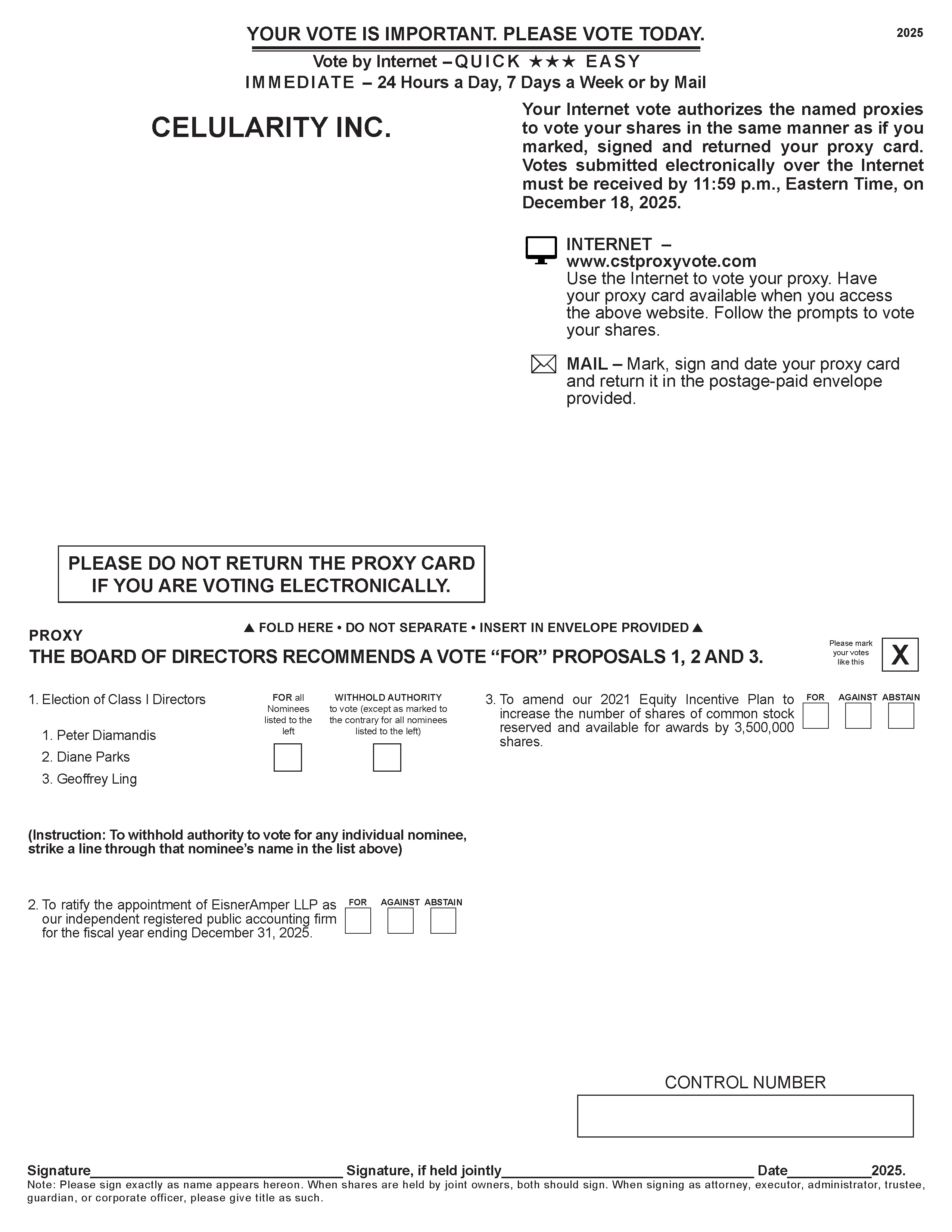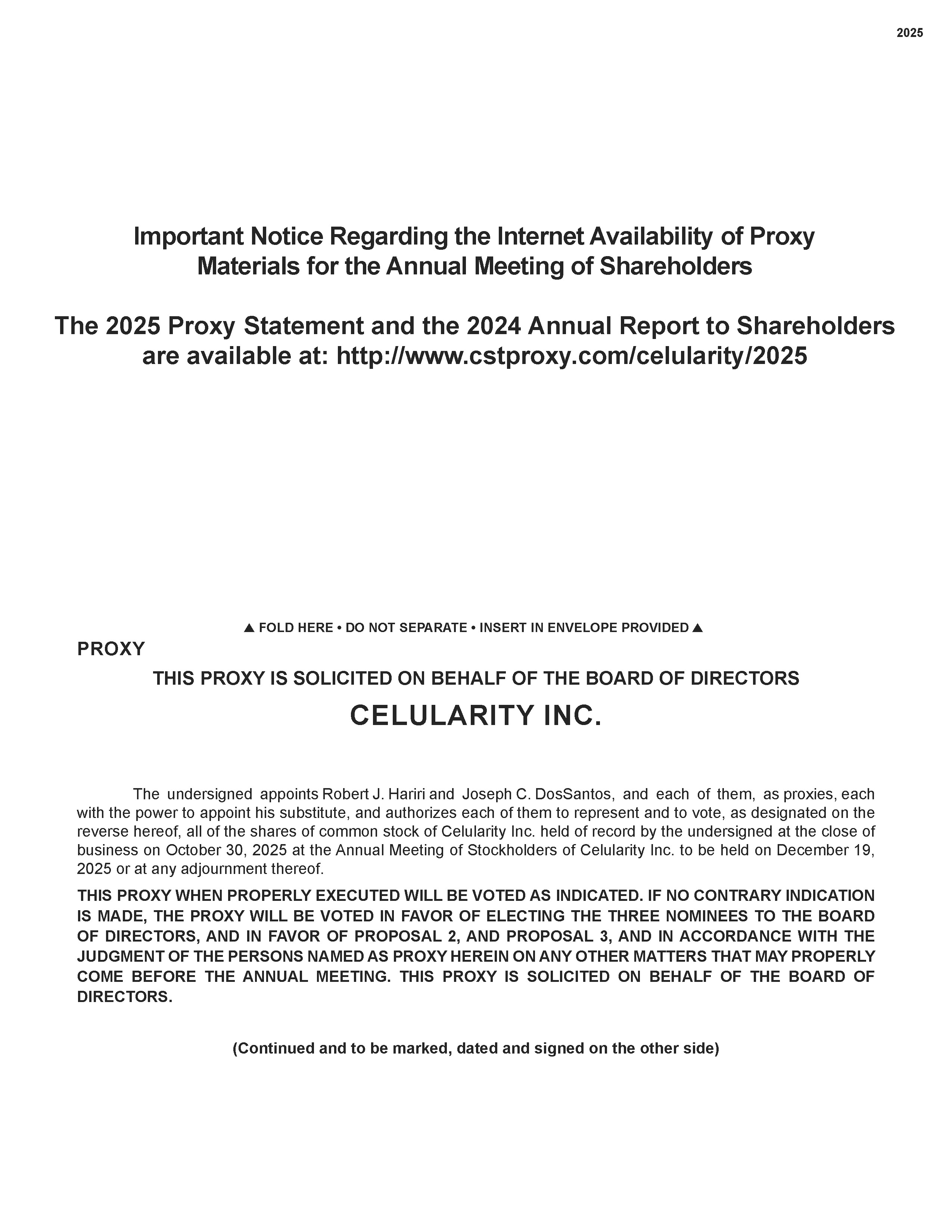 Important Notice Regarding the Availability of Proxy Materials for the Annual Stockholders’ Meeting to Be Held on December 19, 2025 at 9:00 a.m. Eastern Time at Celularity’s headquarters located at 170 Park Avenue, Florham Park, New Jersey 07932.