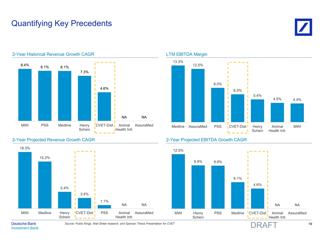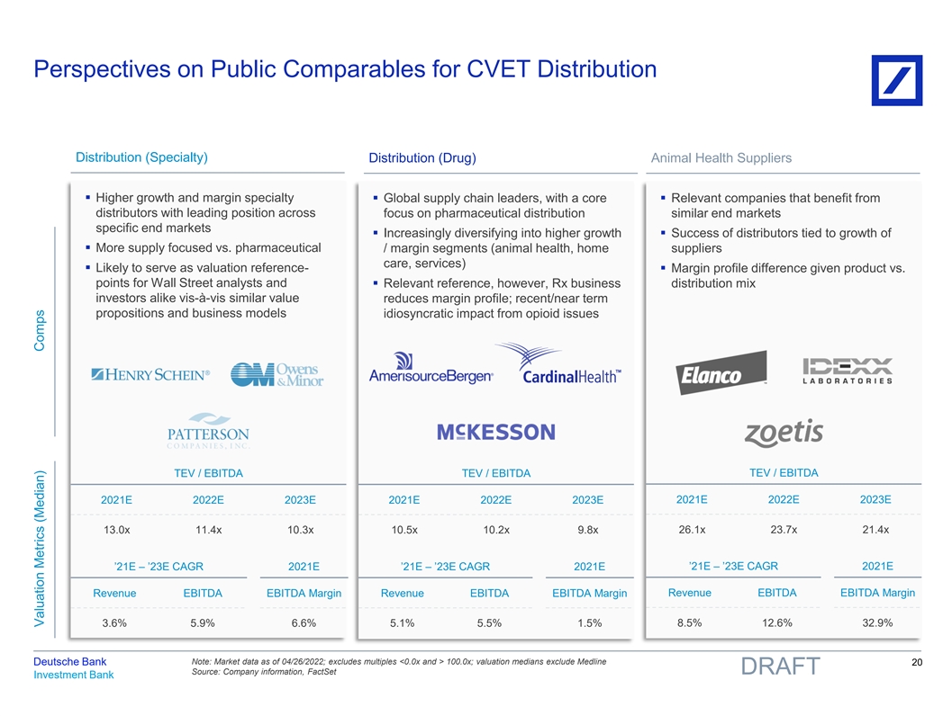 Quantifying Key Precedents 2-Year Historical Revenue Growth CAGR LTM EBITDA Margin 13.3% 8.4% 12.5% 8.1% 8.1% 7.3% 8.0% 4.6% 6.5% 5.4% 4.5% 4.4% NA NA MWI PSS Medline Henry CVET-Dist Animal AssuraMed Medline AssuraMed PSS CVET-Dist Henry Animal MWI Schein Health Intl. Schein Health Intl. 2-Year Projected Revenue Growth CAGR 2-Year Projected EBITDA Growth CAGR 18.3% 12.5% 15.2% 9.9% 9.8% 6.1% 4.6% 5.4% 3.4% 1.1% NA NA NA NA MWI Medline Henry CVET-Dist PSS Animal AssuraMed MWI Henry PSS Medline CVET-Dist Animal AssuraMed Schein Health Intl. Schein Health Intl. Source: Public filings, Wall Street research, and Sponsor Thesis Presentation for CVET Deutsche Bank 19 DRAFT Investment Bank 81nidZpGqzkSDMpD